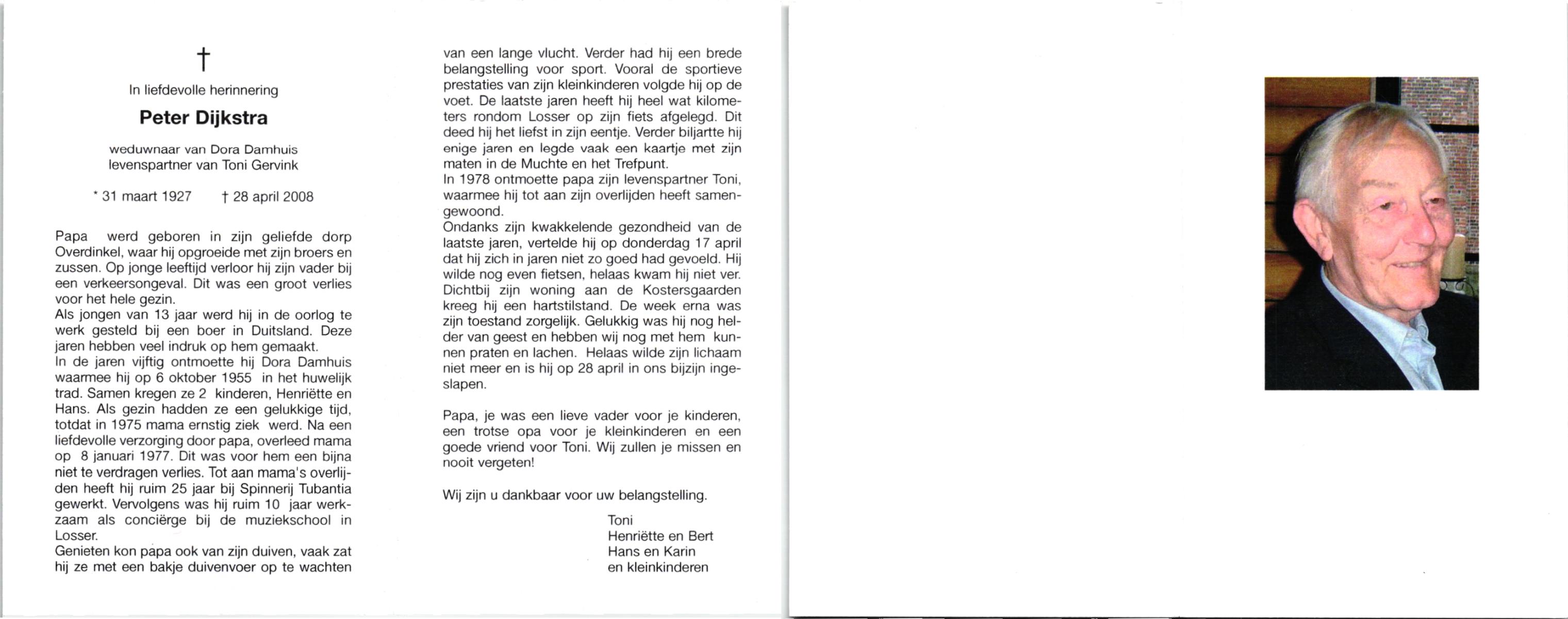 DIJKSTRA, , Peter, geboren op 31-3-1927 te Overdinkel, overleden op 28-4-2008 op 81-jarige leeftijd.