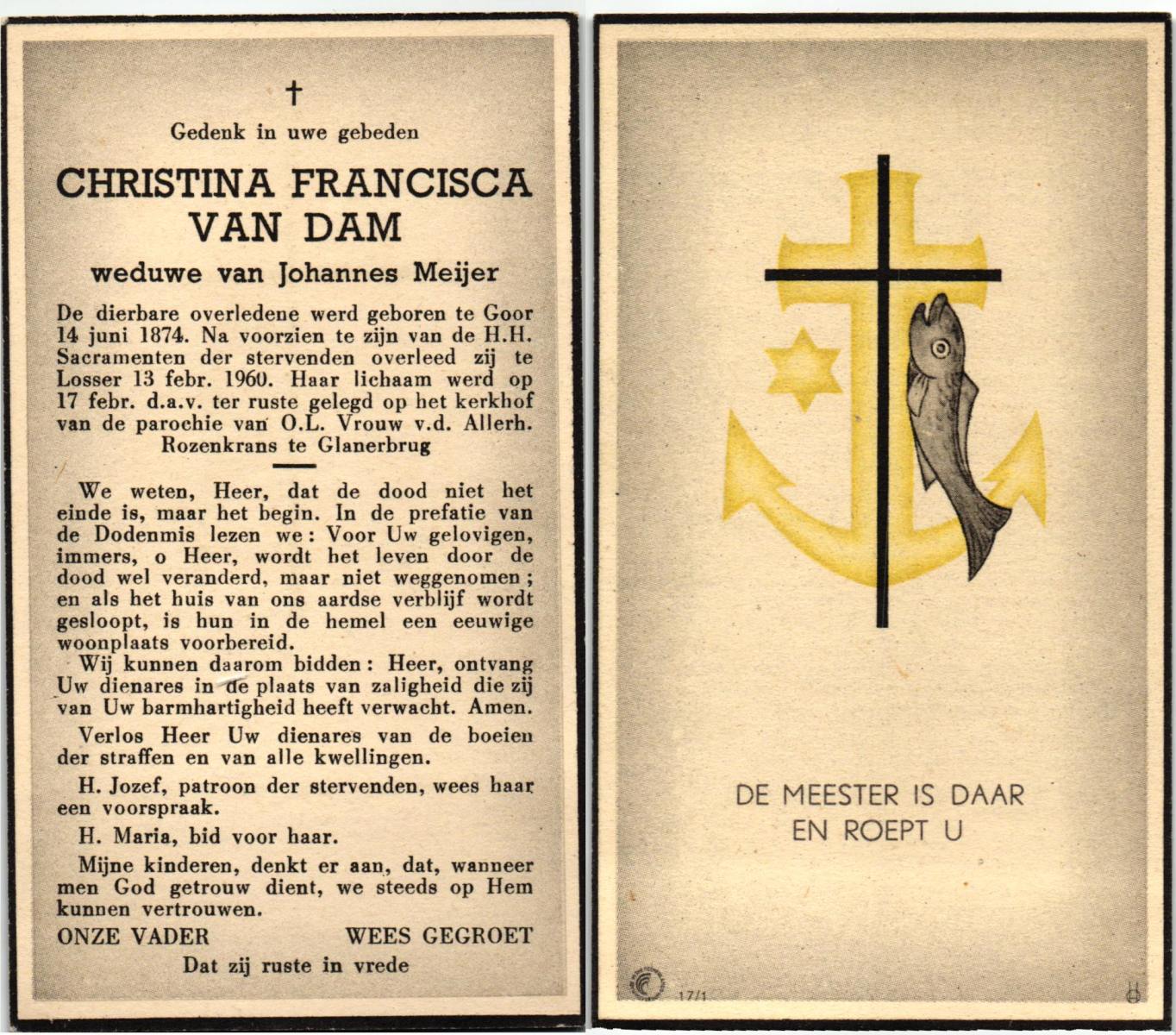 DAM, van, Christina Francisca, geboren op 14-06-1874 te Goor, overleden op 13-2-1960 te Losser op 85-jarige leeftijd, begraven op 17-2-1960 te Glanerbrug.