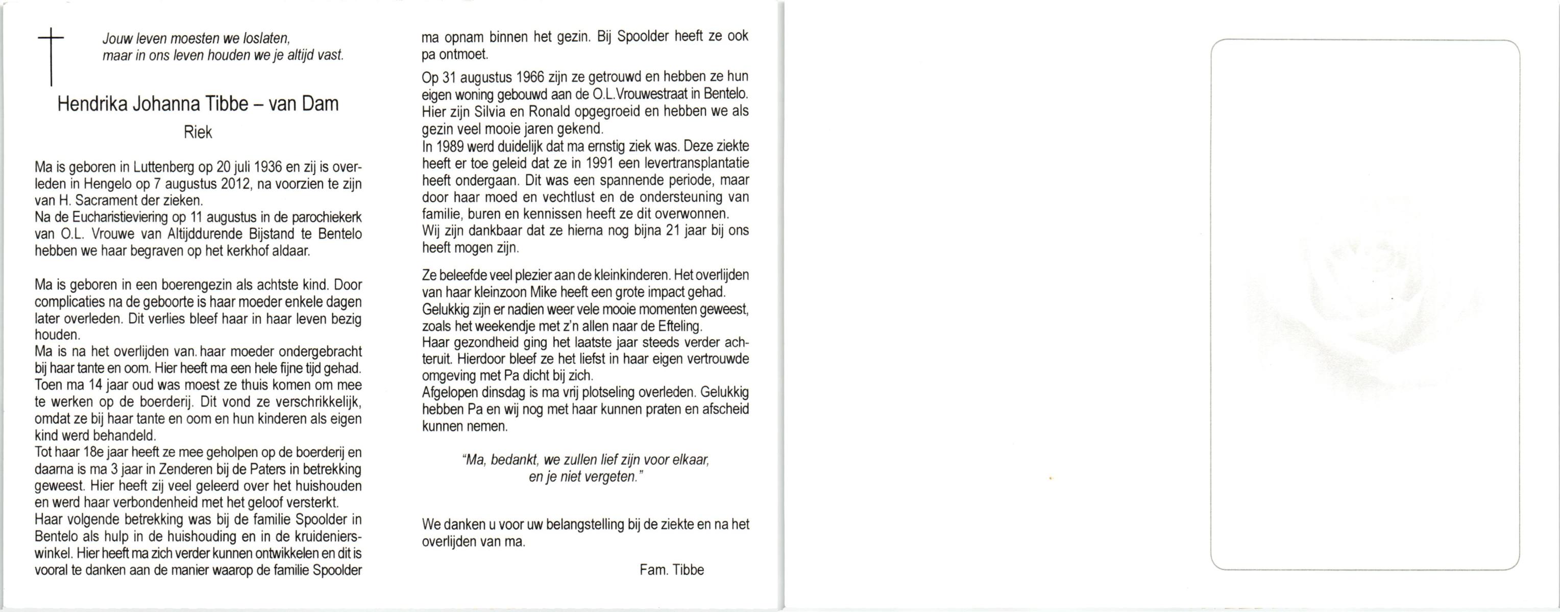 DAM, van, Hendrika Johanna, geboren op 20-7-1936 te Raalte, Luttenberg, overleden op 7-8-2012 te Hengelo op 76-jarige leeftijd, begraven op 11-8-2012 te Bentelo.