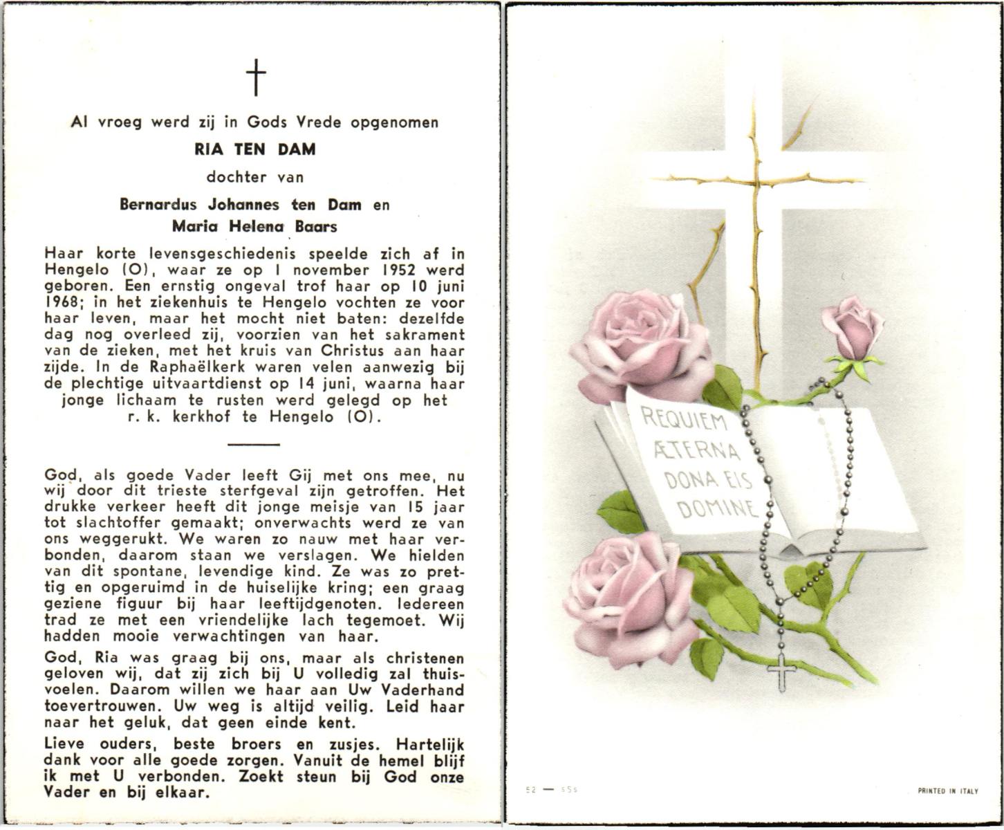 DAM, ten, Ria, geboren op 1-11-1952 te Hengelo, overleden op 10-6-1968 te Hengelo, ziekenhuis op 14-jarige leeftijd, begraven op 14-6-1968 te Hengelo.