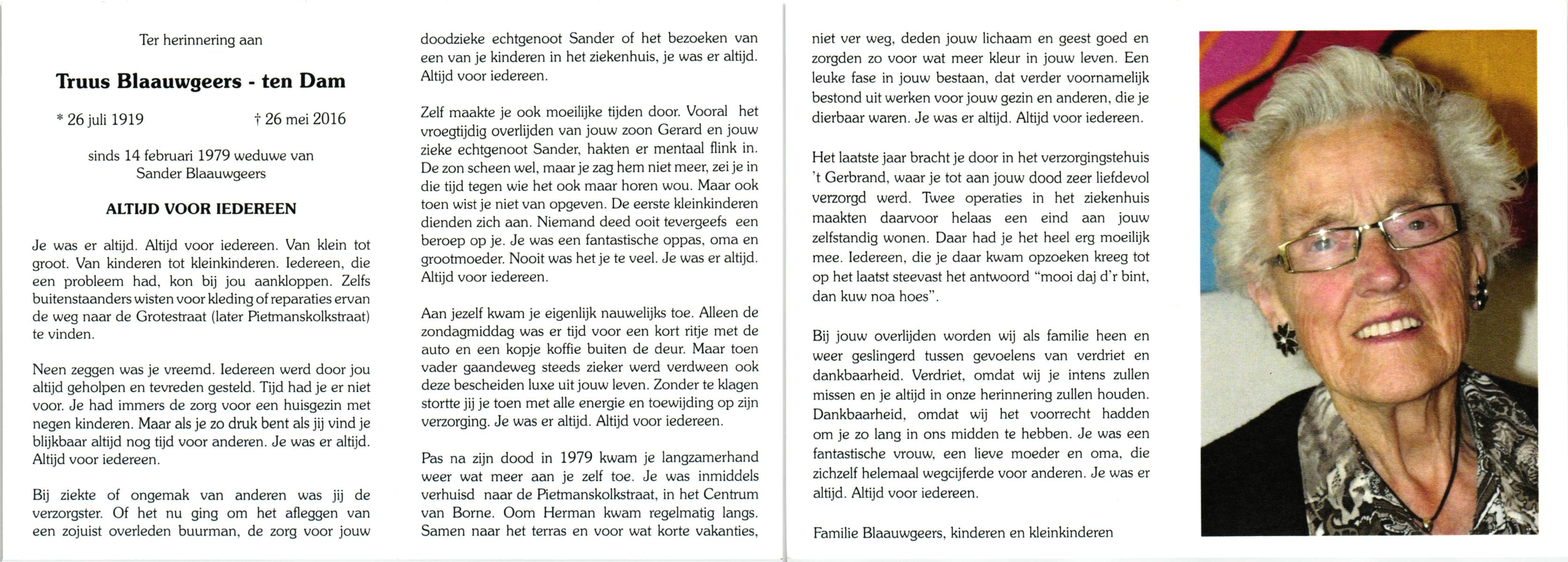 DAM, ten, Truus, geboren op 26-7-1919, overleden op 26-5-2016 op 96-jarige leeftijd.