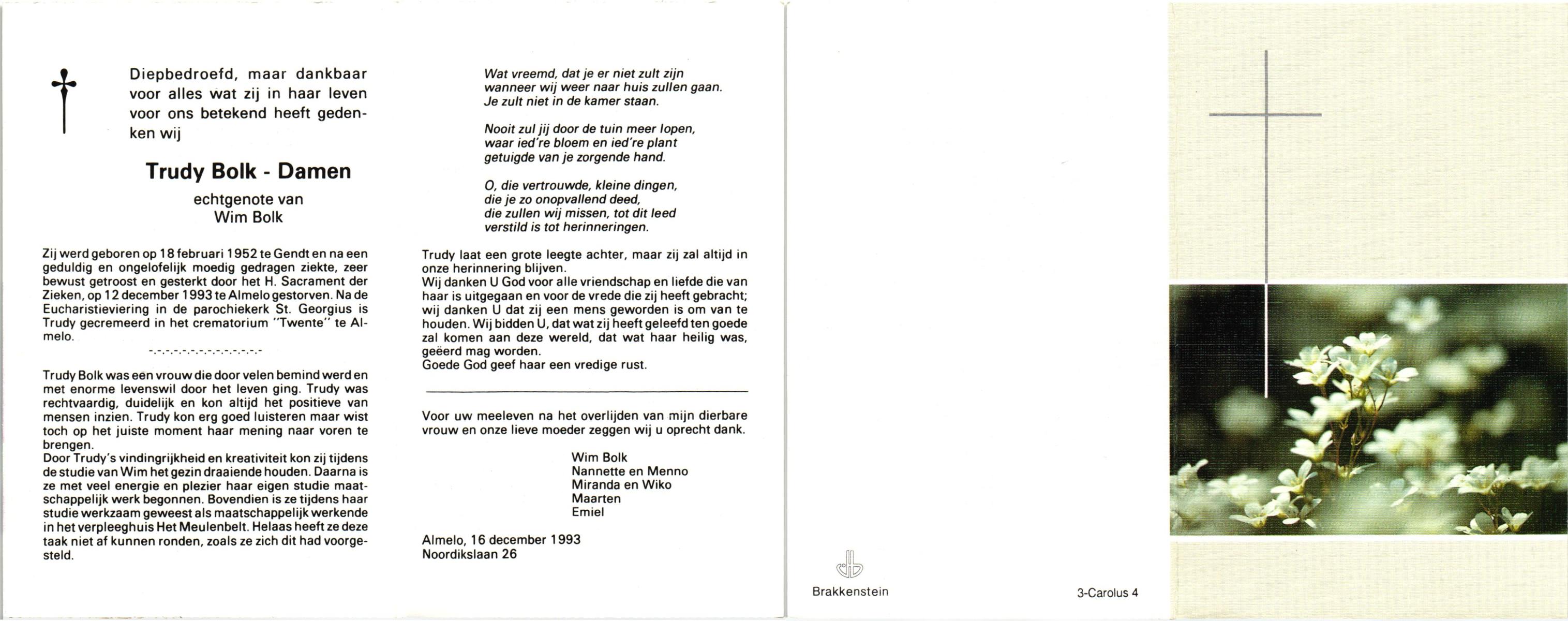 DAMEN, Trudy, geboren op 18-2-1952 te Gendt, overleden op 12-12-1993 te Almelo op 41-jarige leeftijd, gecremeerd te Almelo.