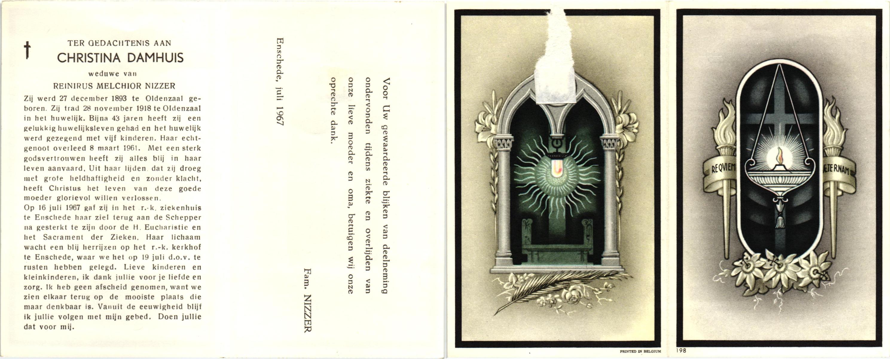 DAMHUIS, Christina, geboren op 27-12-1893 te Oldenzaal, overleden op 16-7-1967 te Enschede, ziekenhuis op 73-jarige leeftijd, begraven op 19-7-1967 te Enschede.