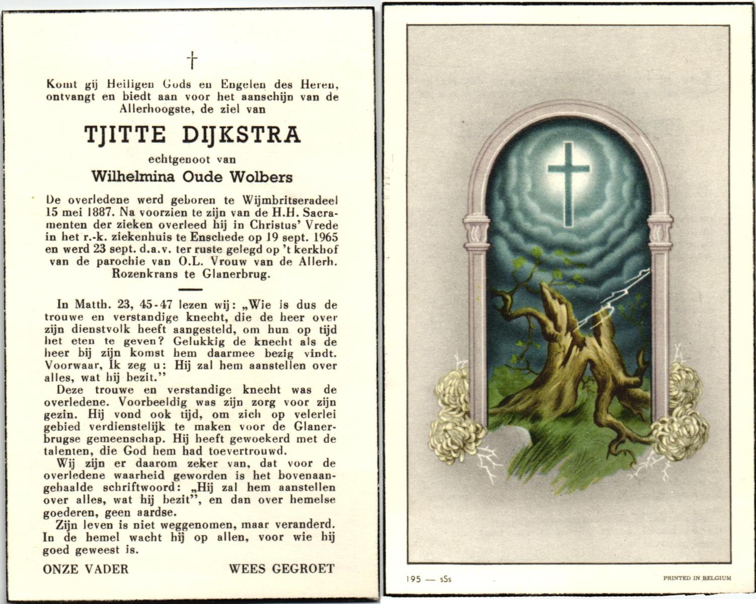 DIJKSTRA, Tjitte, geboren op 15-05-1887 te Wijmbritseradeel, overleden op 19-9-1965 te Enschede, ziekenhuis op 88-jarige leeftijd, begraven op 23-9-1965 te Glanerbrug.