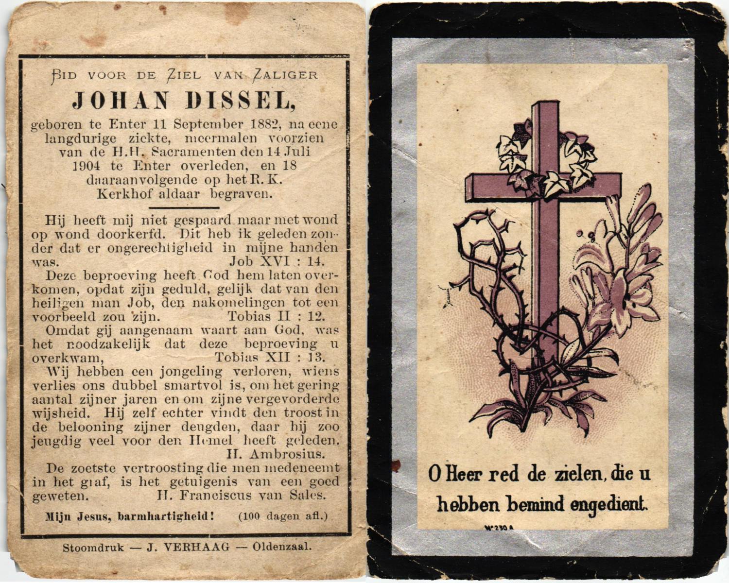 DISSEL, Johan, geboren op 11-09-1882 te Wierden, Enter, overleden op 14-7-1904 te Wierden, Enter op 21-jarige leeftijd, begraven op 18-7-1904 te Wierden, Enter.
