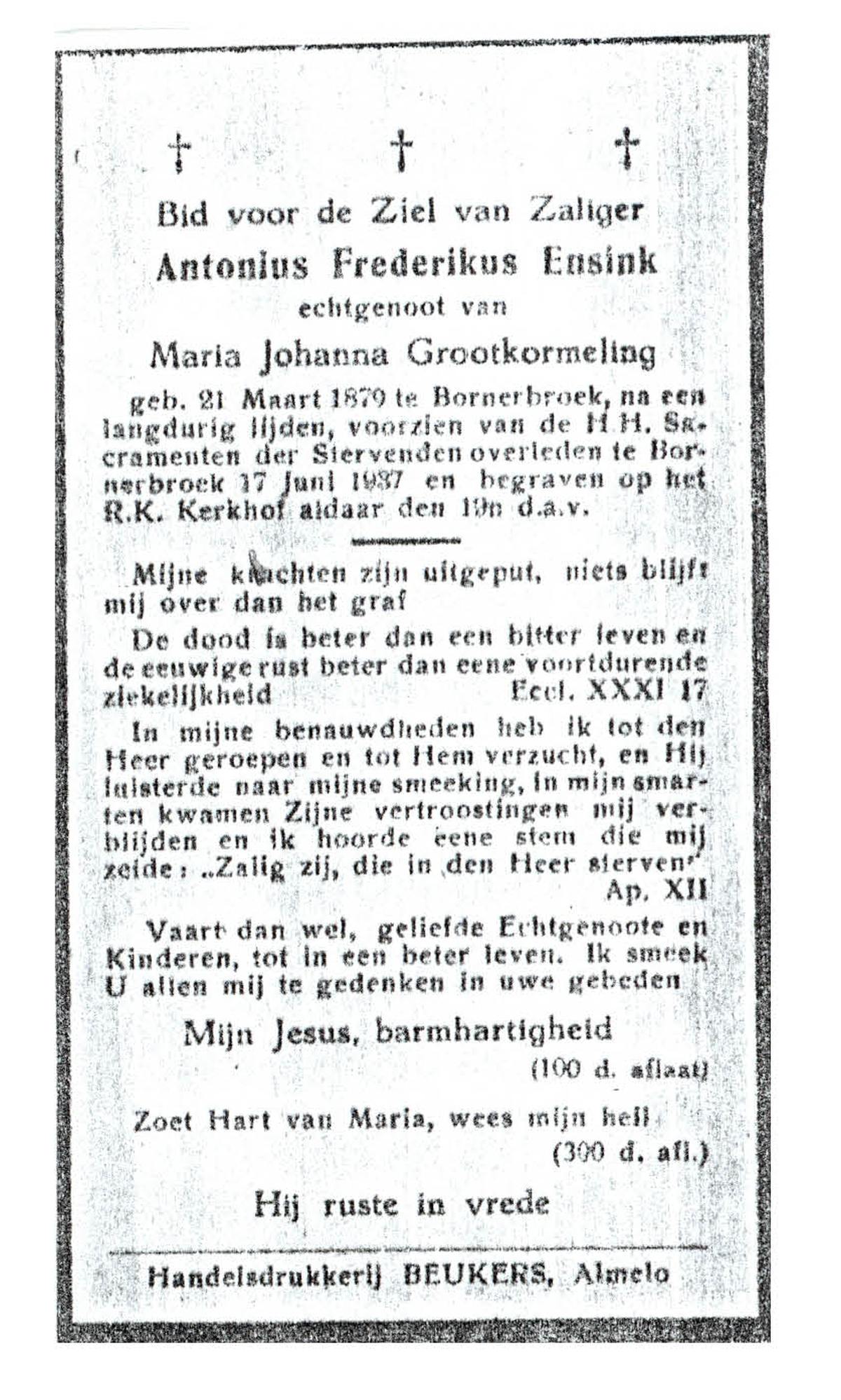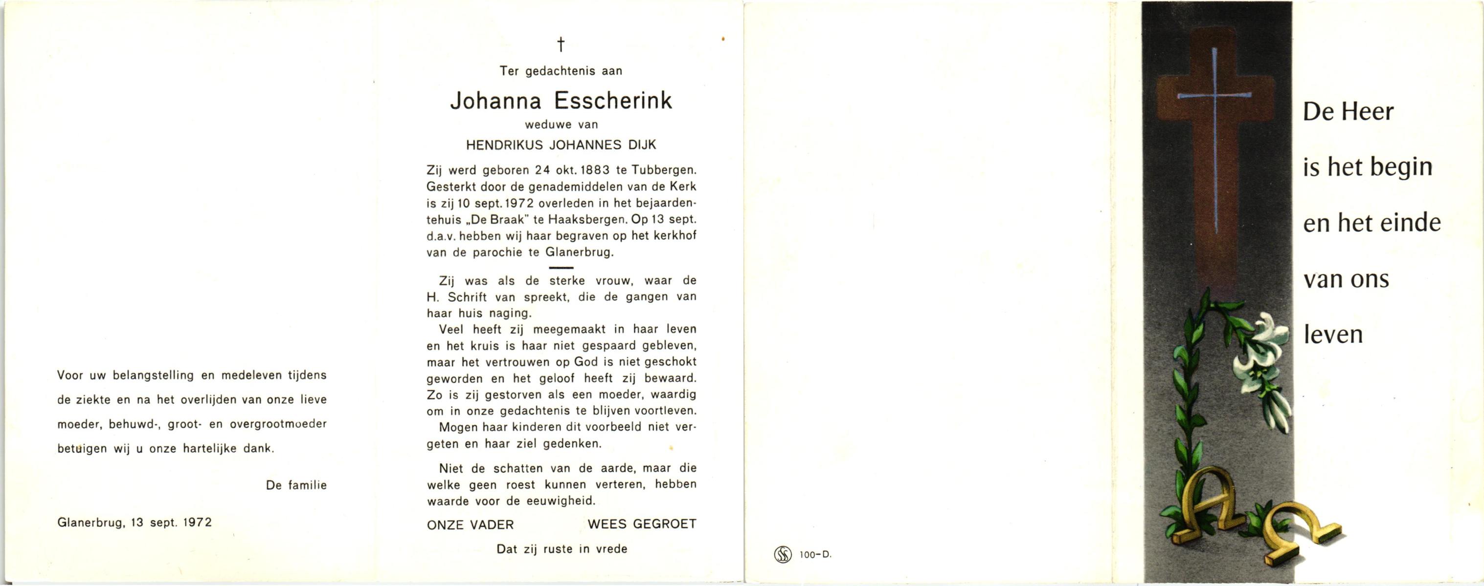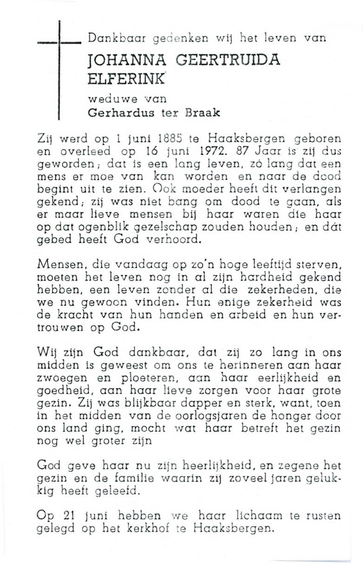 ELFERINK, Johanna Geertruida, geboren op 01-06-1885 te Haaksbergen, overleden op 16-6-1972 op 87-jarige leeftijd, begraven op 21-6-1972 te Haaksbergen.