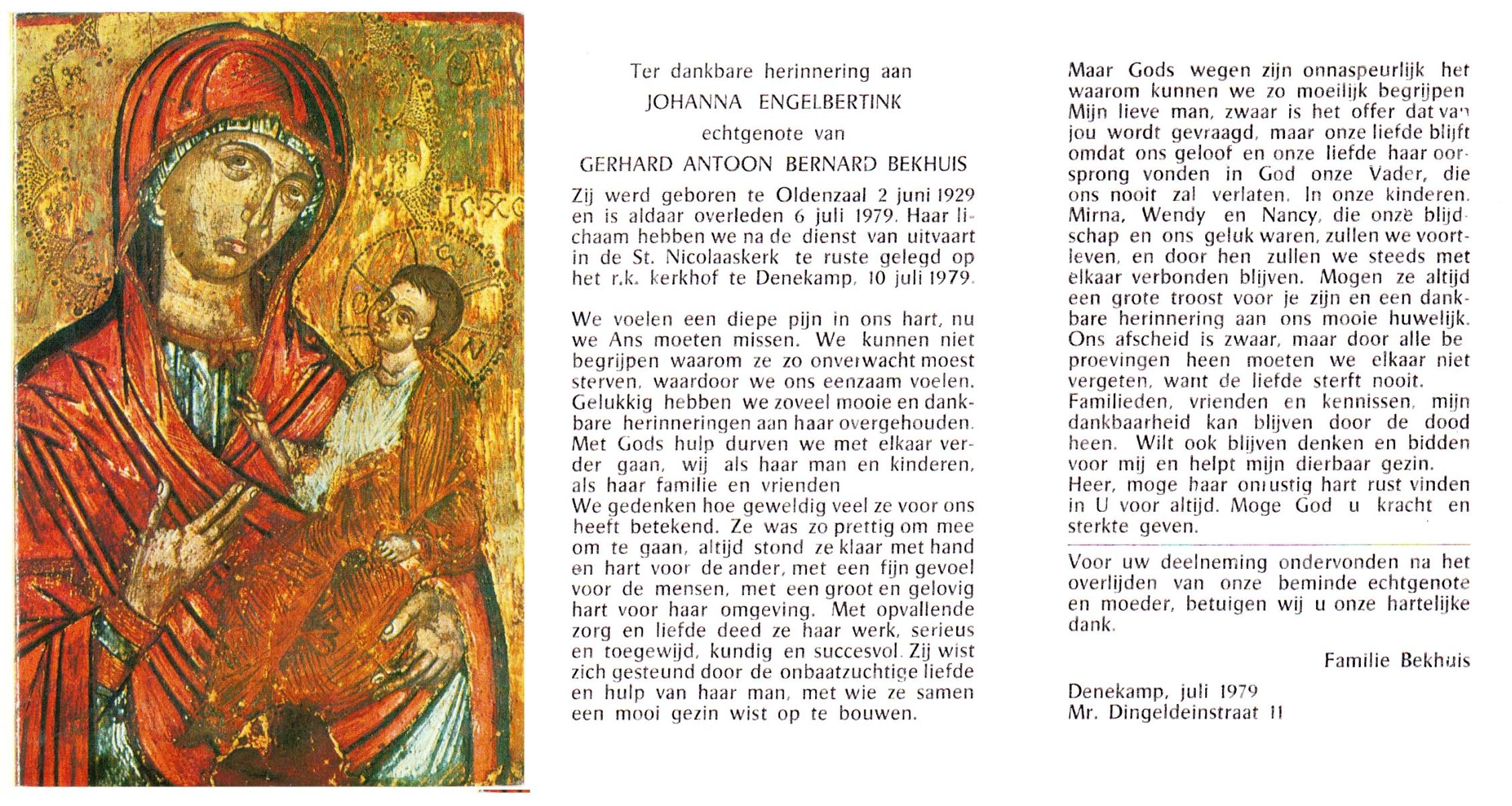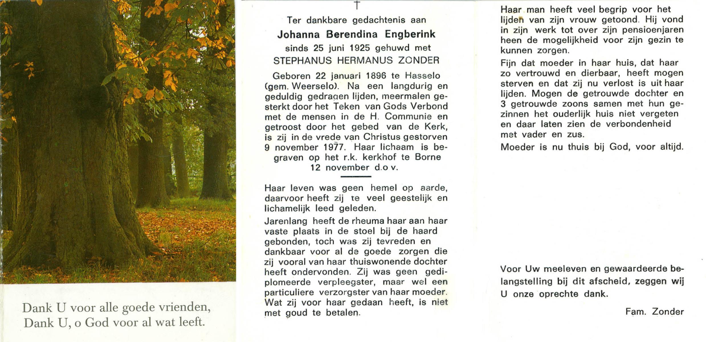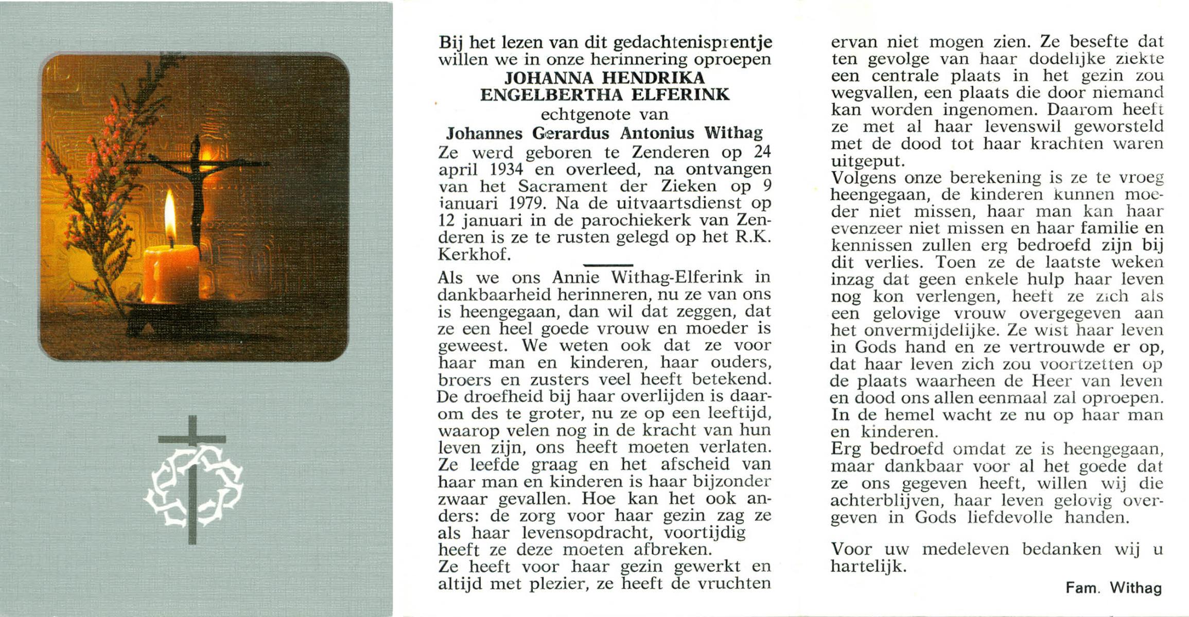 ELFERINK, Johanna Hendrika Engelbertha, geboren op 24-4-1934 te Zenderen, overleden op 9-1-1979 op 44-jarige leeftijd, begraven op 12-1-1979 te Zenderen.