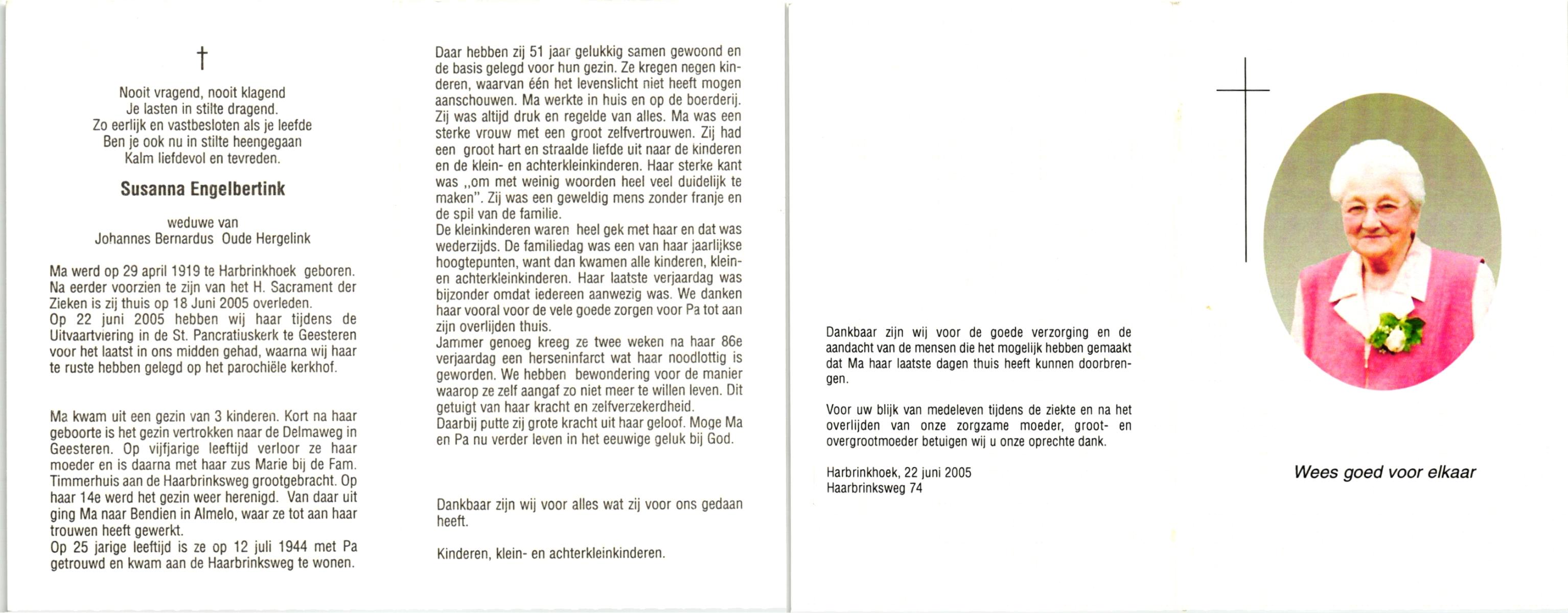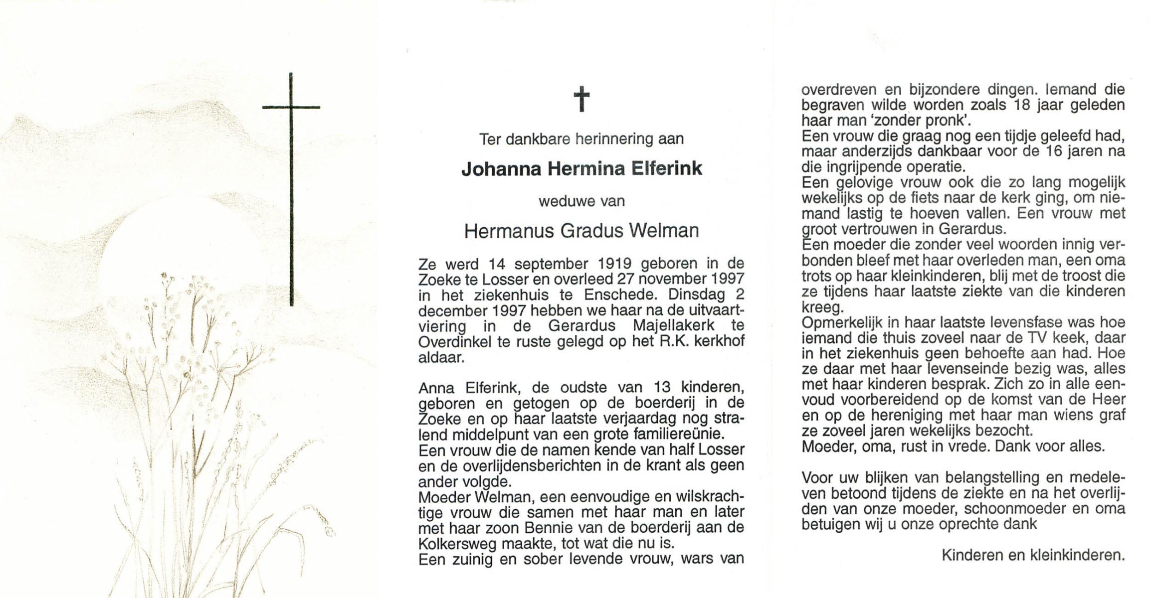 ELFERINK, Johanna Hermina, geboren op 14-9-1919 te Losser, overleden op 27-11-1997 te Enschede op 78-jarige leeftijd, begraven op 2-12-1997 te Overdinkel.