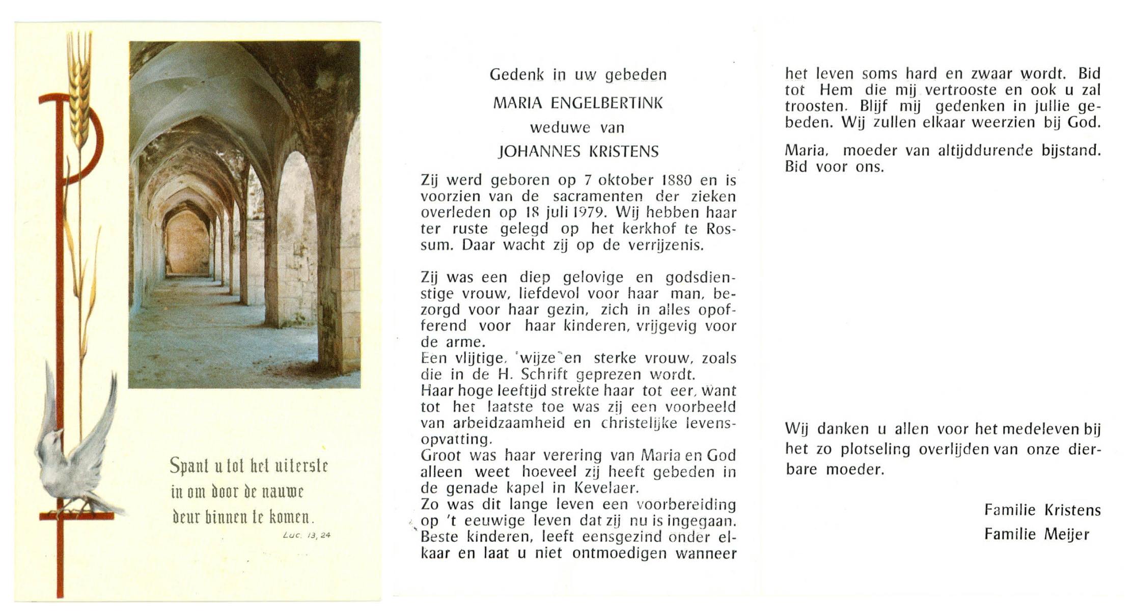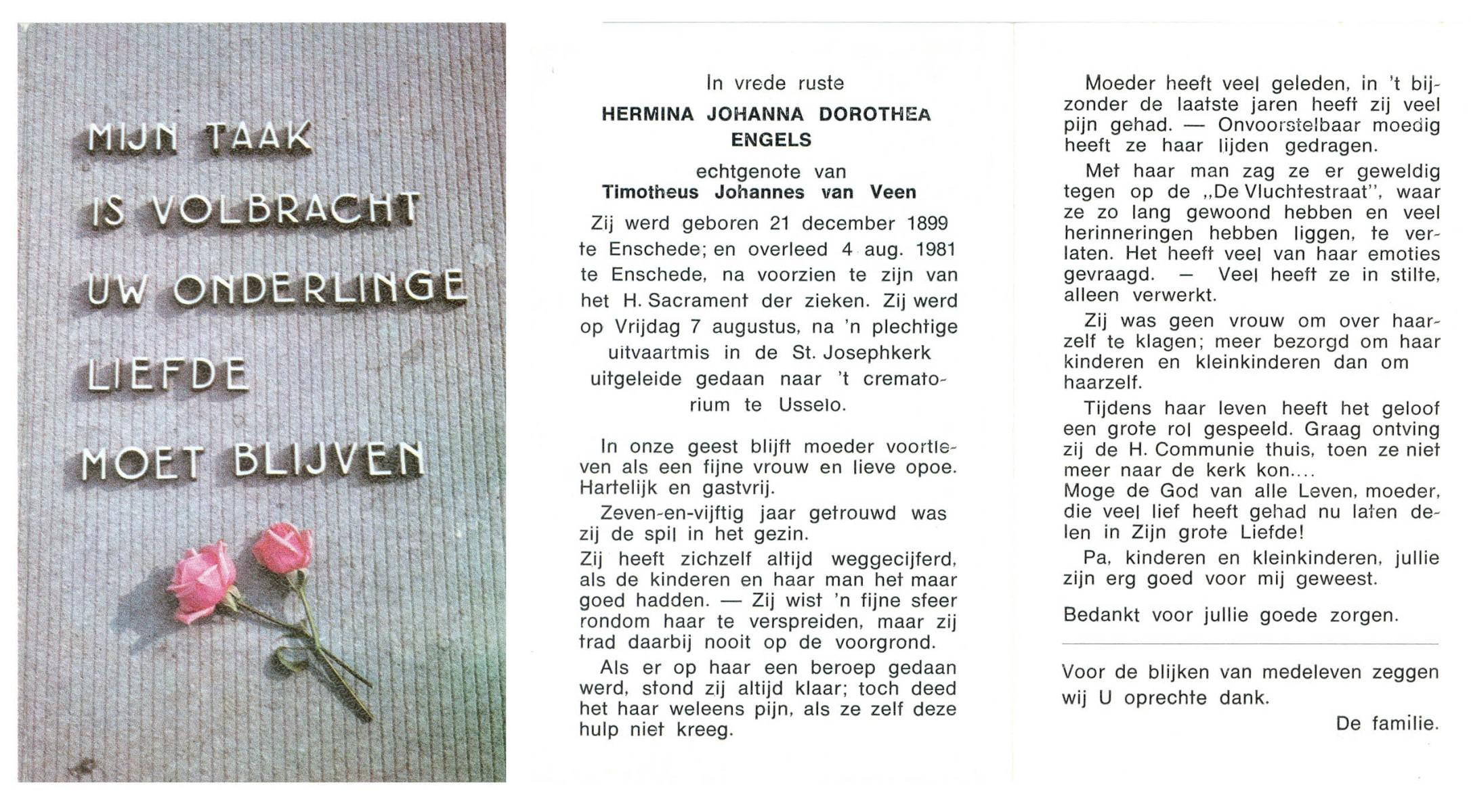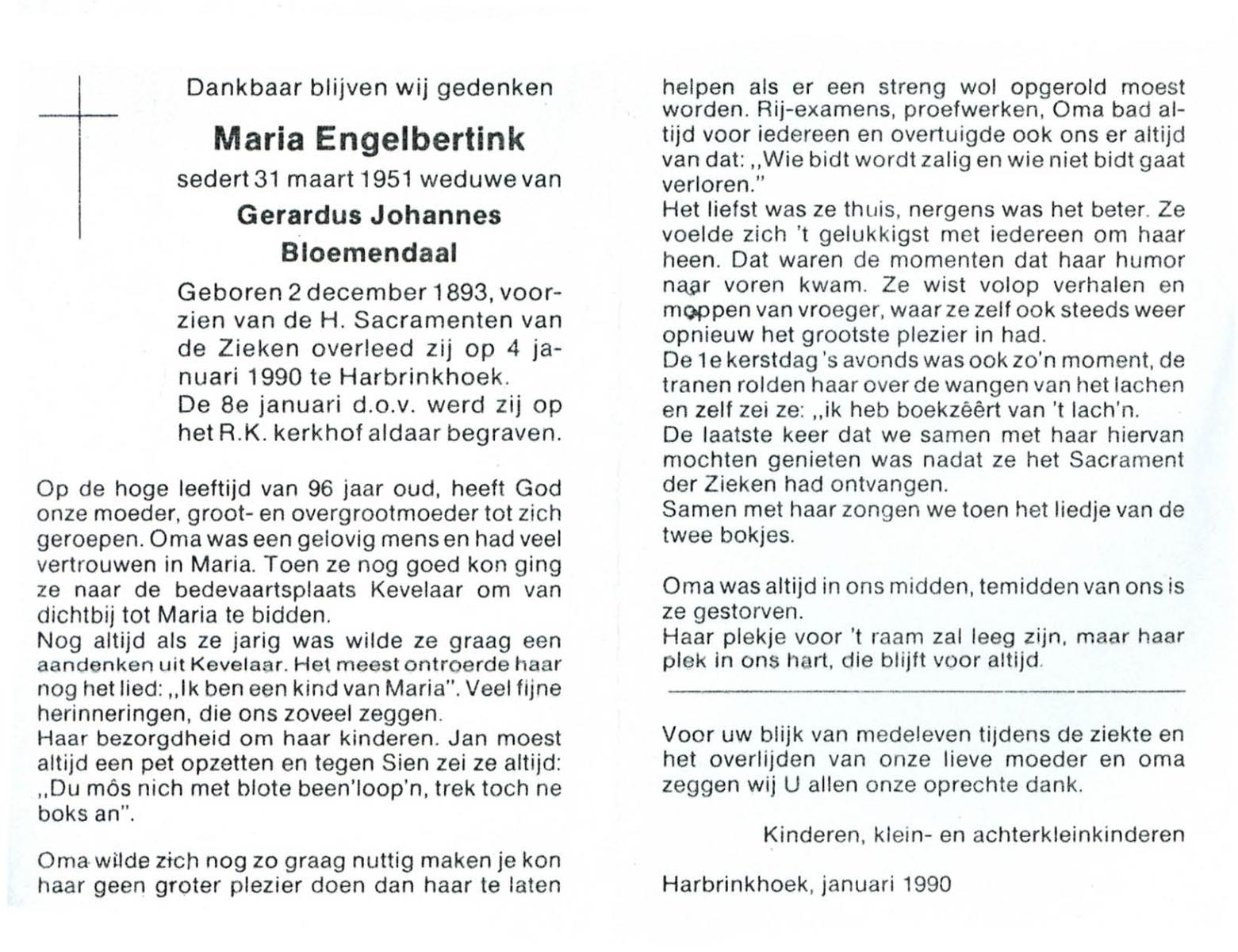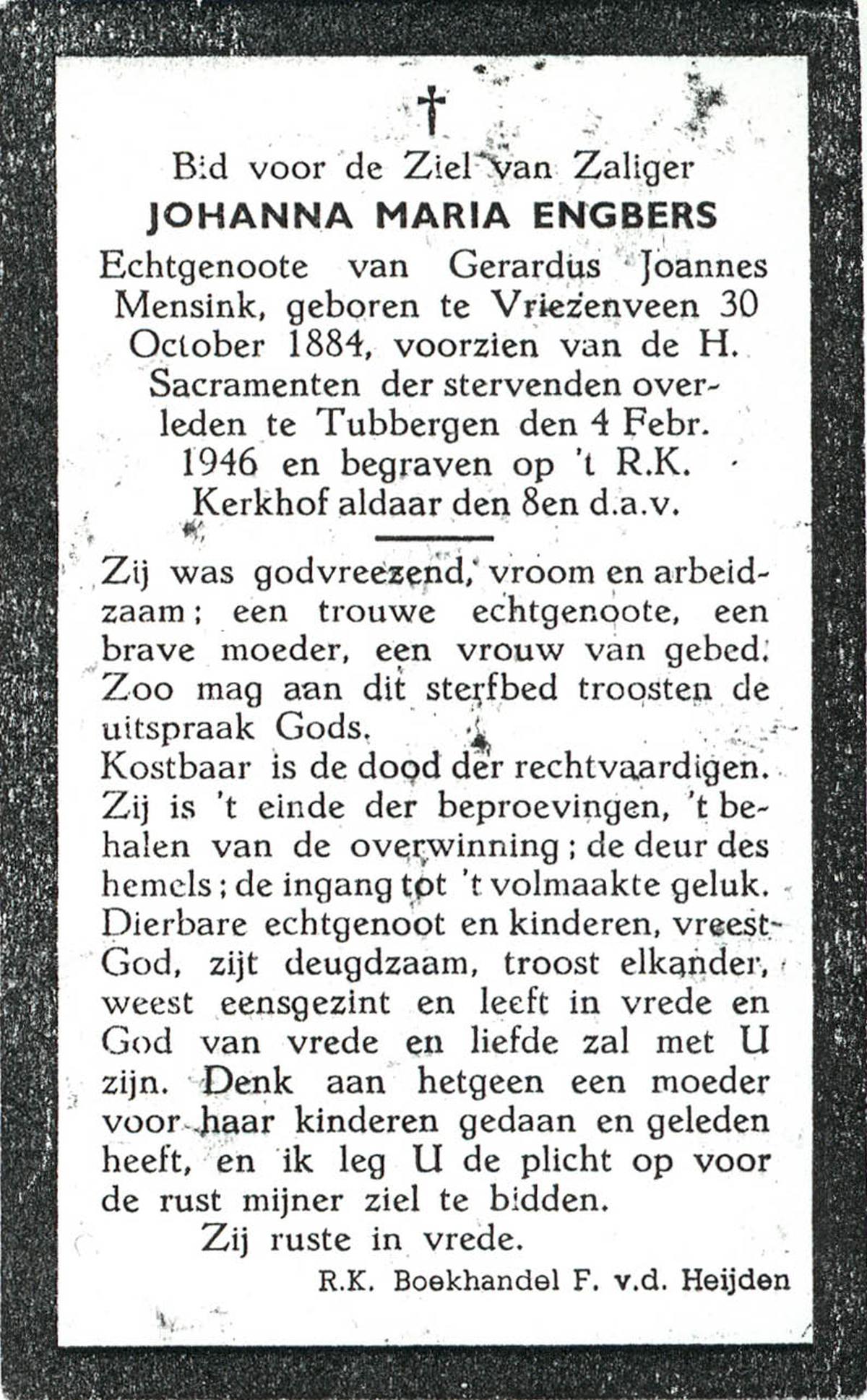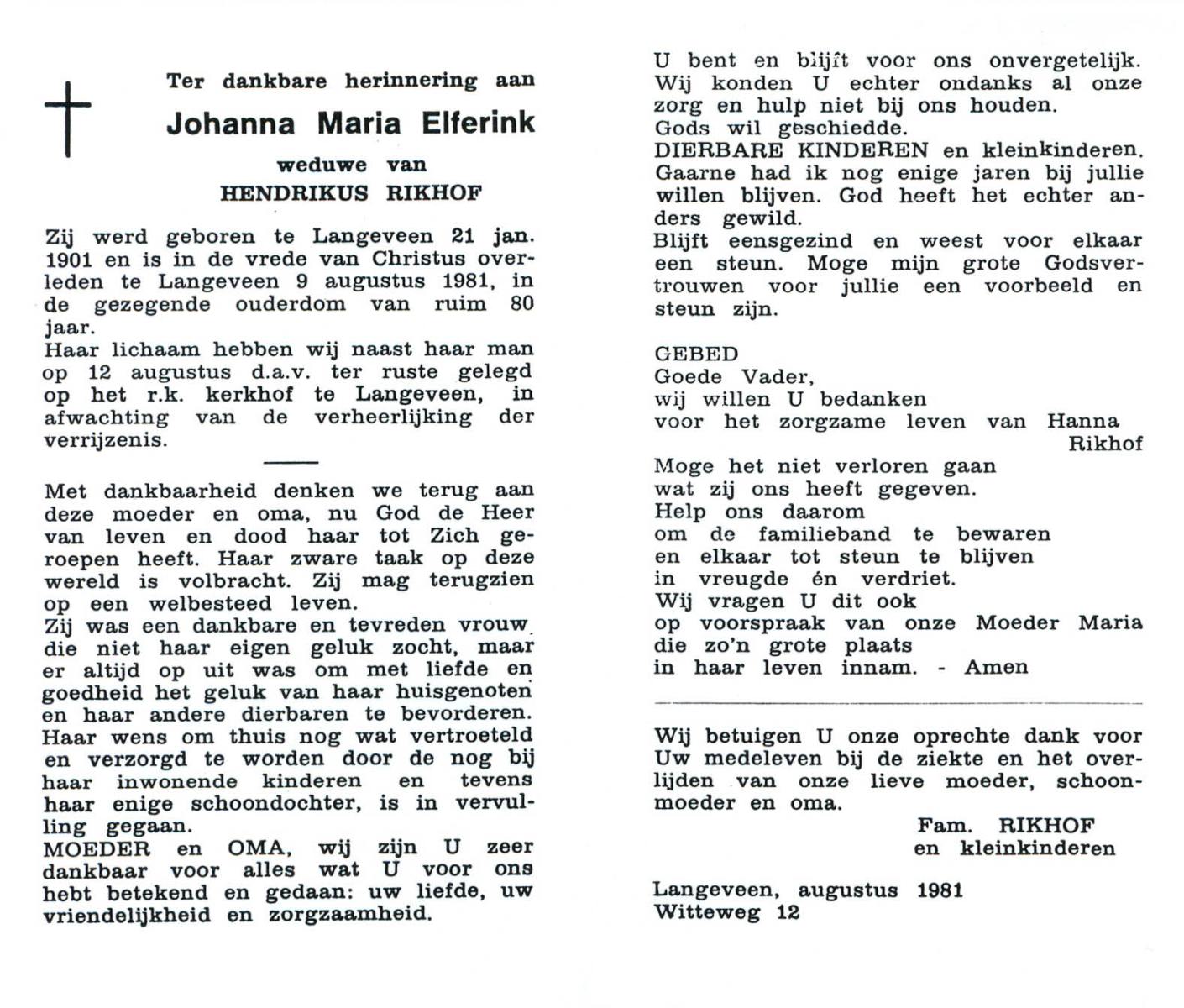 ELFERINK, Johanna Maria, geboren op 21-1-1901 te Langeveen, overleden op 9-8-1981 te Langeveen op 80-jarige leeftijd, begraven op 12-8-1981 te Langeveen R.K.kerhof.