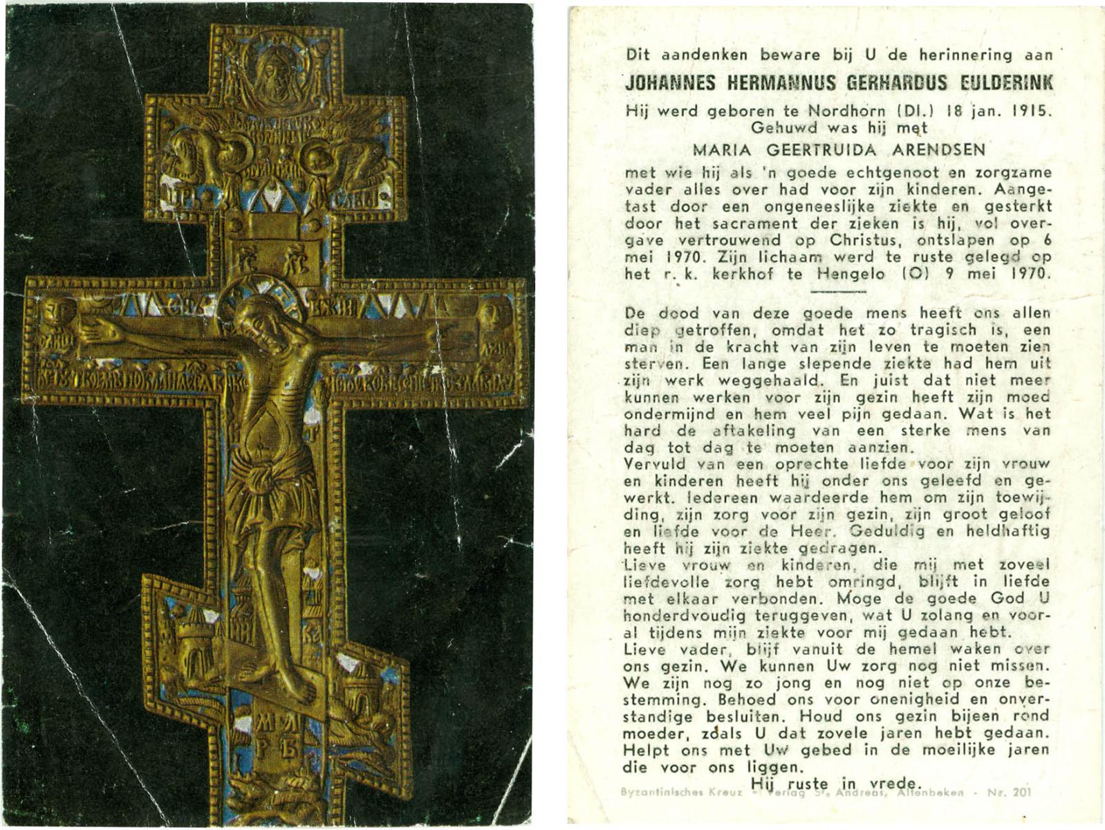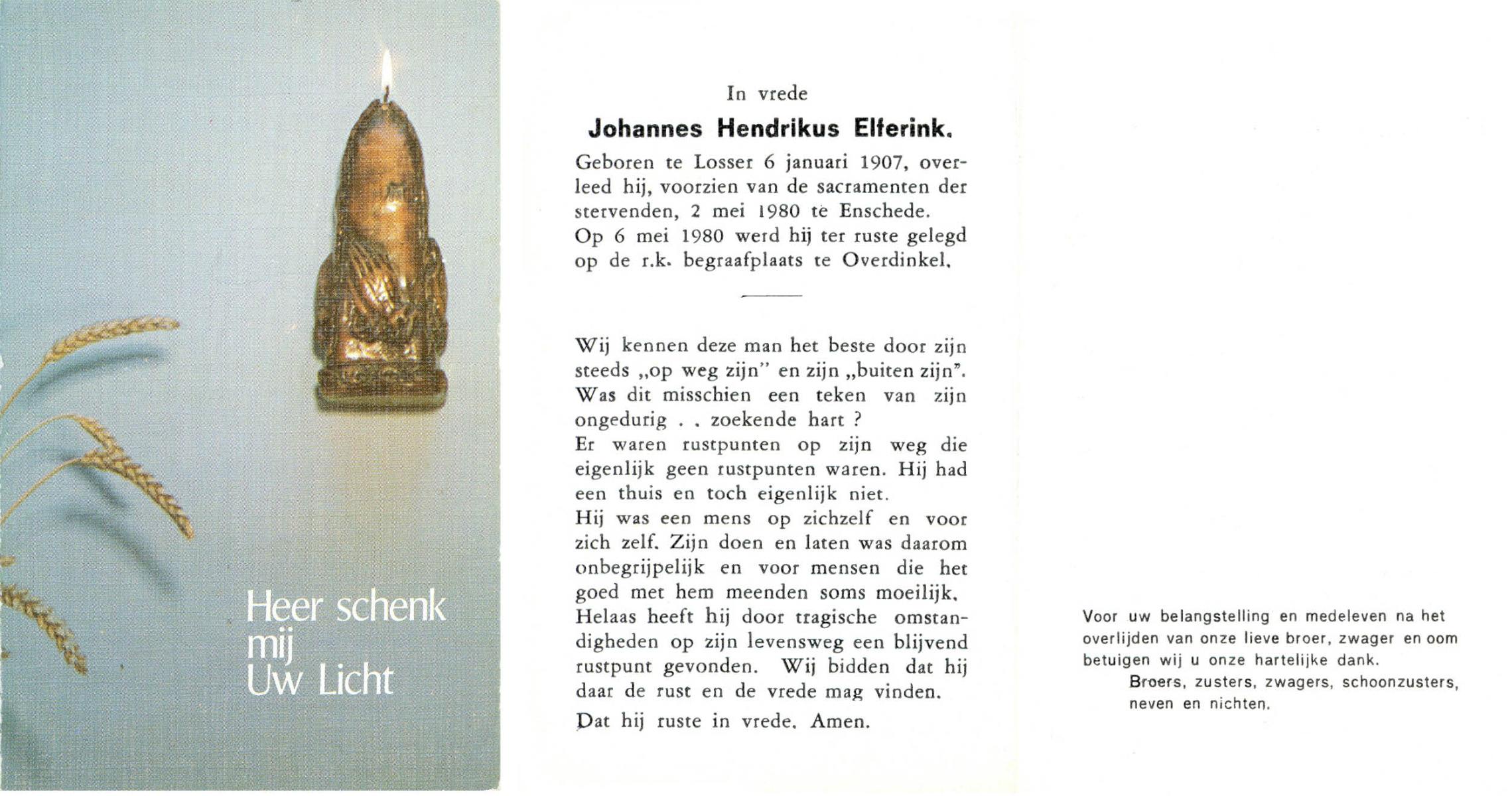 ELFERINK, Johannes Hendrikus, geboren op 6-1-1907 te Losser, overleden op 2-5-1980 te Enschede op 73-jarige leeftijd, begraven op 6-5-1980 te Overdinkel.