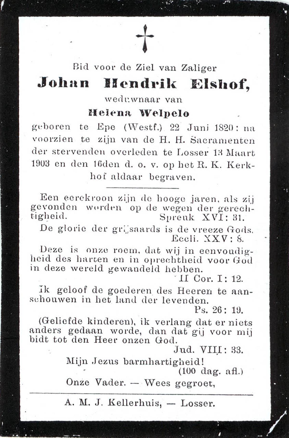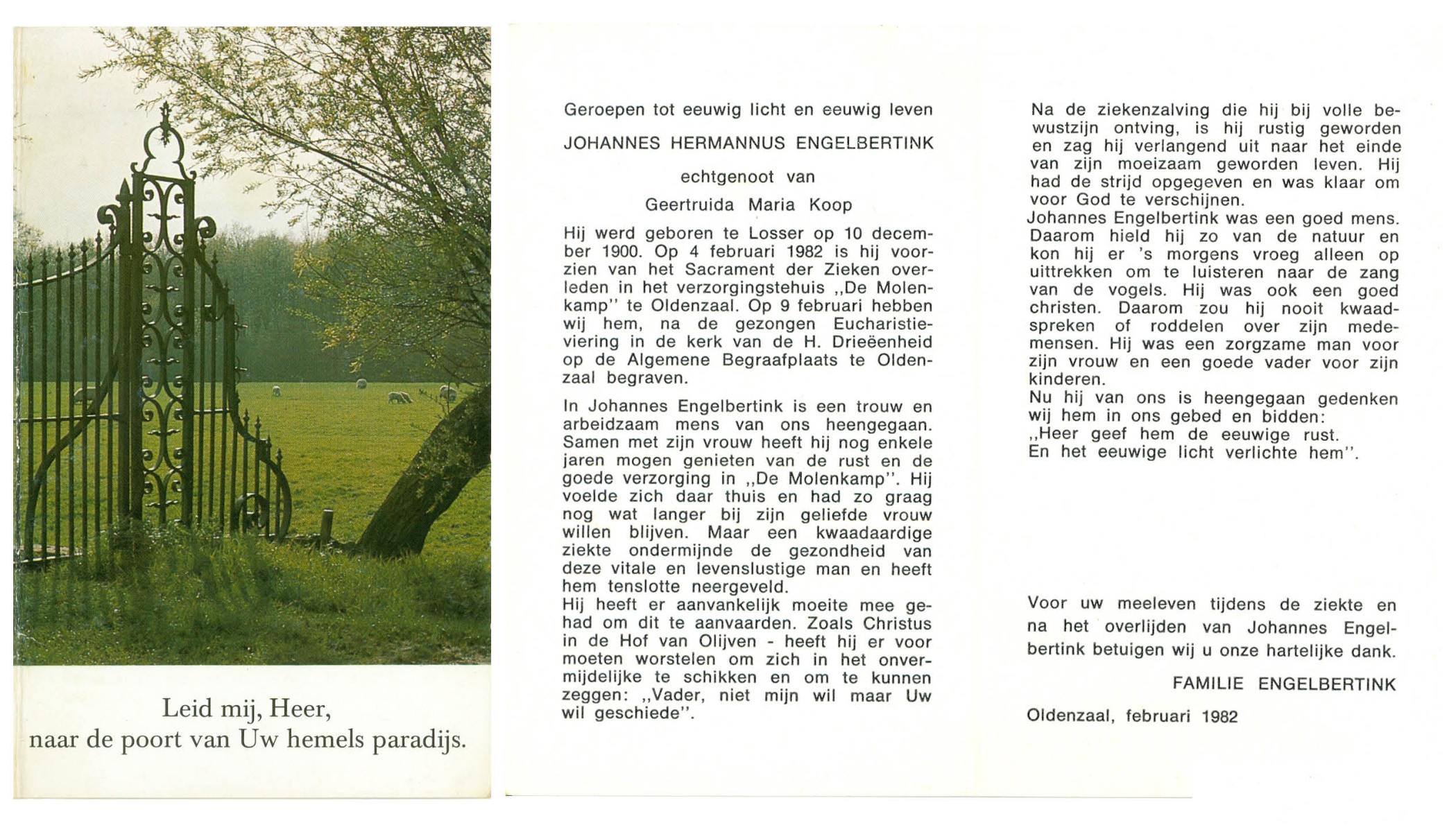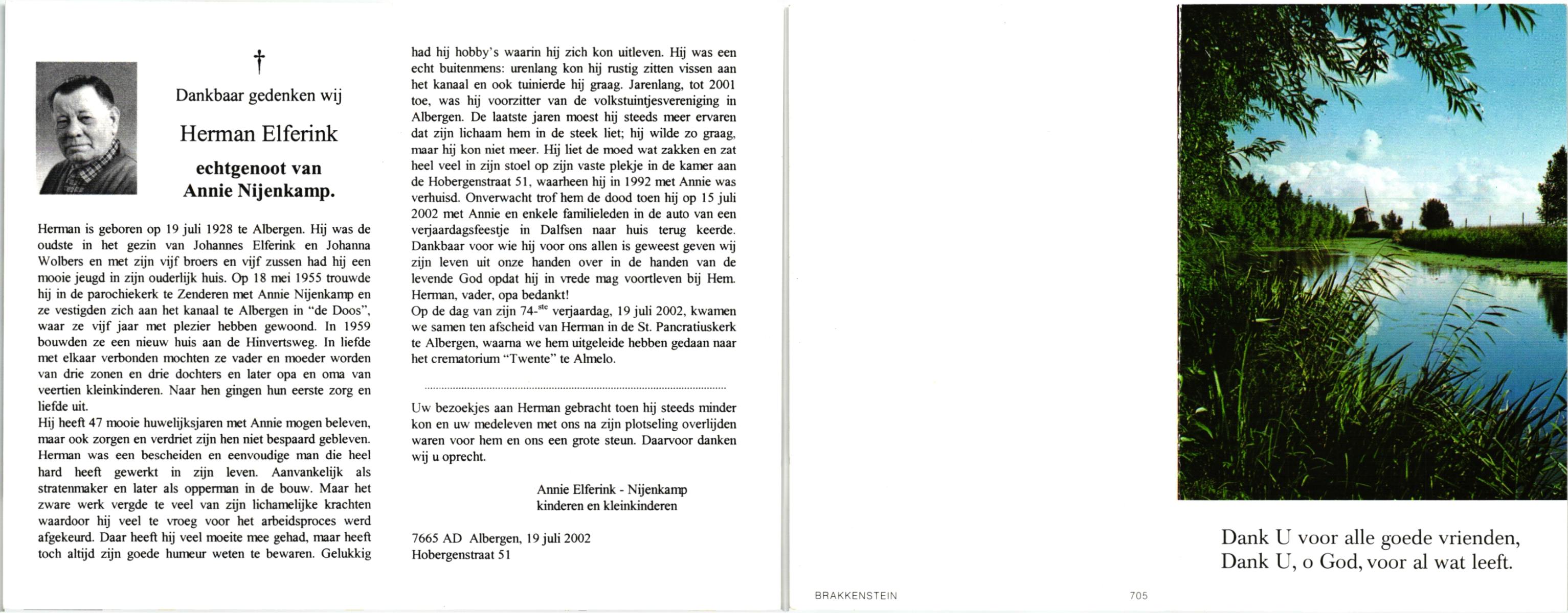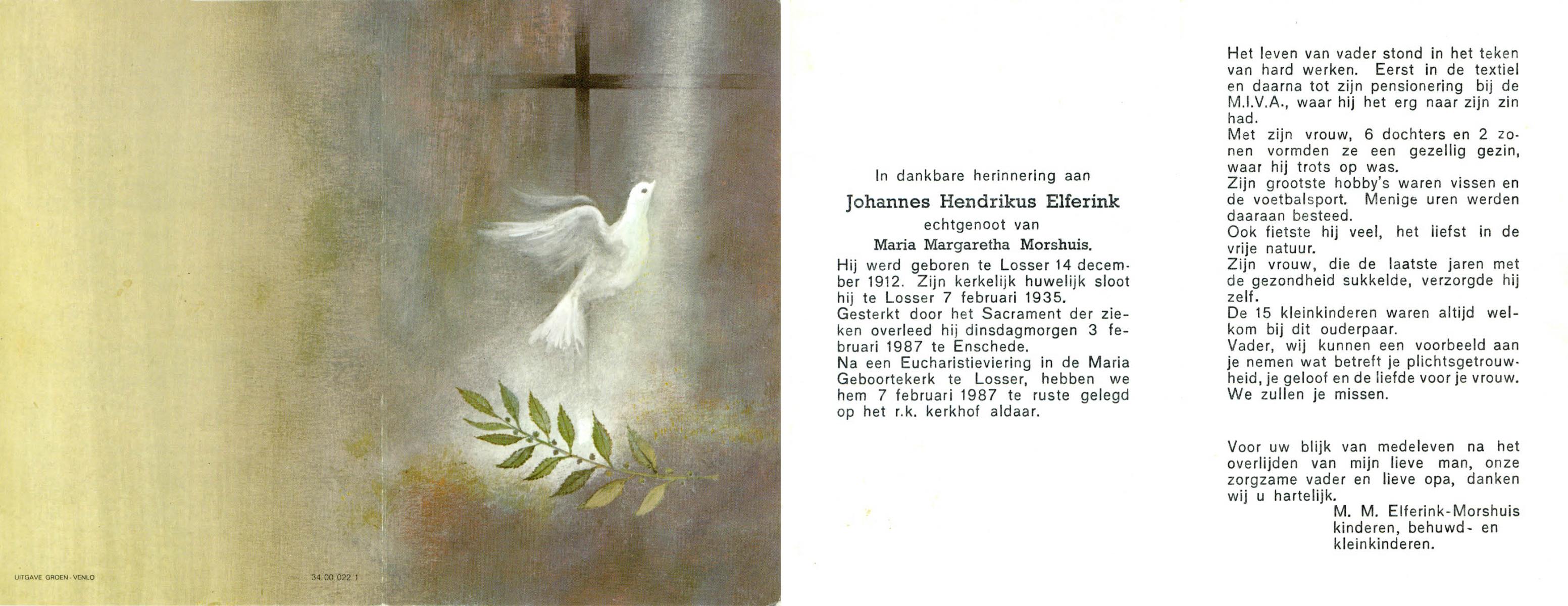ELFERINK, Johannes Hendrikus, geboren op 14-12-1912 te Losser, overleden op 3-2-1987 te Enschede op 74-jarige leeftijd, begraven op 7-2-1987 te Losser.
