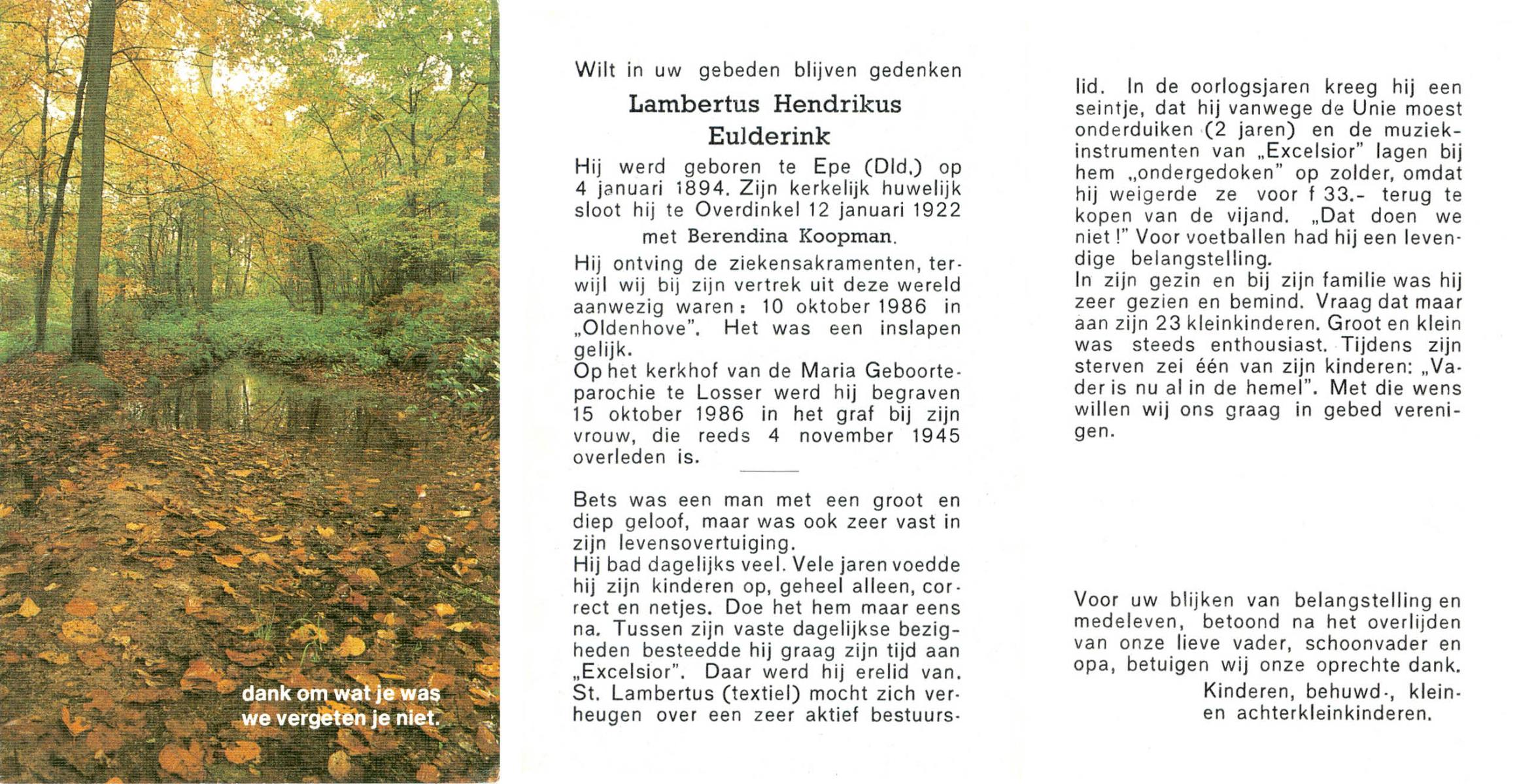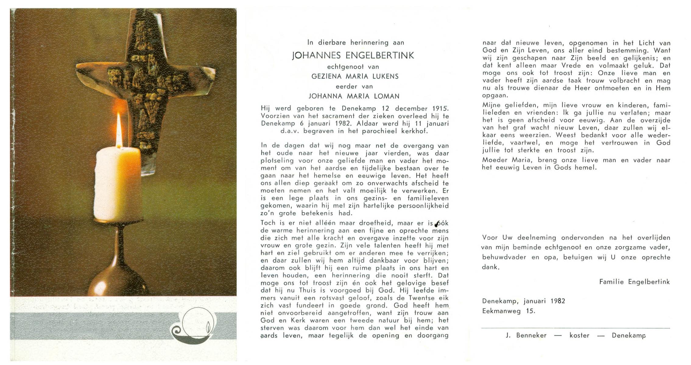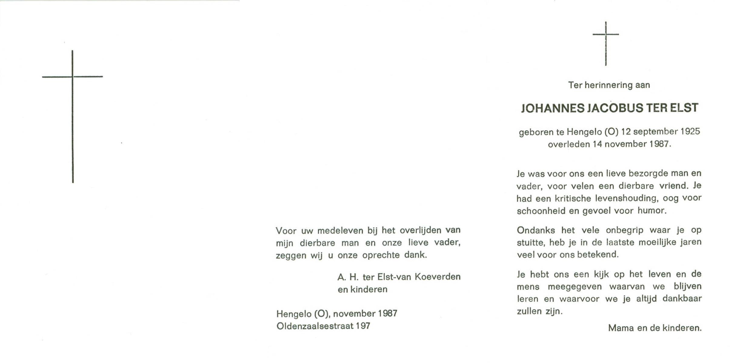ELFERINK, Johannes Hendrikus, geboren op 14-12-1912 te Losser, overleden op 3-2-1987 te Enschede op 74-jarige leeftijd, begraven op 7-2-1987 te Losser.