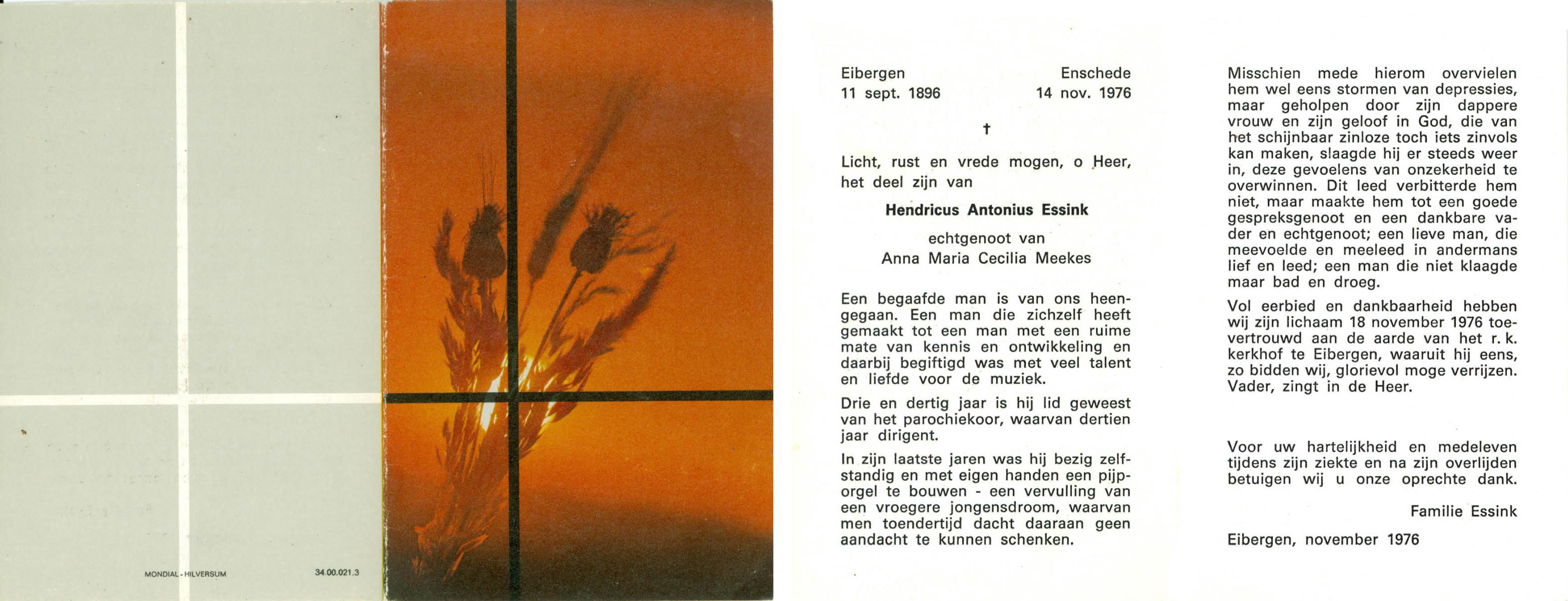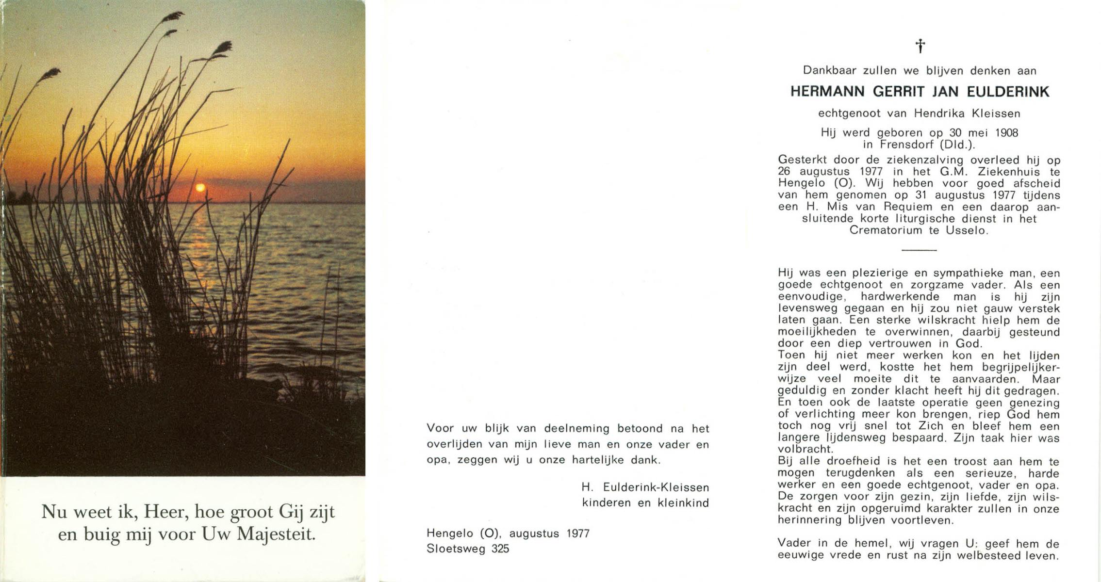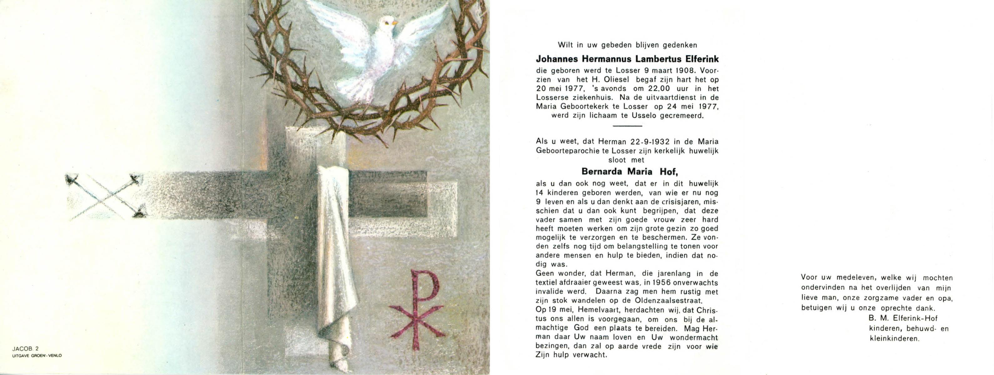 ELFERINK, Johannes Hermannus Lambertus, geboren op 9-3-1908 te Losser, overleden op 20-5-1977 te Losser op 69-jarige leeftijd, gecremeerd op 24-5-1977 te Usselo.