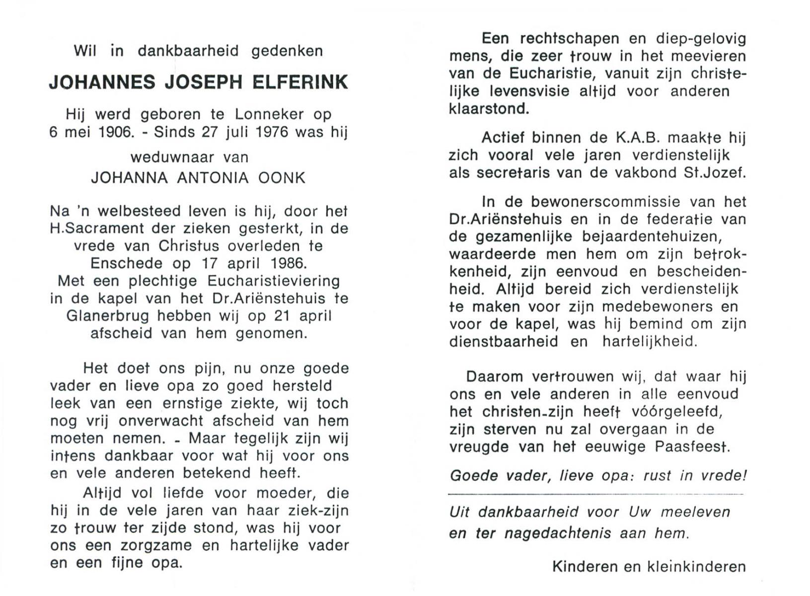 ELFERINK, Johannes Joseph, geboren op 6-5-1906 te Lonneker, overleden op 17-4-1986 te Enschede op 79-jarige leeftijd, begraven op 21-4-1986 te Glanerbrug.