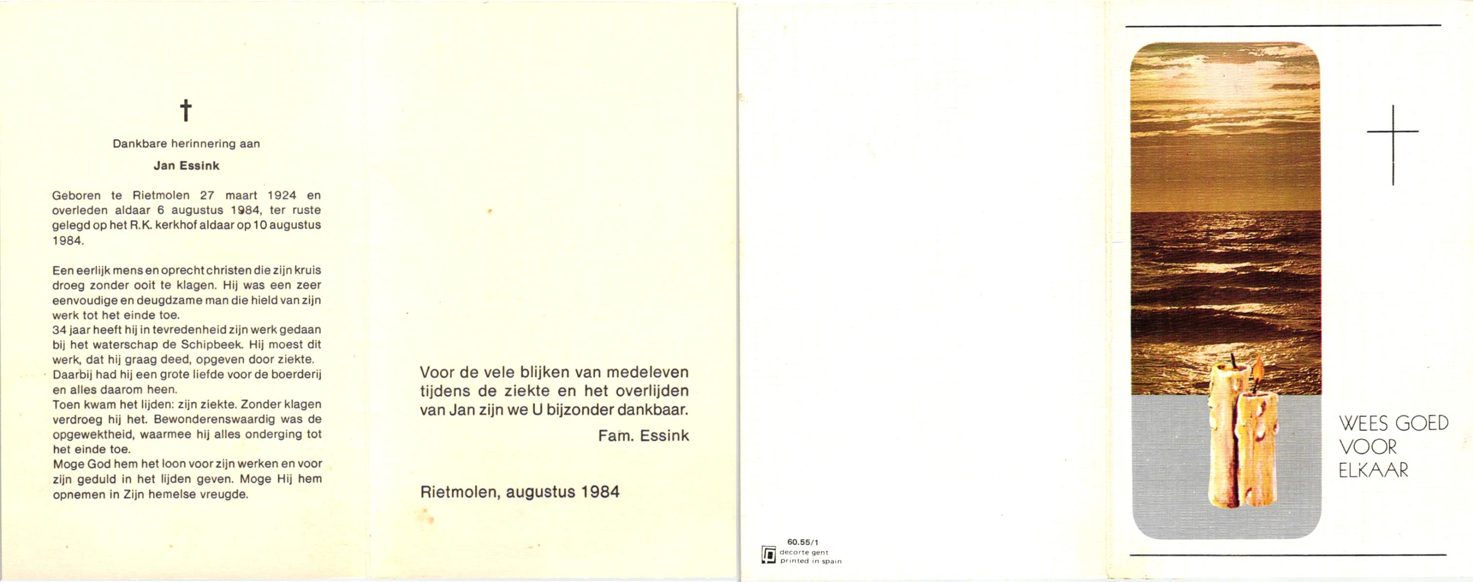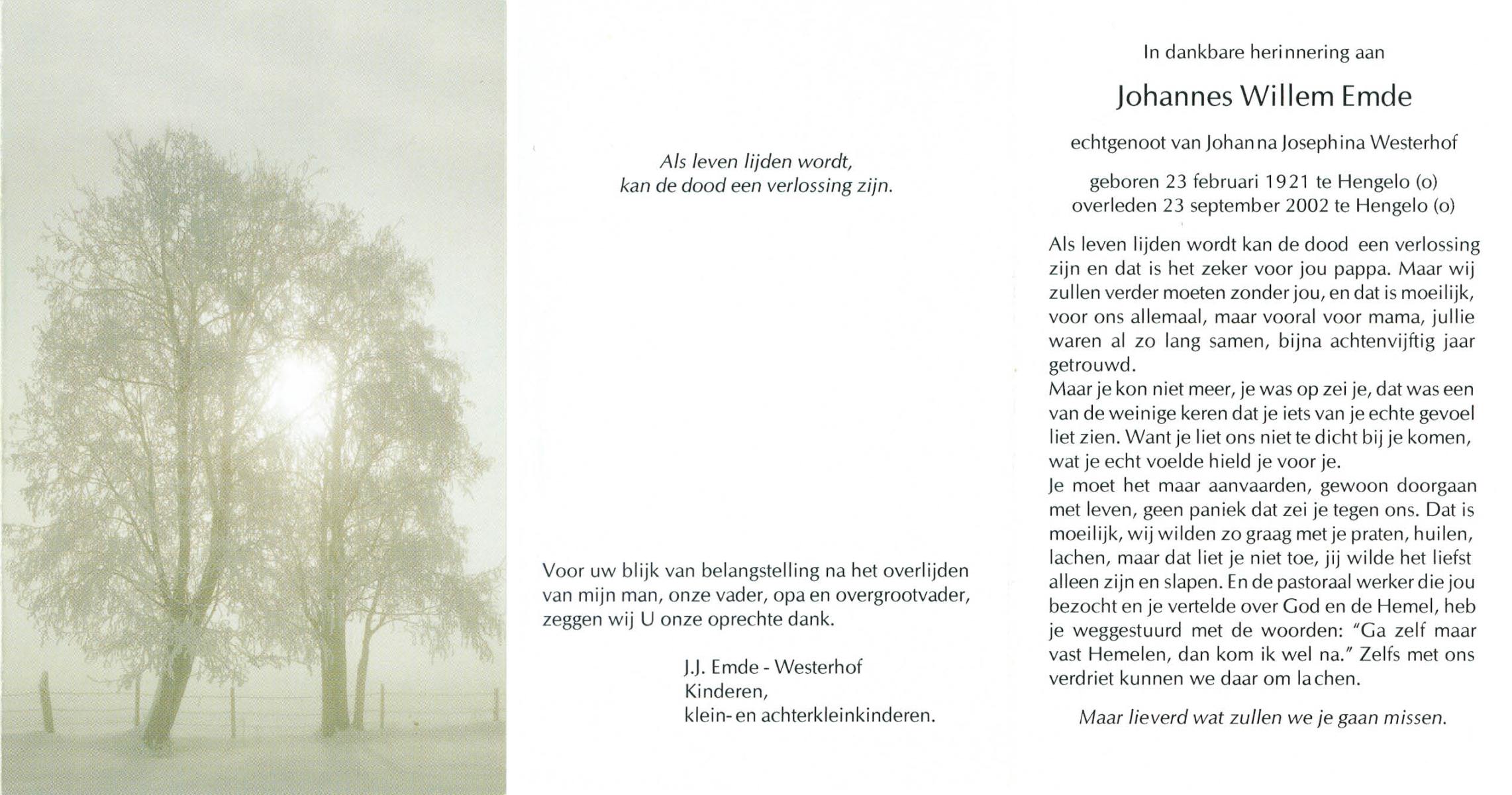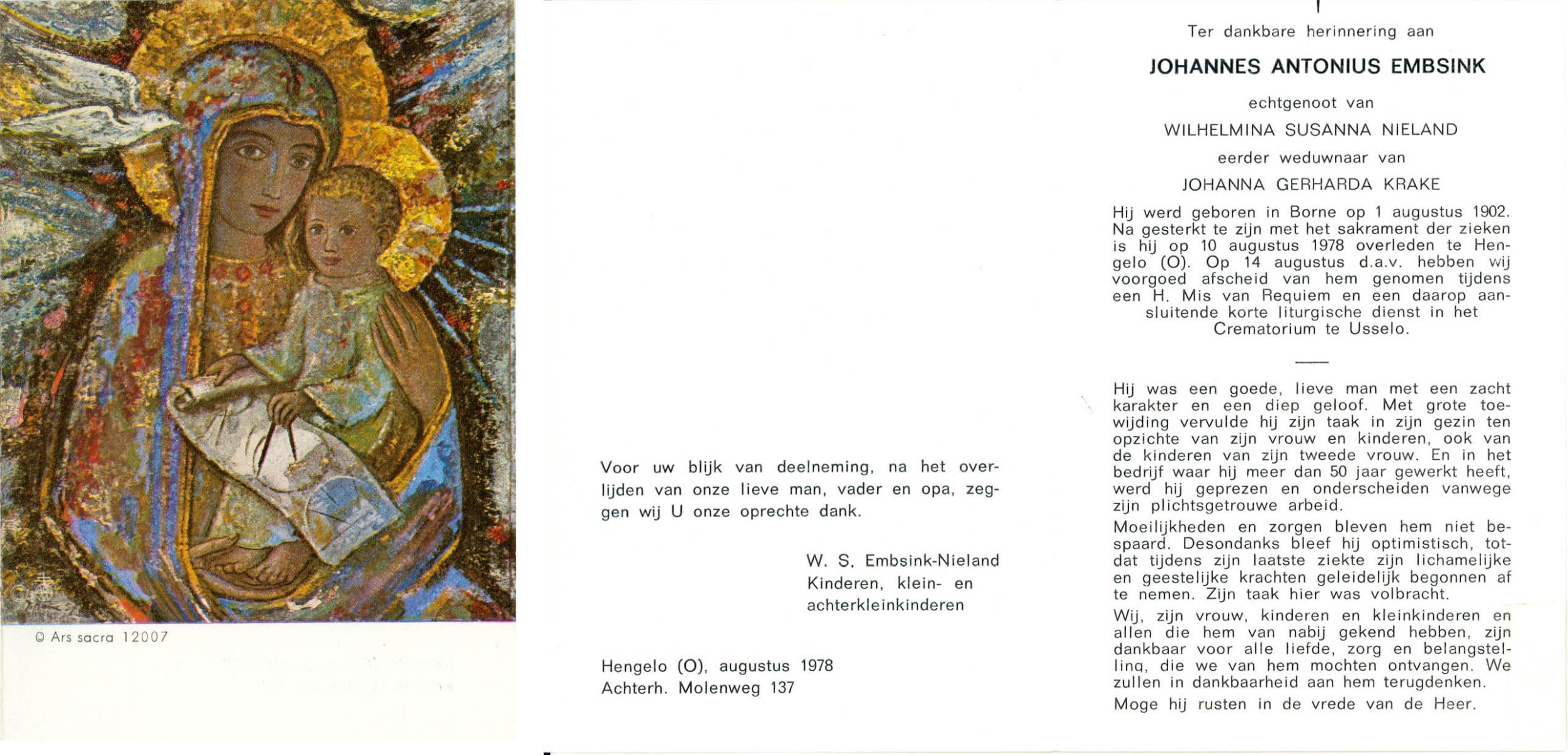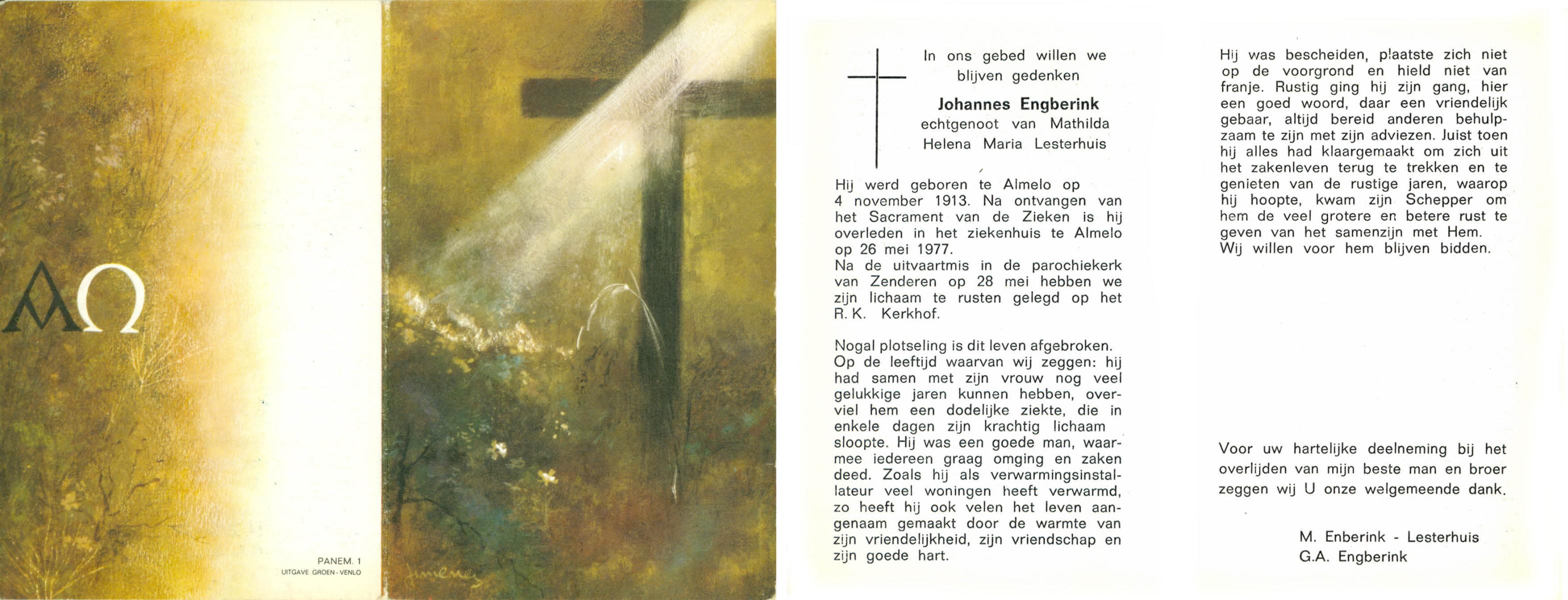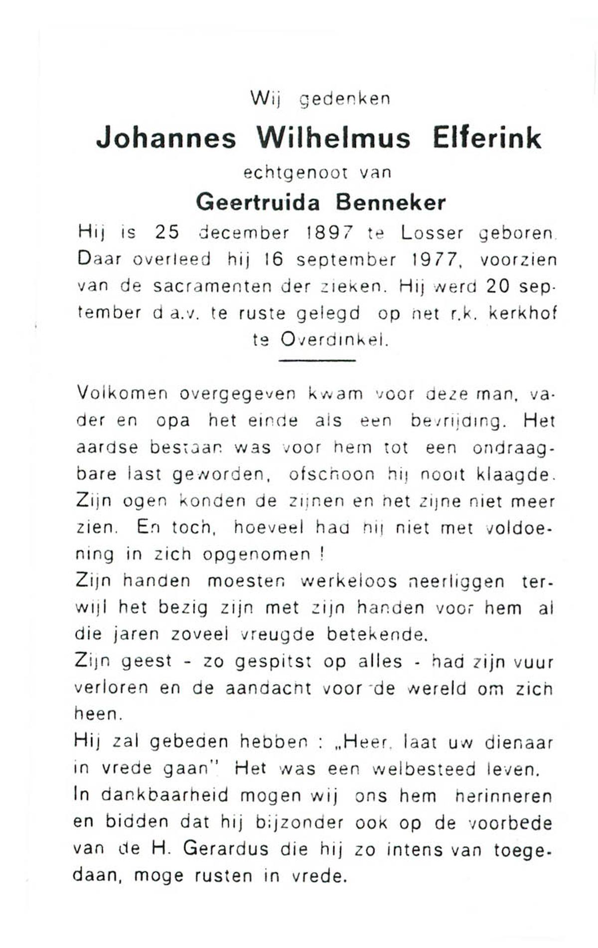 ELFERINK, Johannes Wilhelmus, geboren op 25-12-1897 te Losser, overleden op 16-9-1977 te Losser op 79-jarige leeftijd, begraven op 20-9-1977 te Losser.