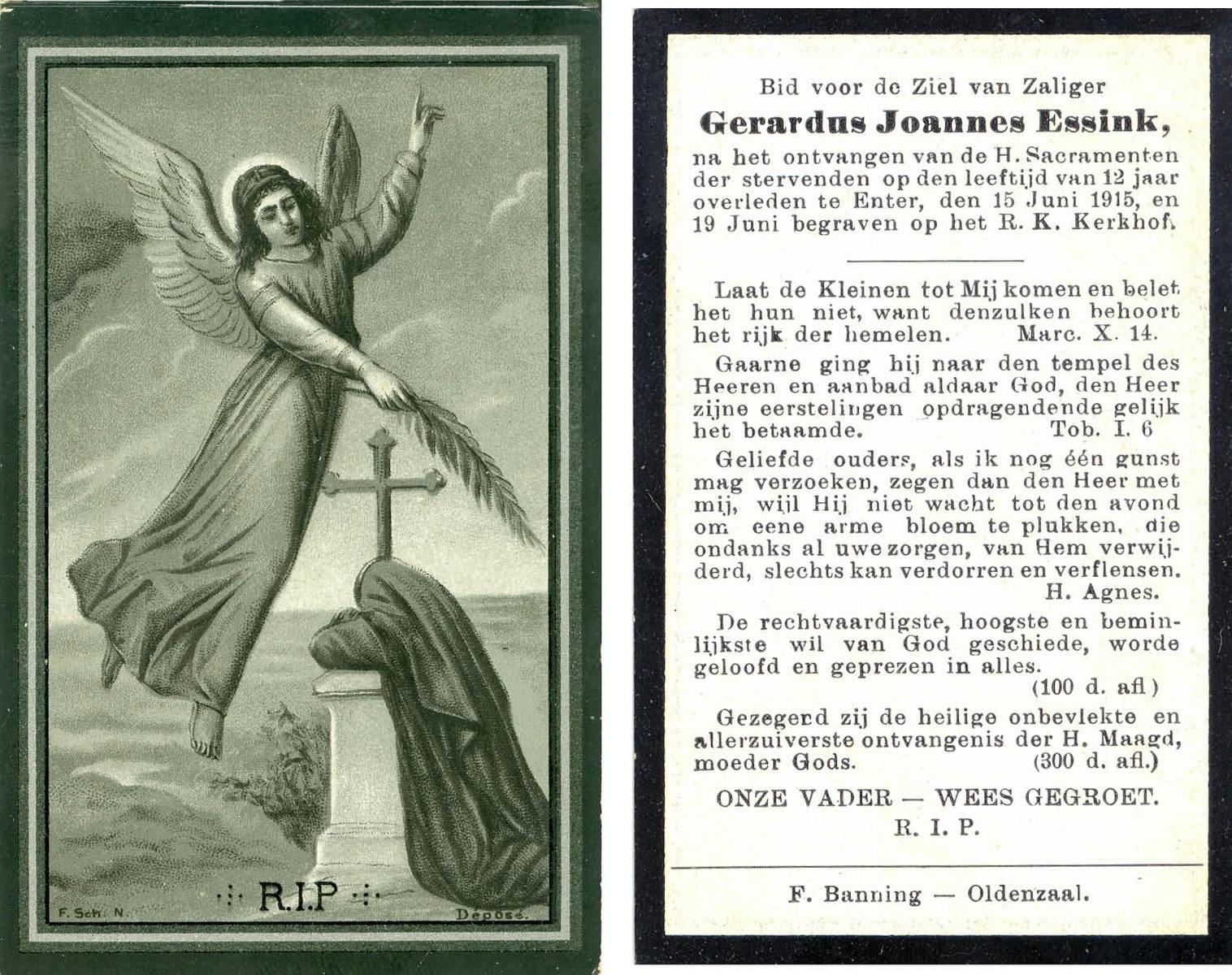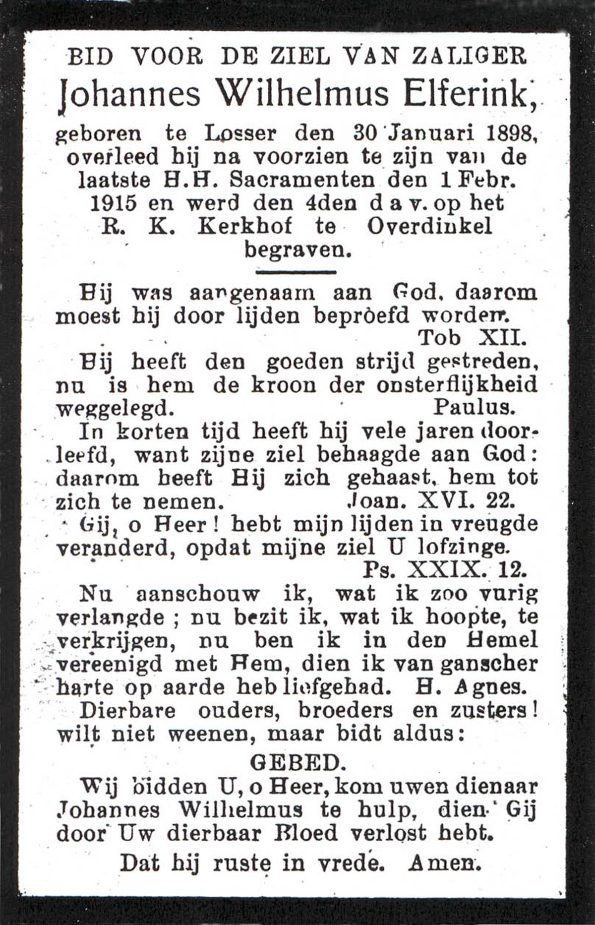 ELFERINK, Johannes Wilhelmus, geboren op 30-01-1898 te Losser, overleden op 1-2-1915 op 17-jarige leeftijd, begraven op 4-2-1915 te Overdinkel.