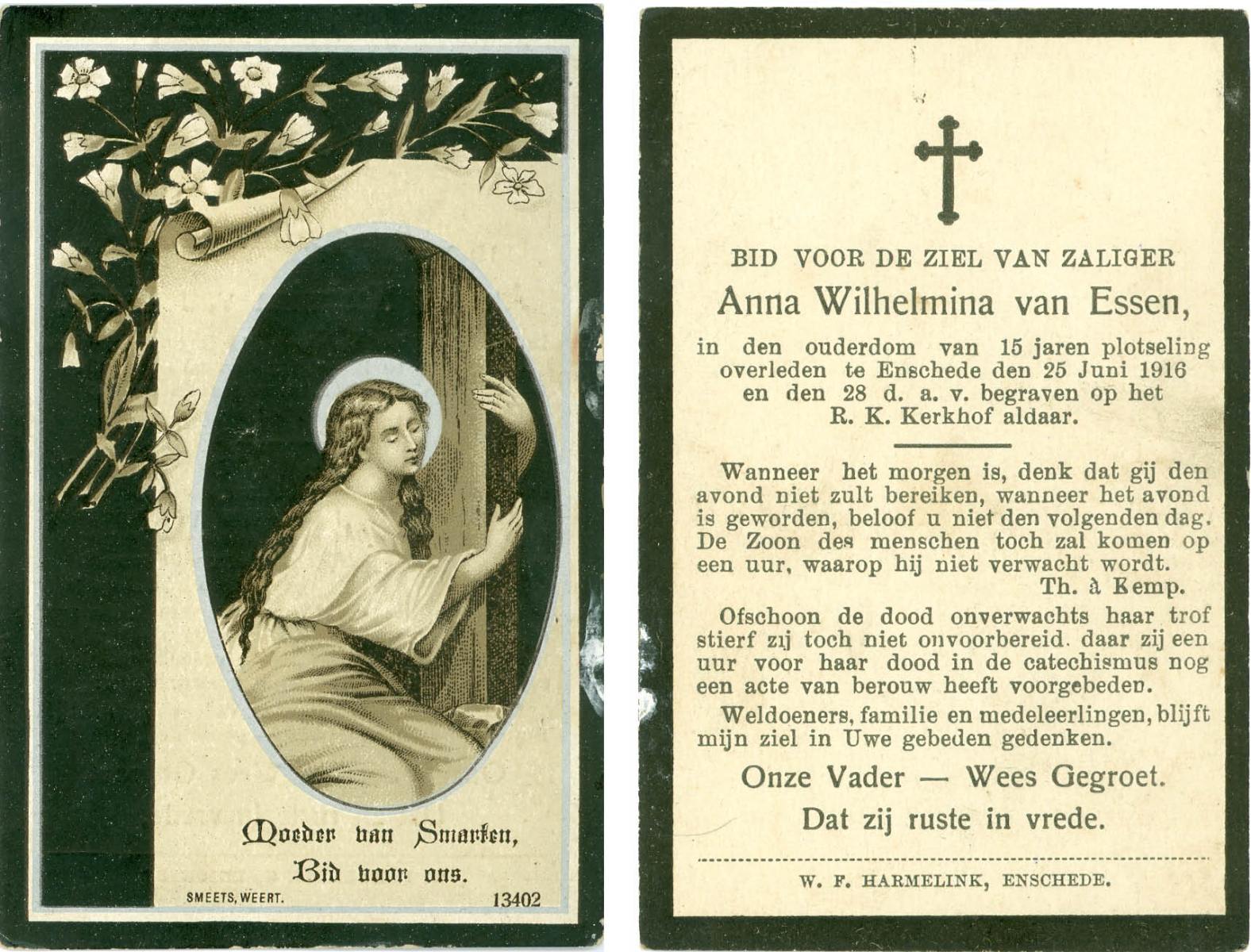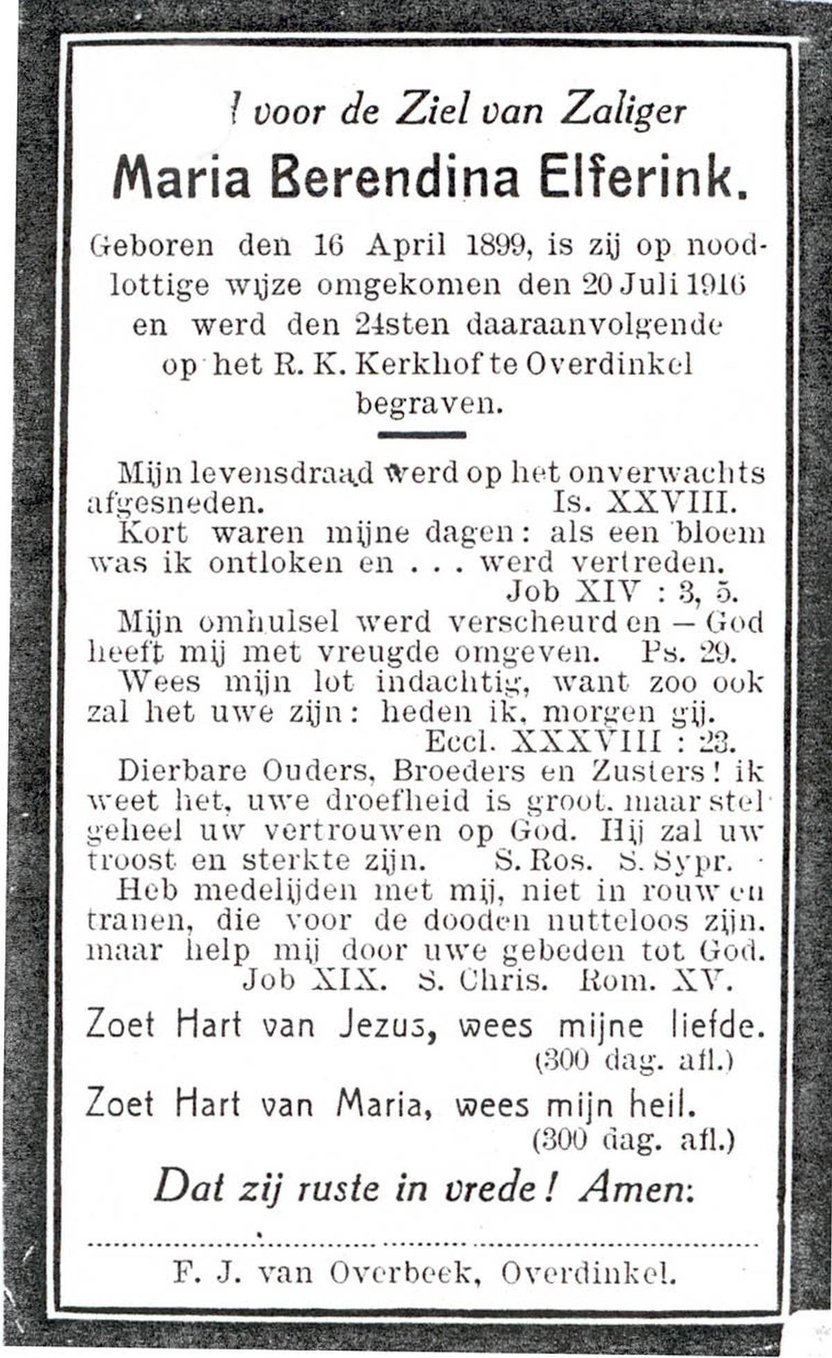 ELFERINK, Maria Berendina, geboren op 16-04-1899 te Overdinkel, overleden op 20-7-1916 op 18-jarige leeftijd, begraven op 24-7-1916 te Overdinkel.