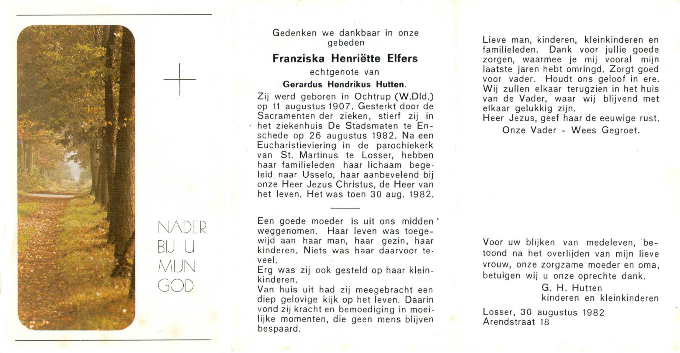 ELFERS, Franziska Henriëtte, geboren op 11-8-1907 te Ochtrup (Dld.), overleden op 26-8-1982 te Enschede op 75-jarige leeftijd, gecremeerd op 30-8-1982 te Usselo.