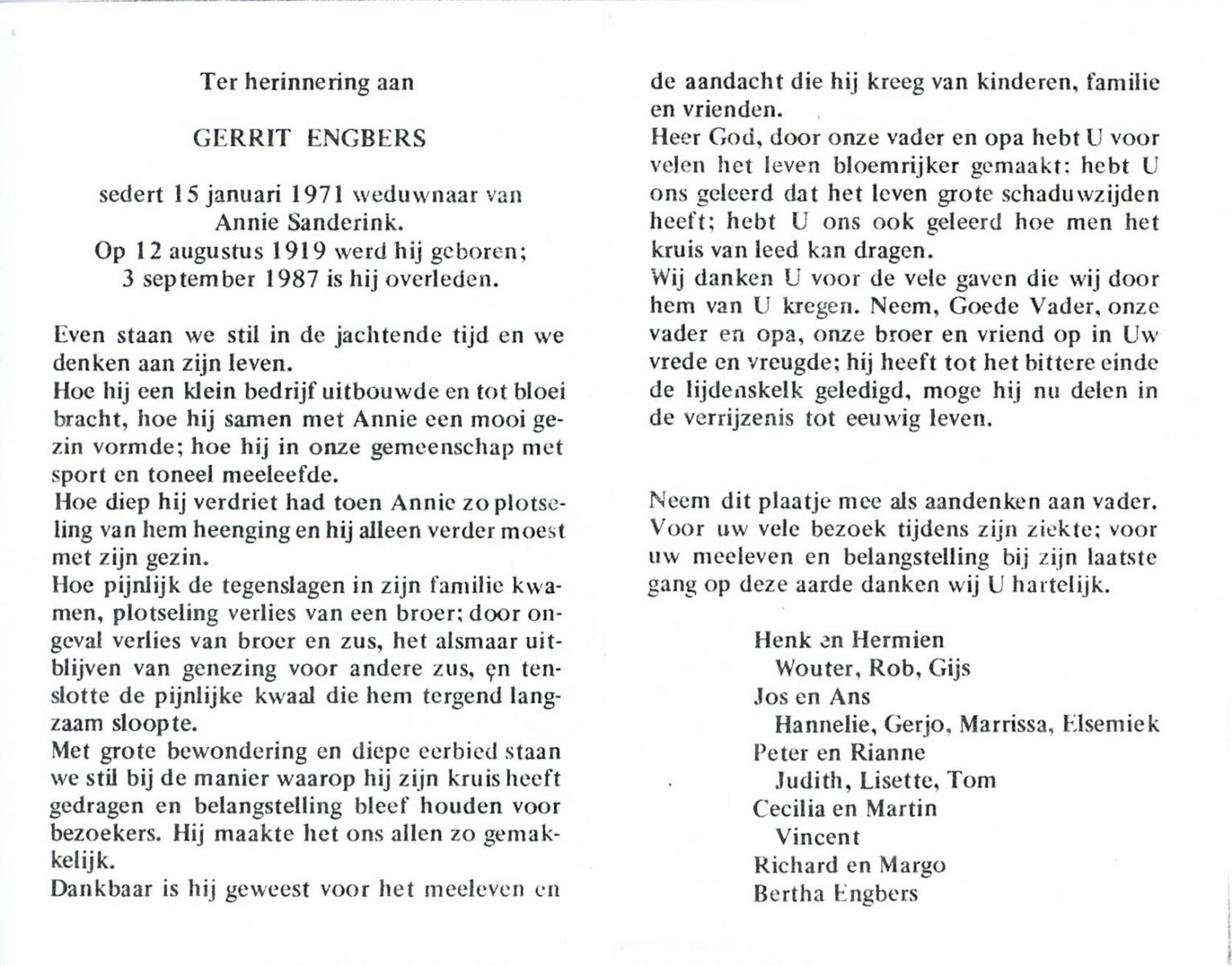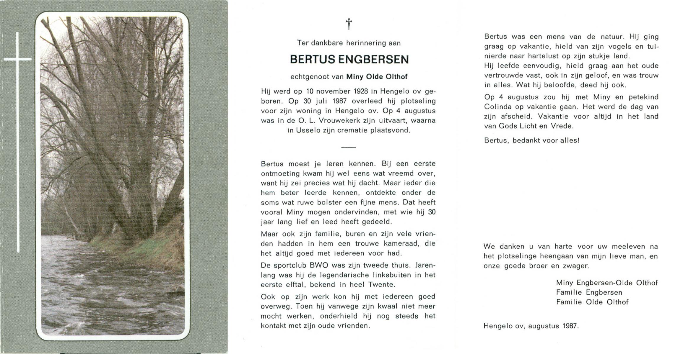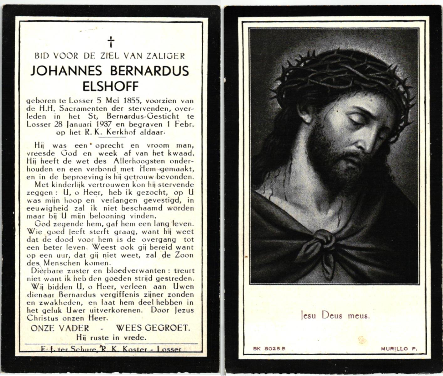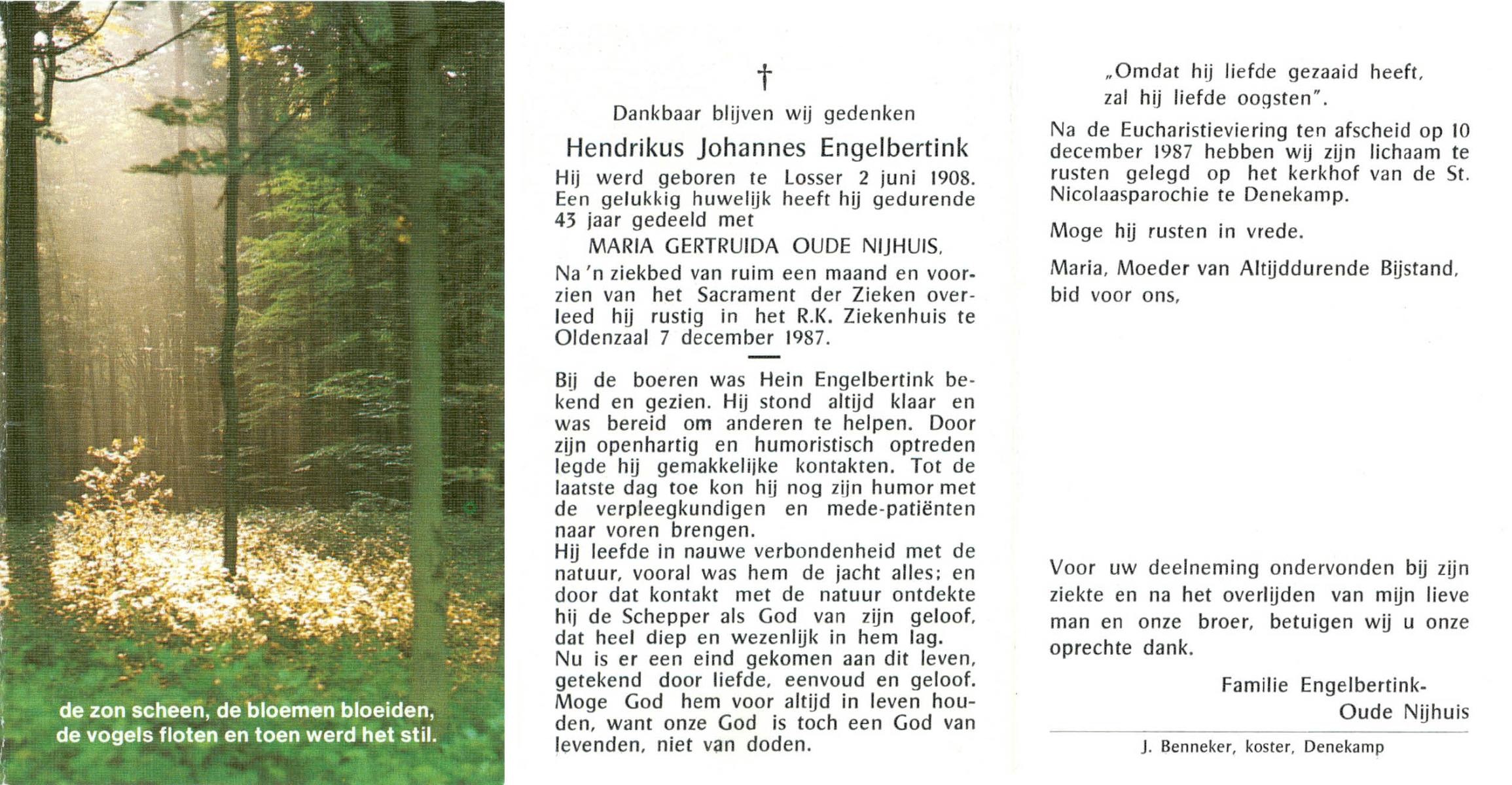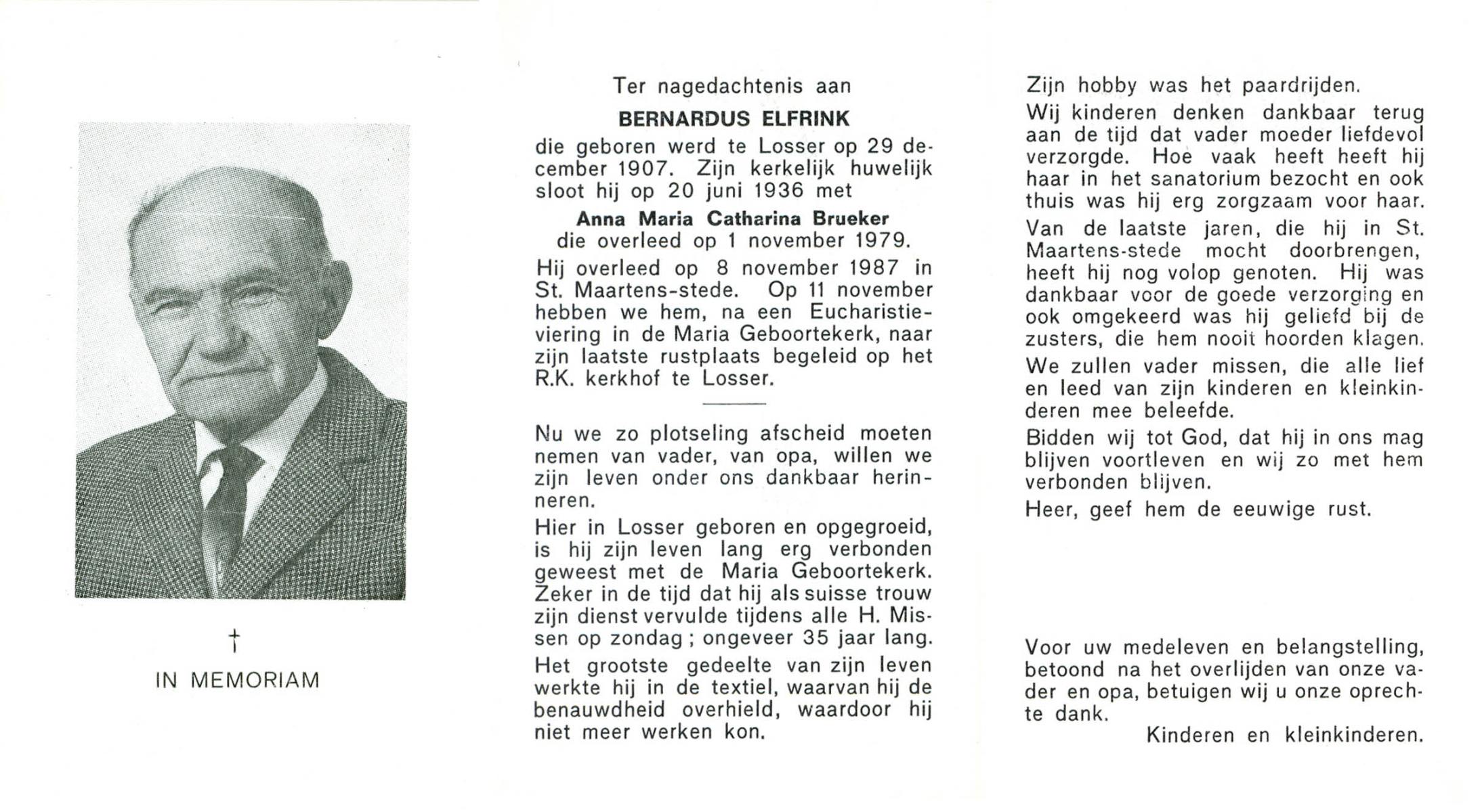 ELFRINK, Bernardus, geboren op 29-12-1907 te Losser, overleden op 8-11-1987 te Losser op 79-jarige leeftijd, begraven op 11-11-1987 te Losser.