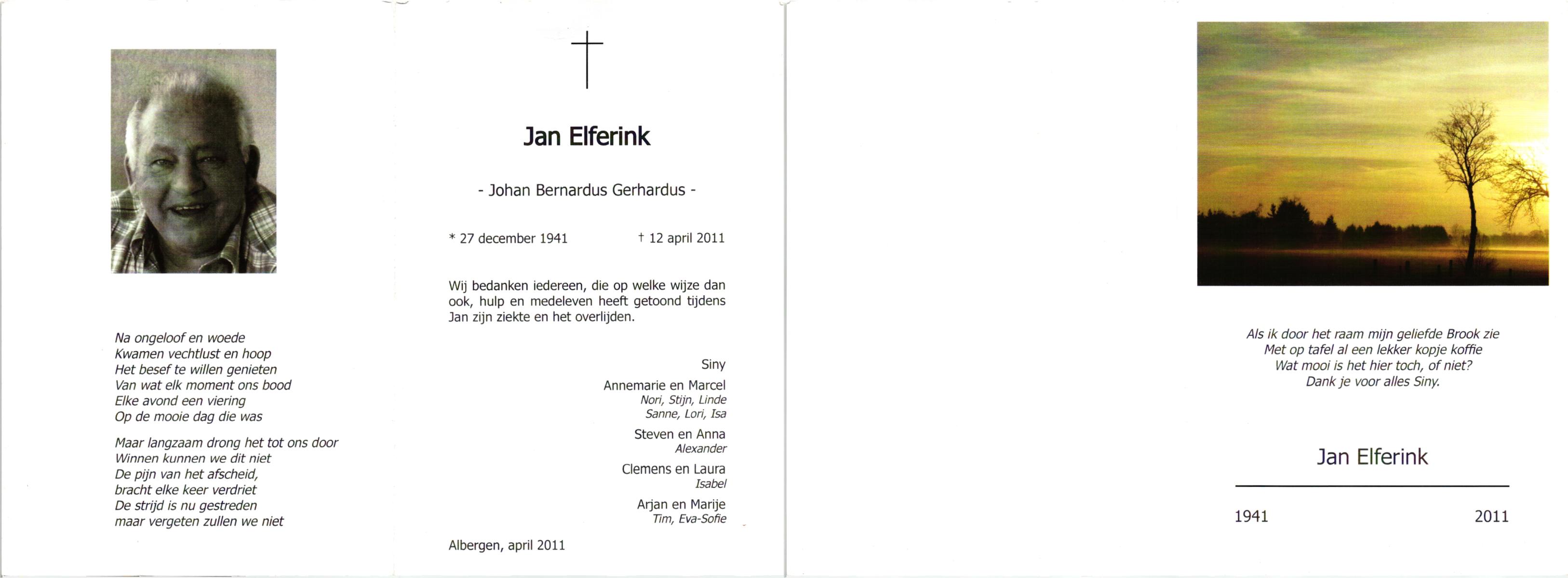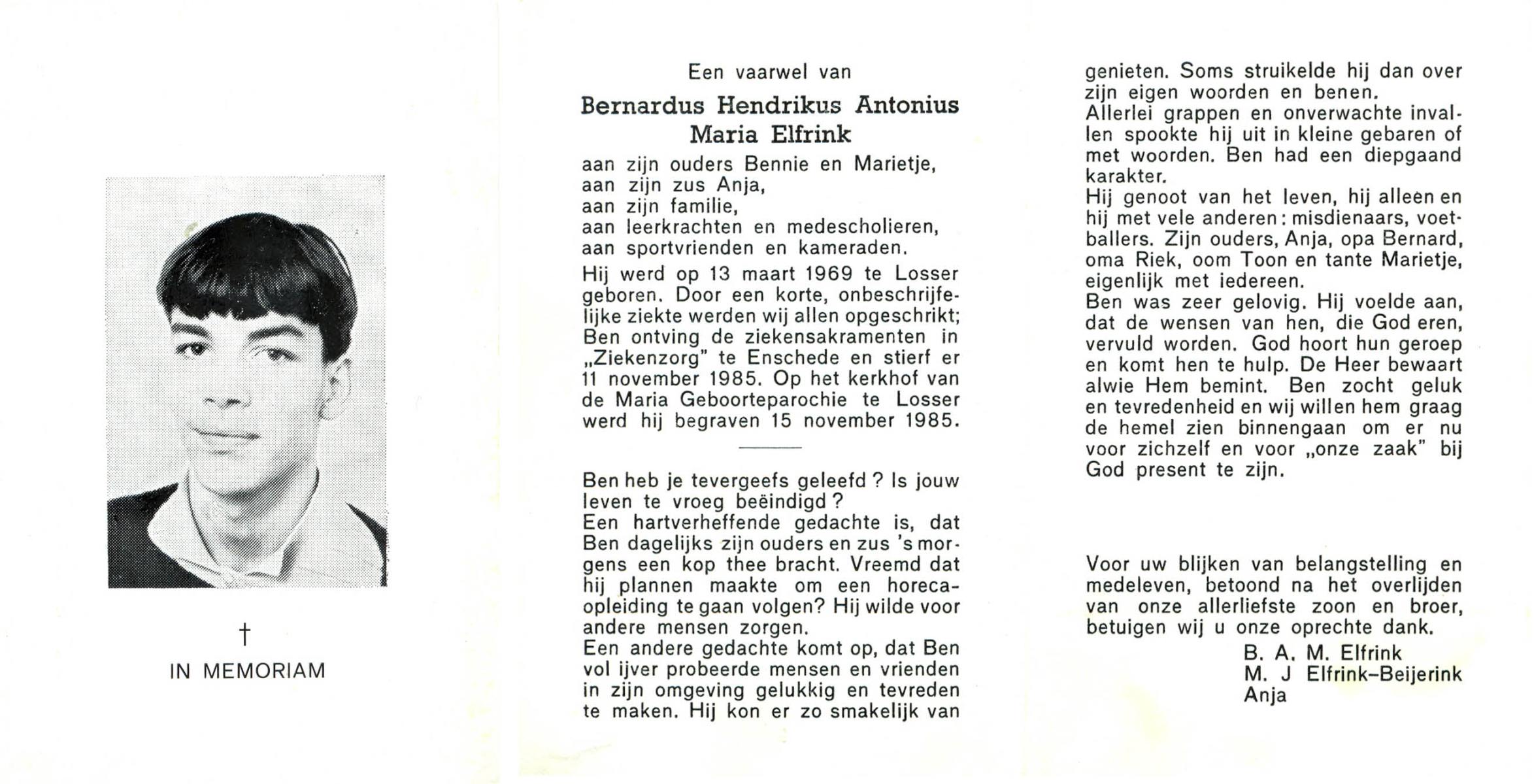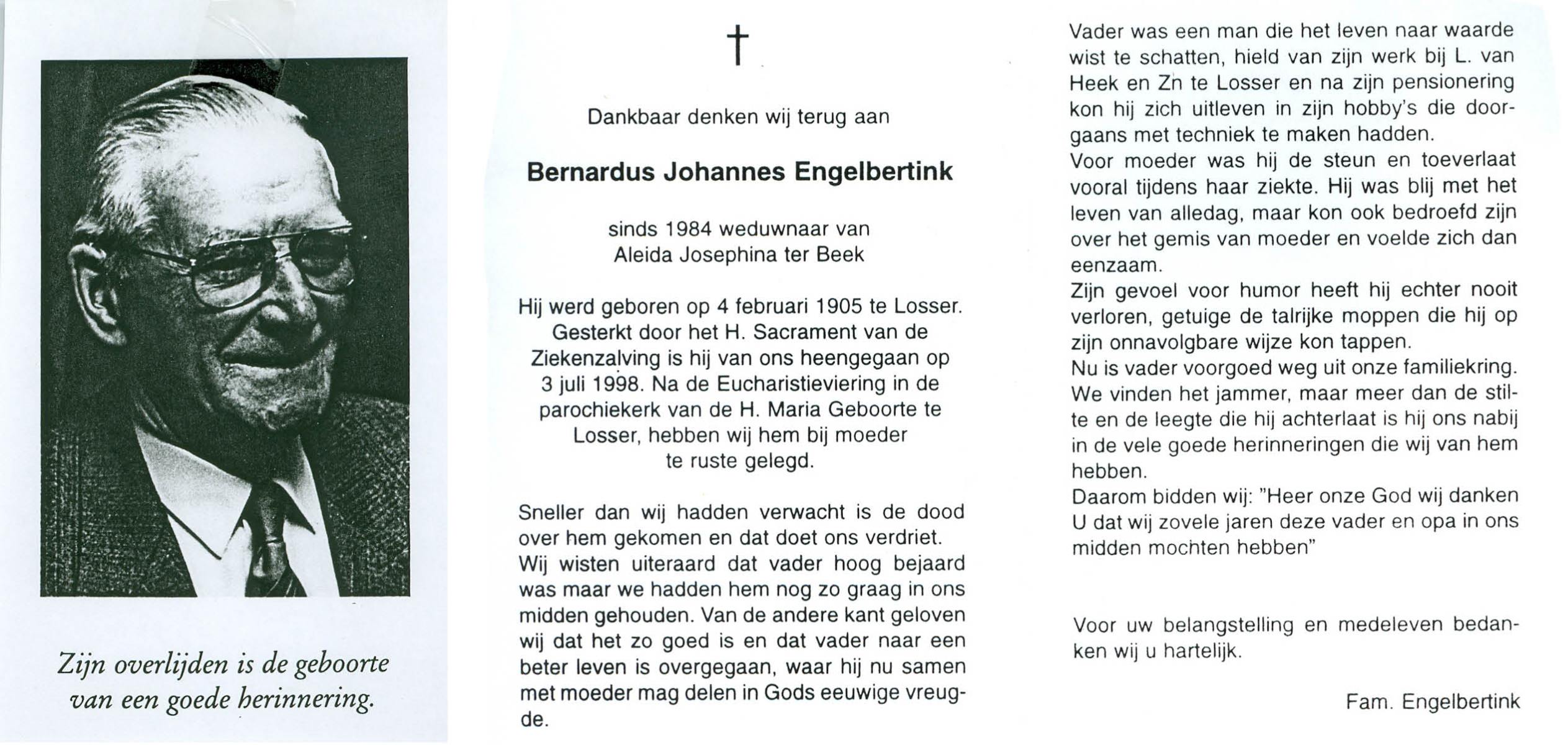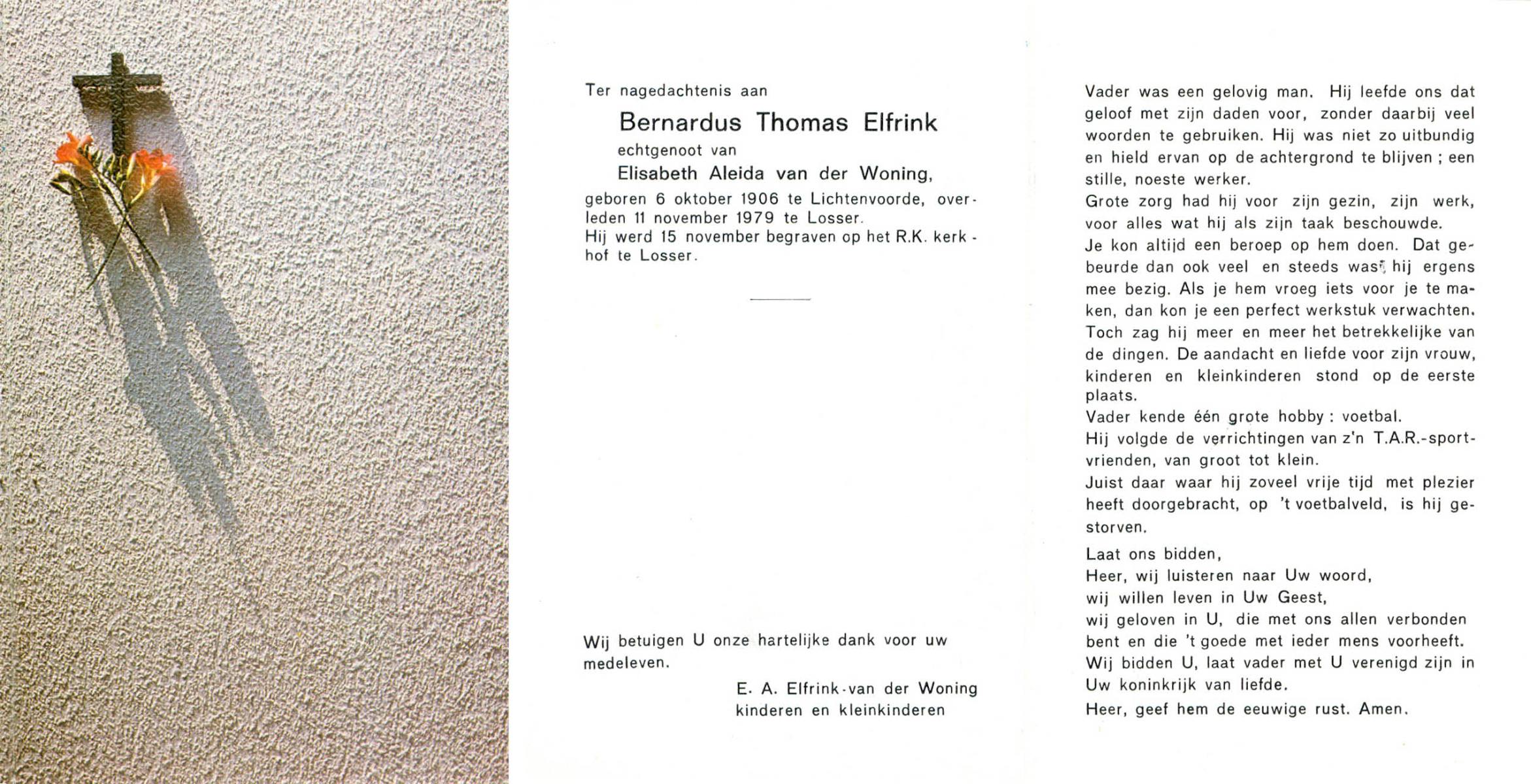 ELFRINK, Bernardus Thomas, geboren op 6-10-1906 te Lichtenvoorde, overleden op 11-11-1979 te Losser op 73-jarige leeftijd, begraven op 15-11-1979 te Losser.