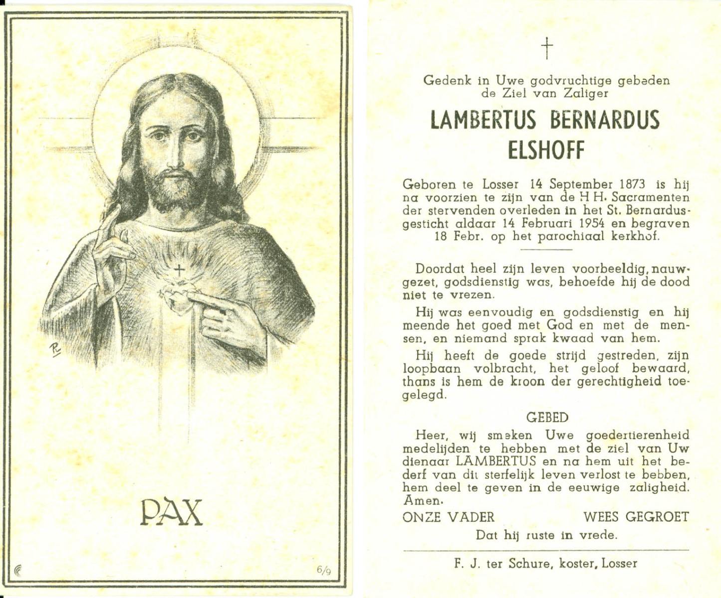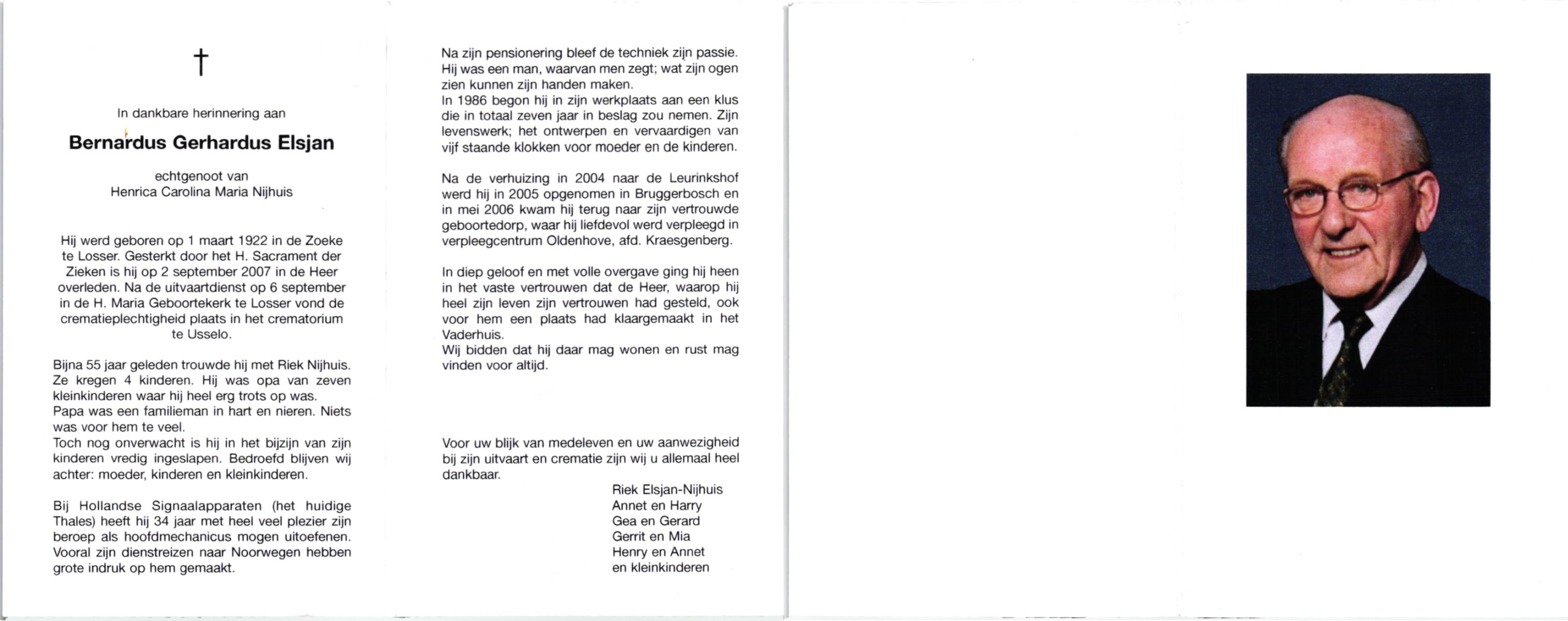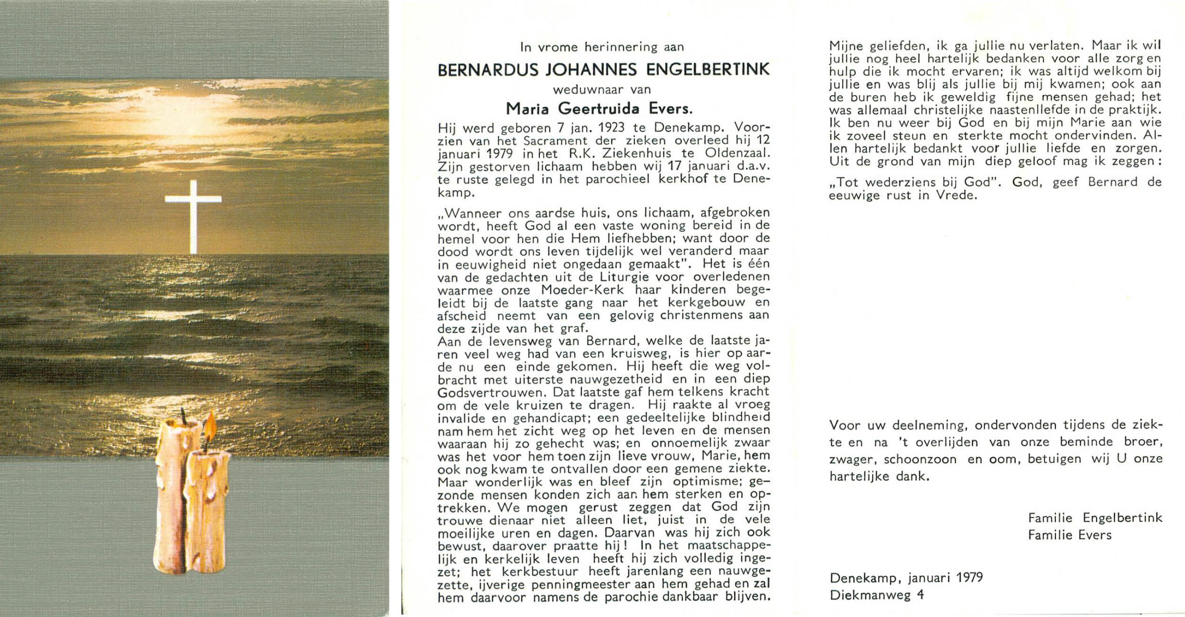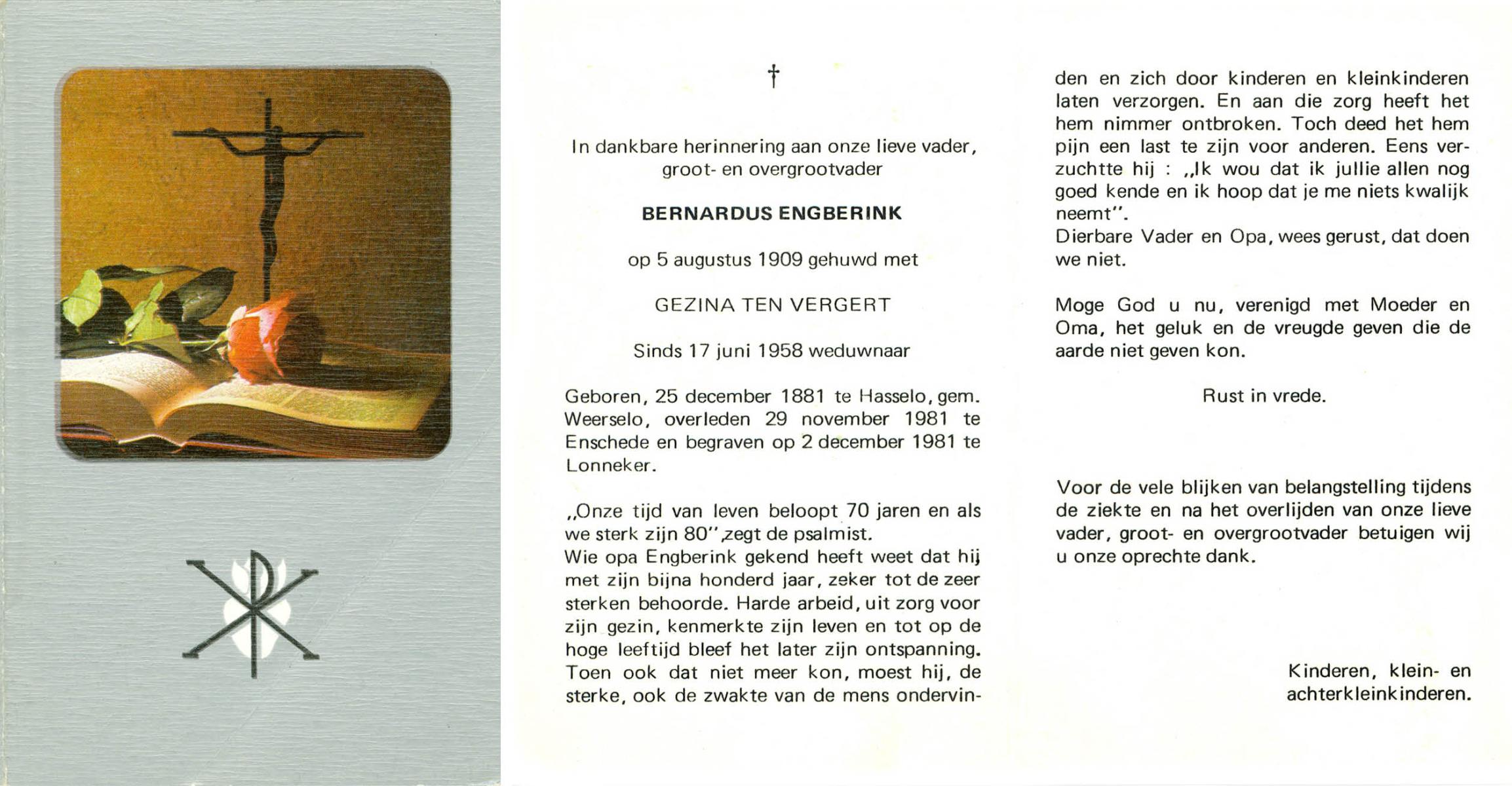 ELFRINK, Bernardus Thomas, geboren op 6-10-1906 te Lichtenvoorde, overleden op 11-11-1979 te Losser op 73-jarige leeftijd, begraven op 15-11-1979 te Losser.