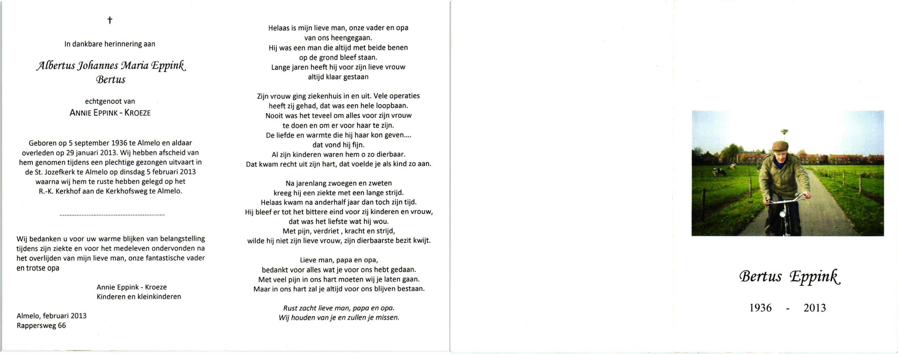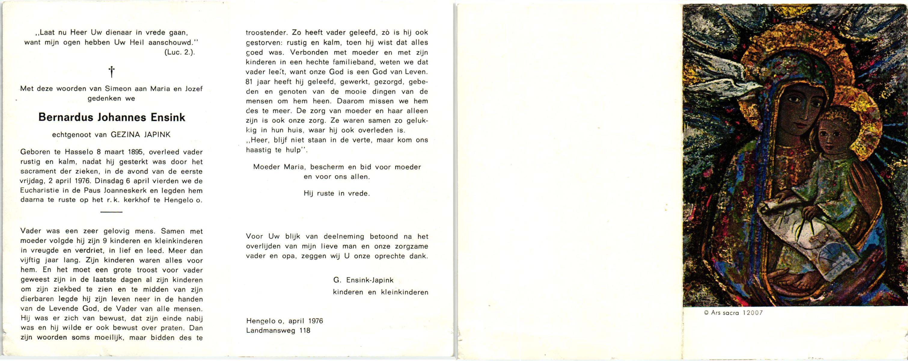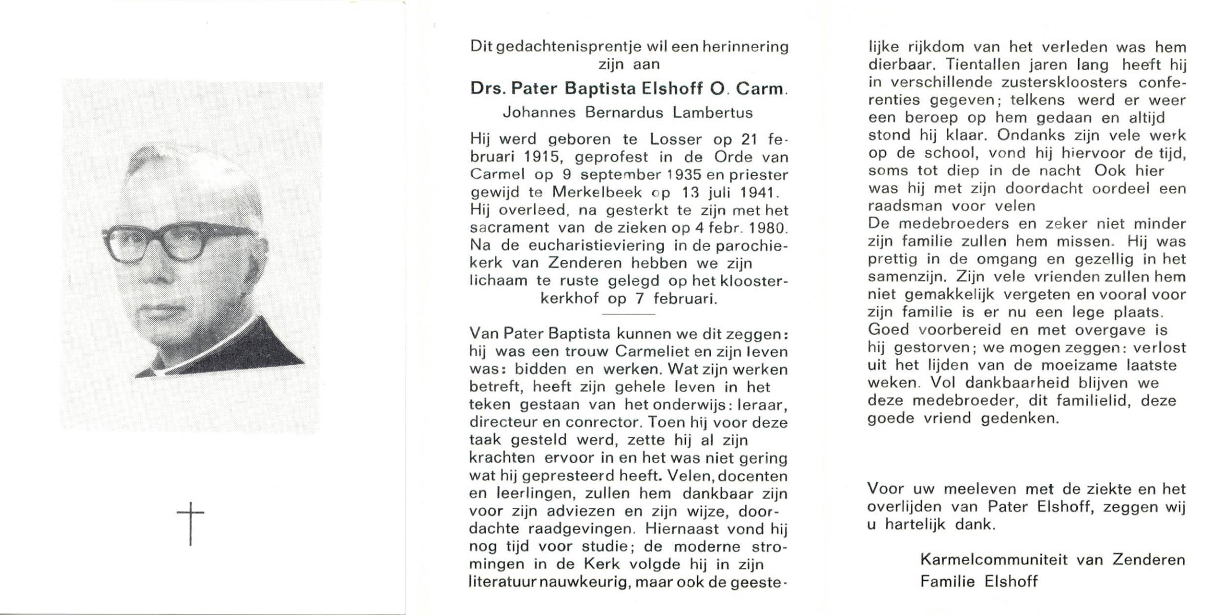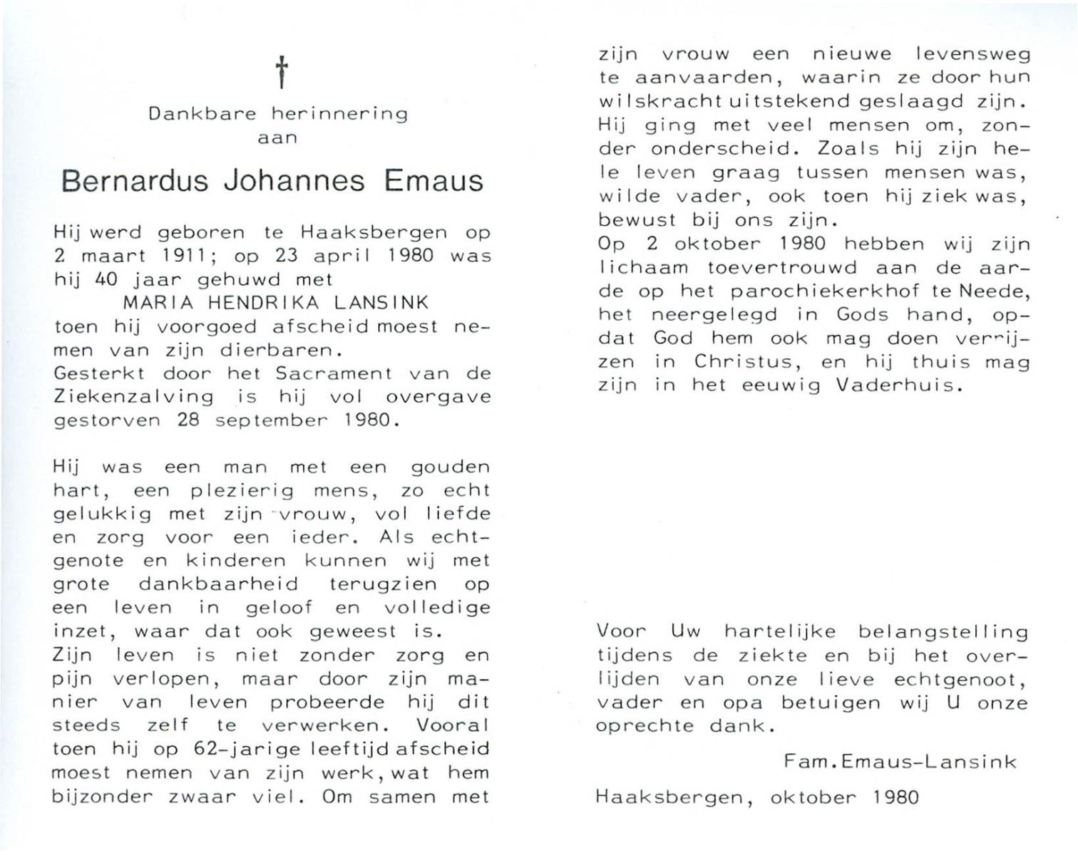 ELFRINK, Bernardus Thomas, geboren op 6-10-1906 te Lichtenvoorde, overleden op 11-11-1979 te Losser op 73-jarige leeftijd, begraven op 15-11-1979 te Losser.