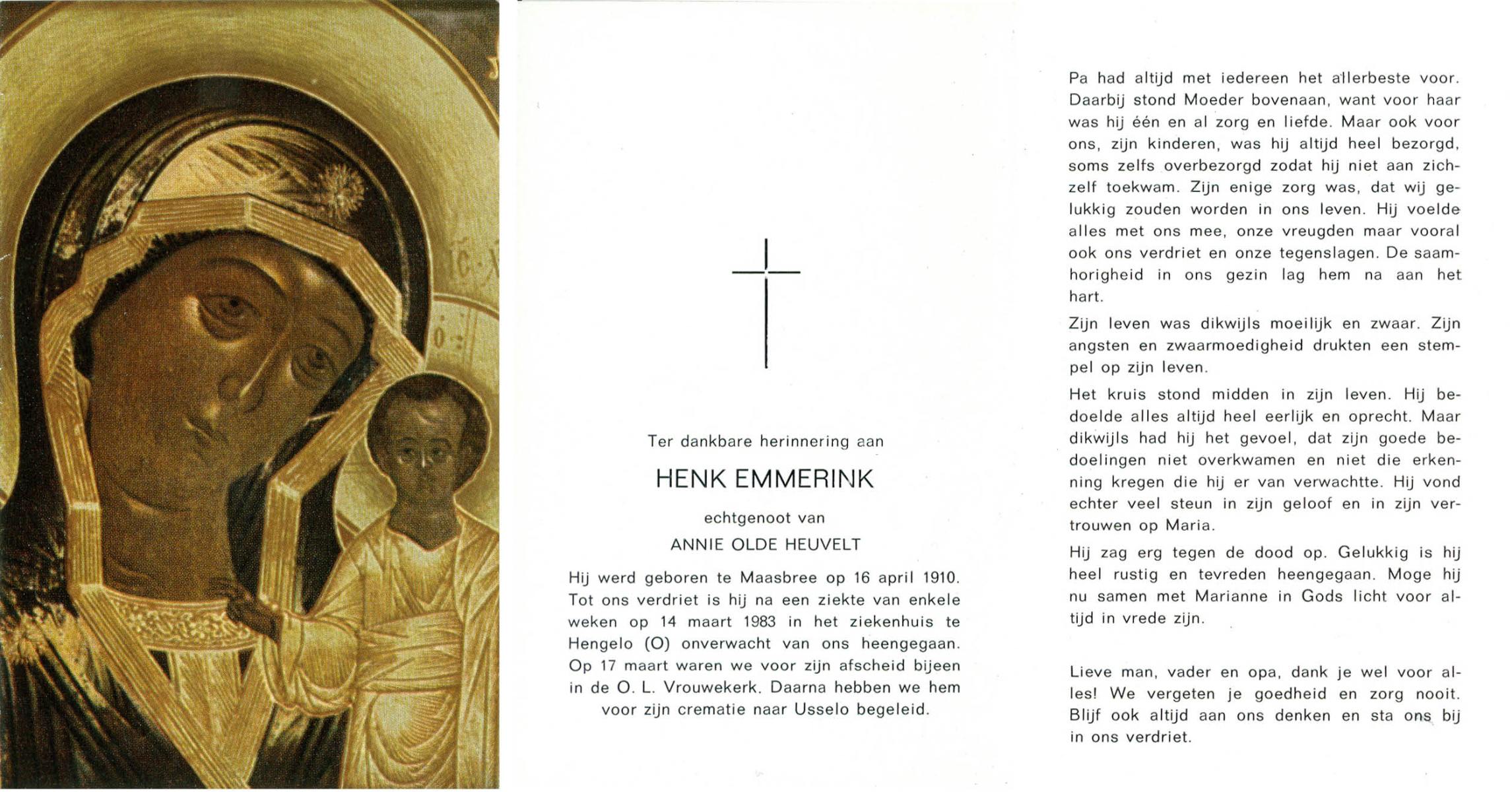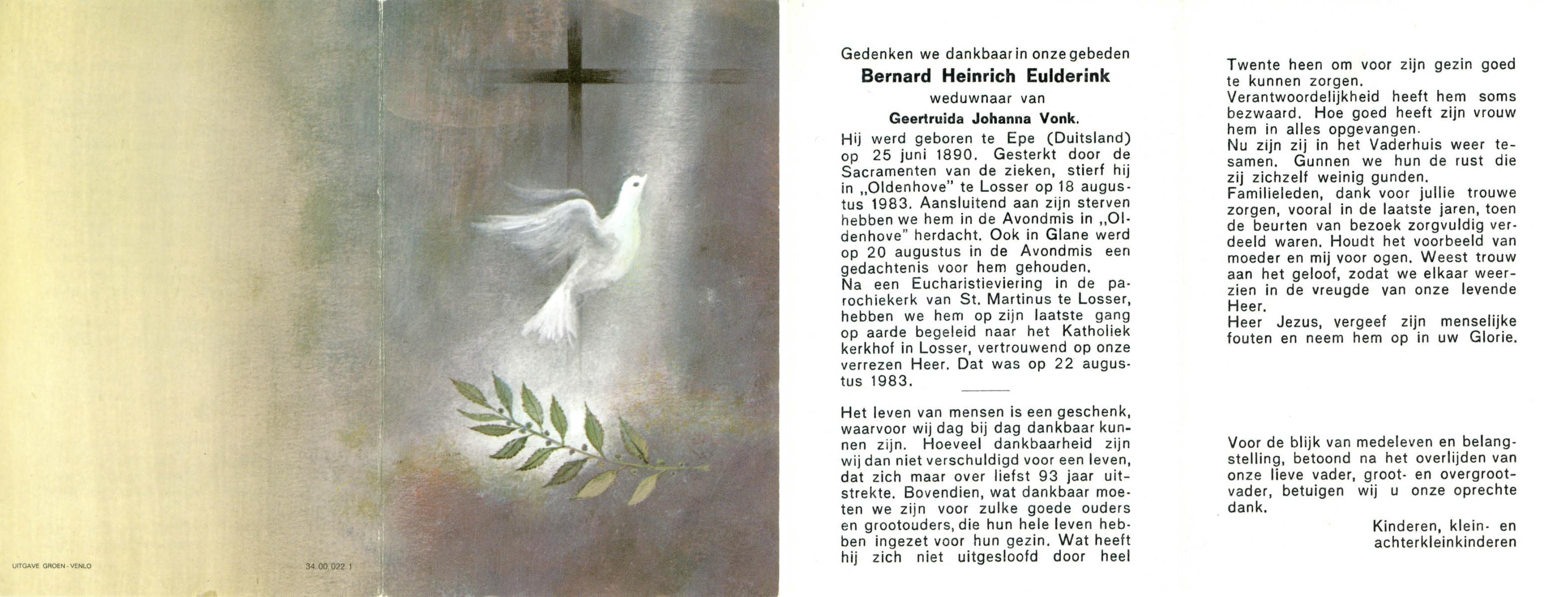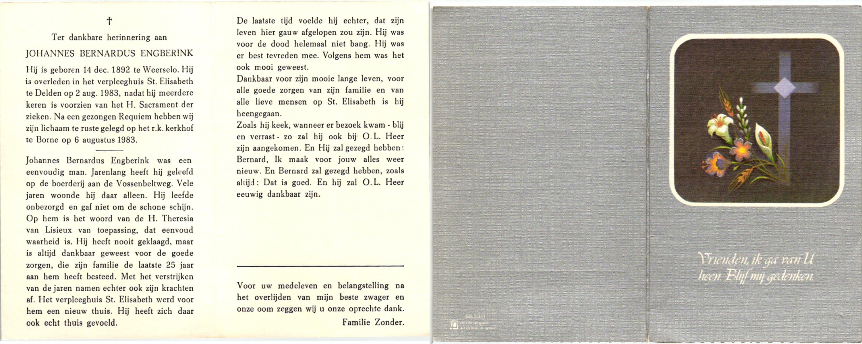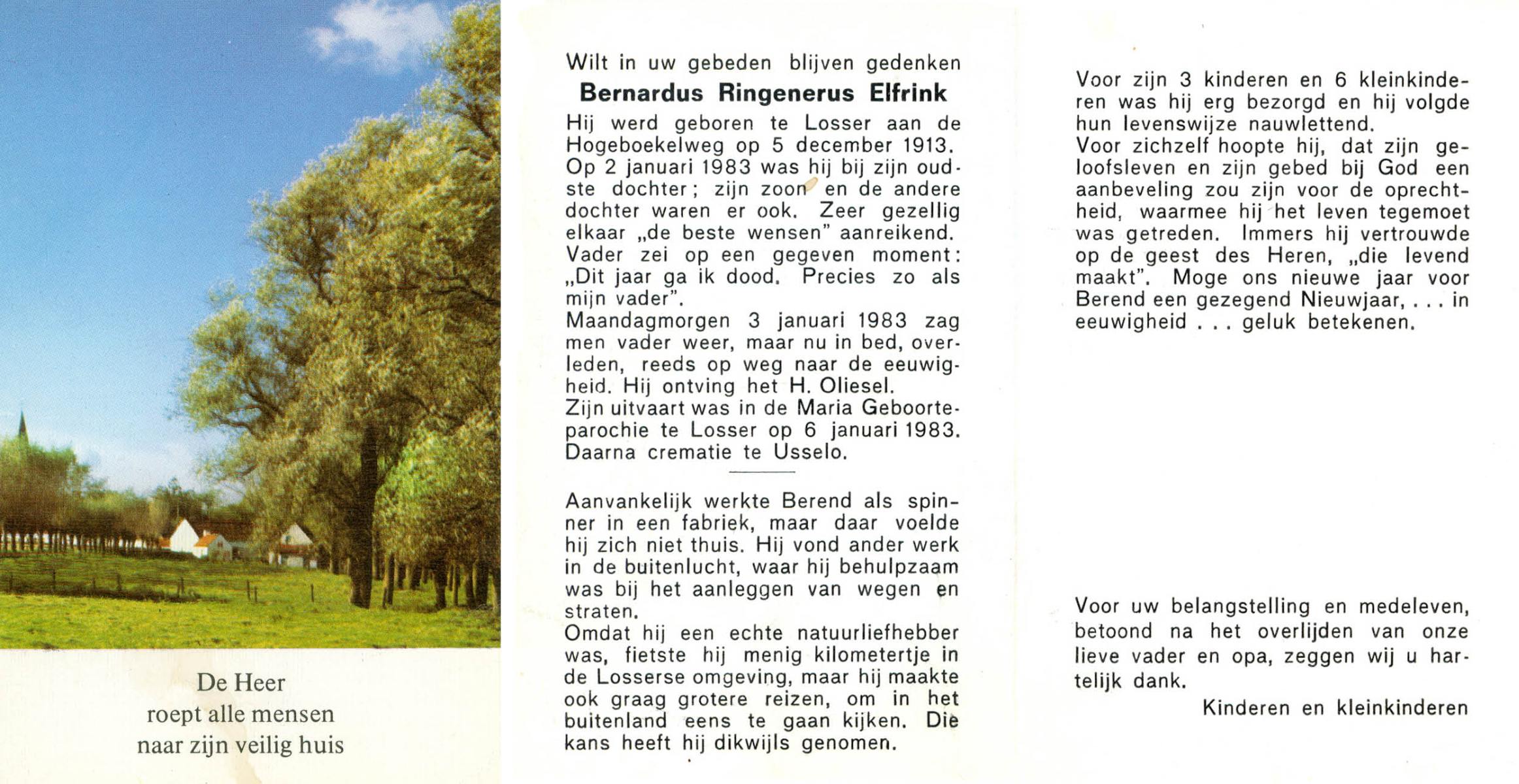 ELFRINK, Bernardus Ringenerus, geboren op 5-12-1913 te Losser, overleden op 3-1-1983 op 69-jarige leeftijd, gecremeerd op 6-1-1983 te Usselo.
