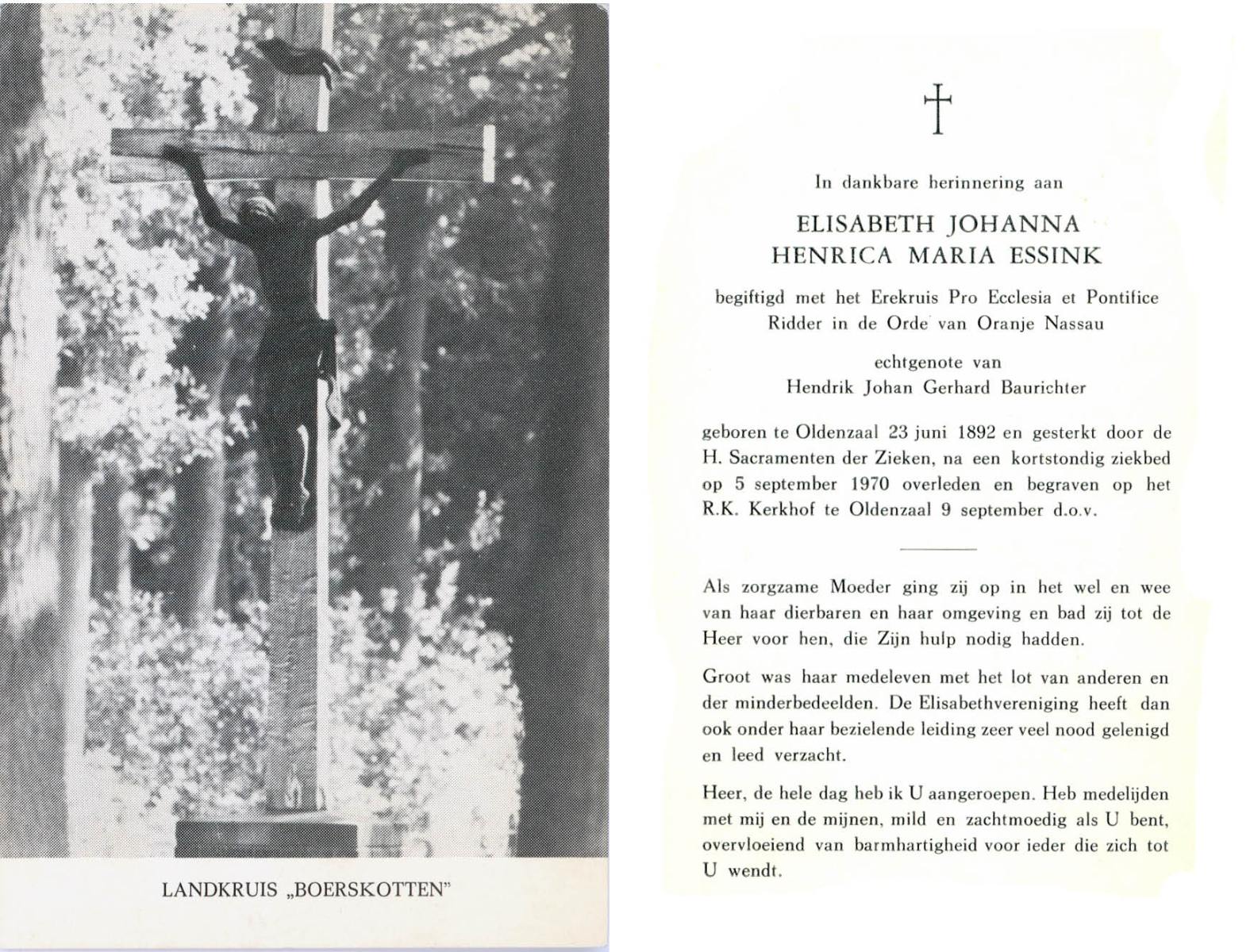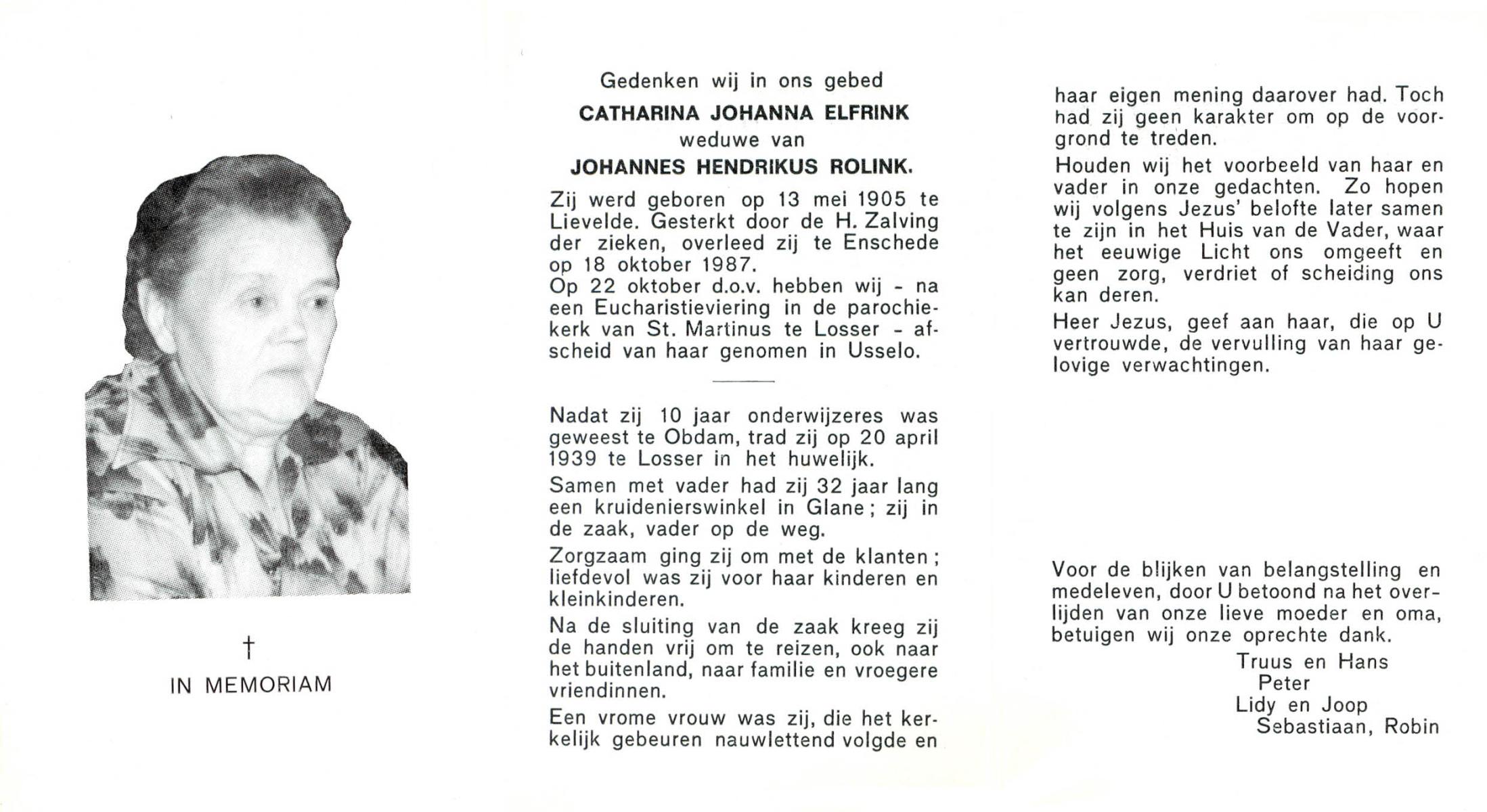 ELFRINK, Catharina Johanna, geboren op 13-5-1905 te Lievelde, overleden op 18-10-1987 te Enschede op 82-jarige leeftijd, begraven op 22-10-1987 te Losser.