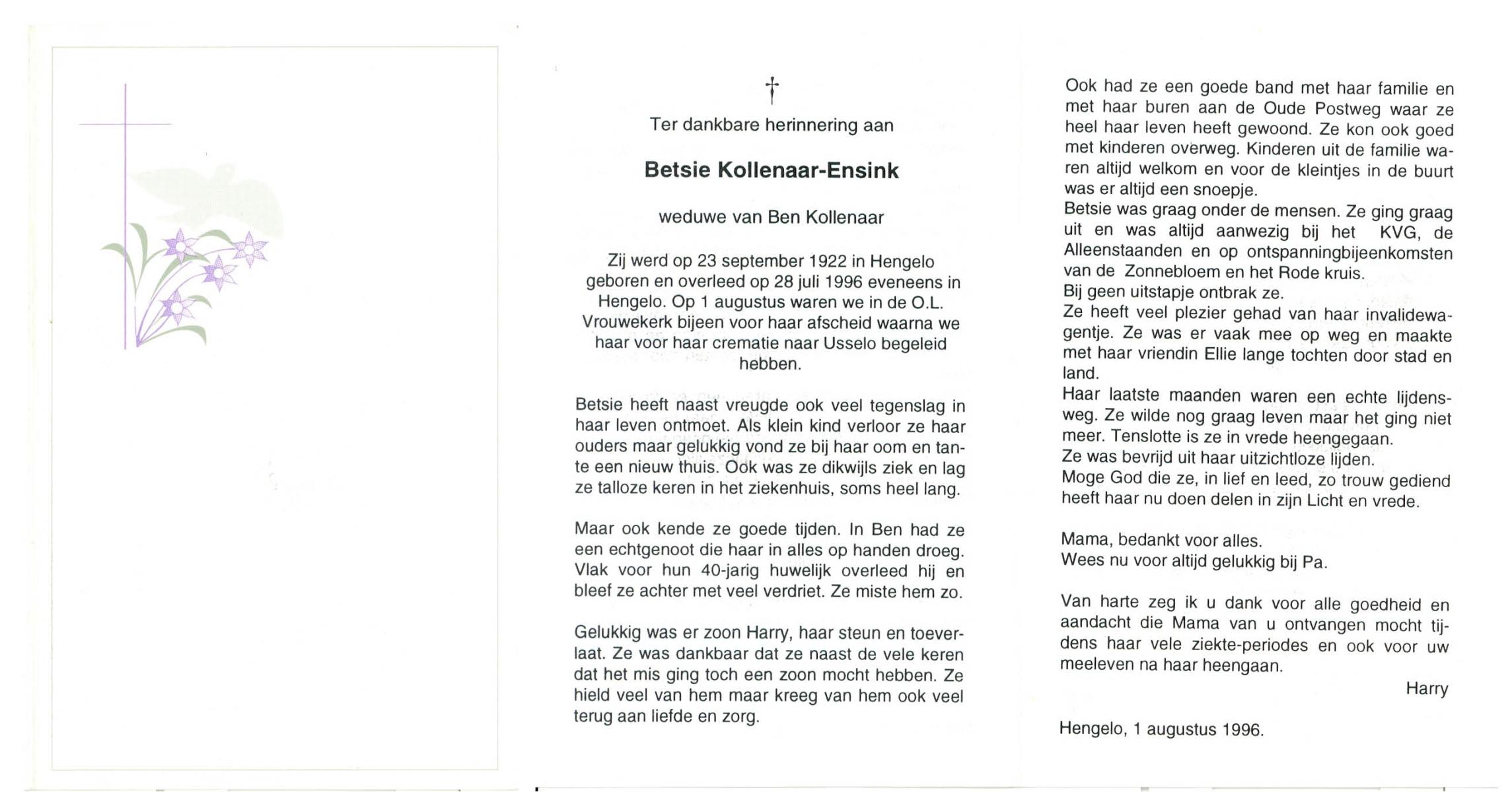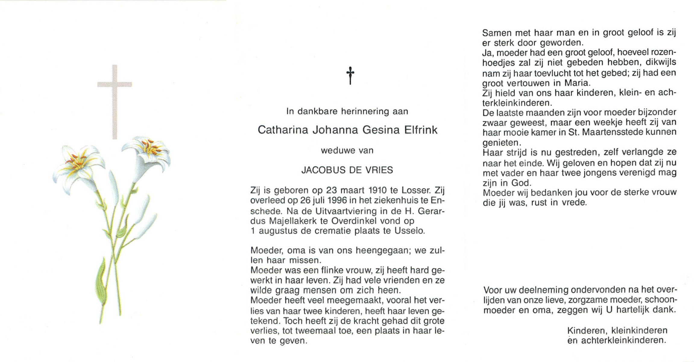 ELFRINK, Catharina Johanna Gesina, geboren op 23-3-1910 te Losser, overleden op 26-7-1996 te Enschede op 86-jarige leeftijd, gecremeerd op 1-8-1996 te Usselo.