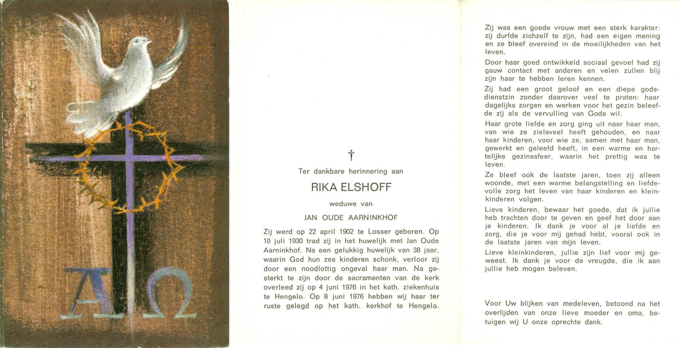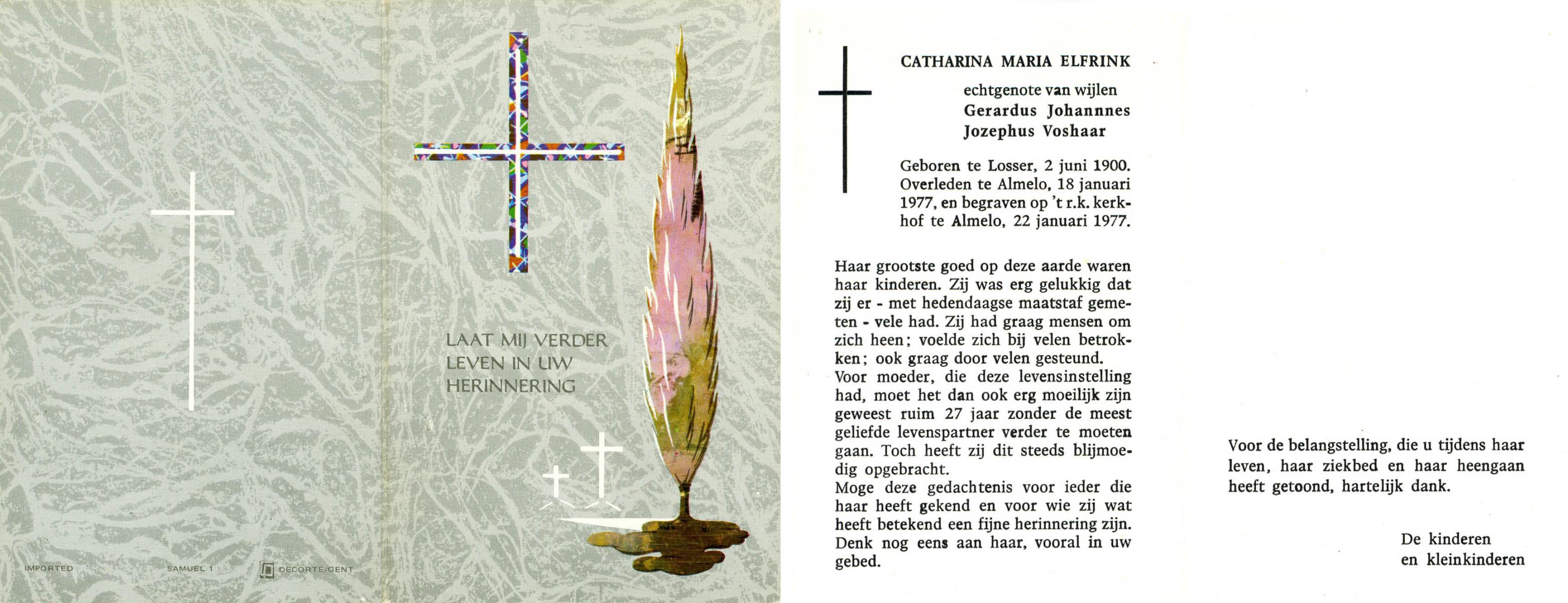 ELFRINK, Catharina Maria, geboren op 2-6-1900 te Losser, overleden op 18-1-1977 te Almelo op 76-jarige leeftijd, begraven op 22-1-1977 te Almelo.