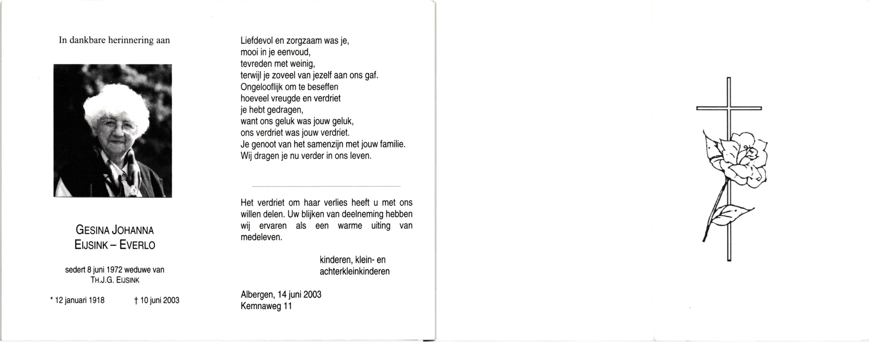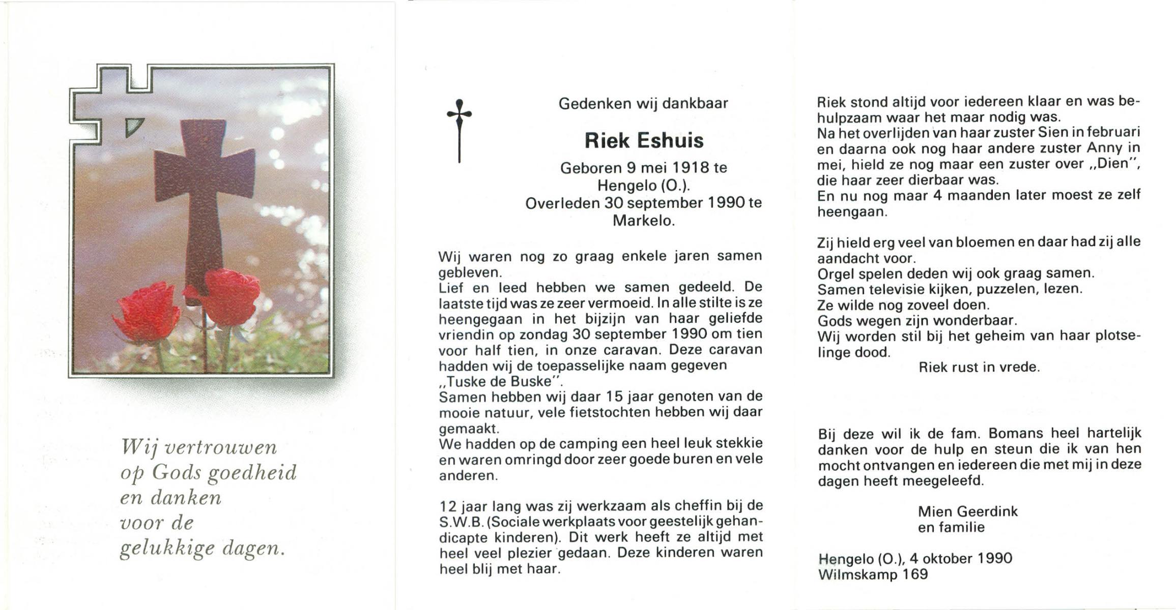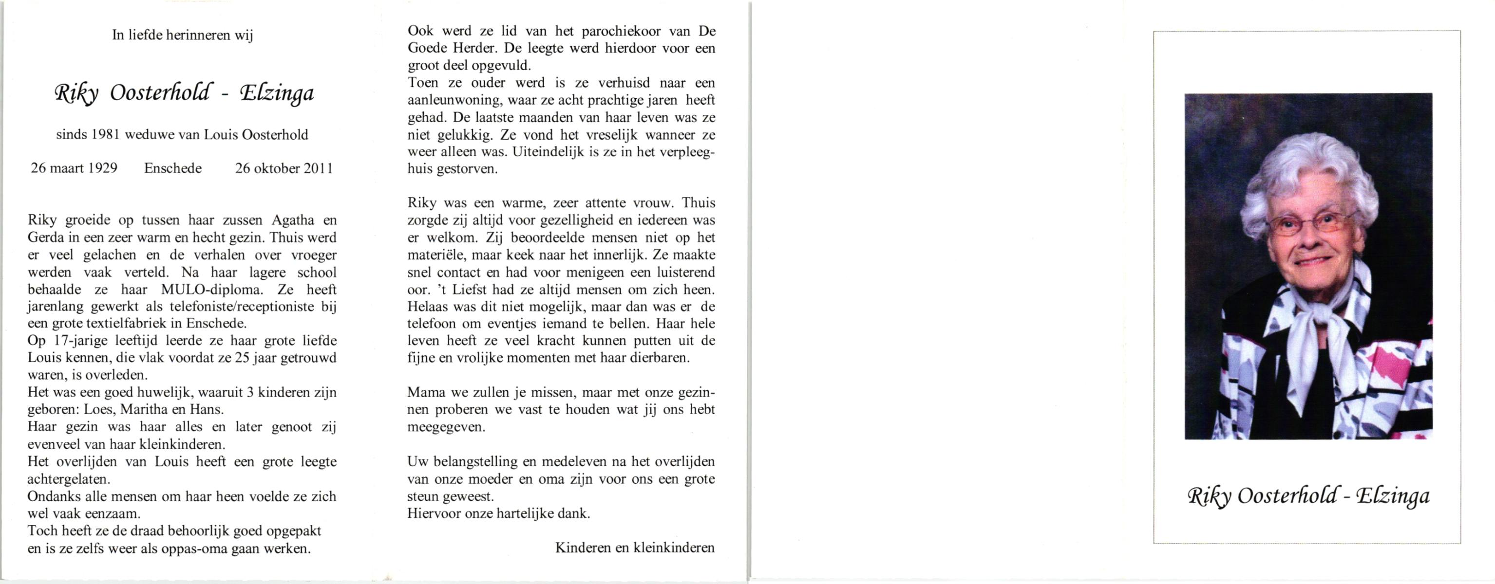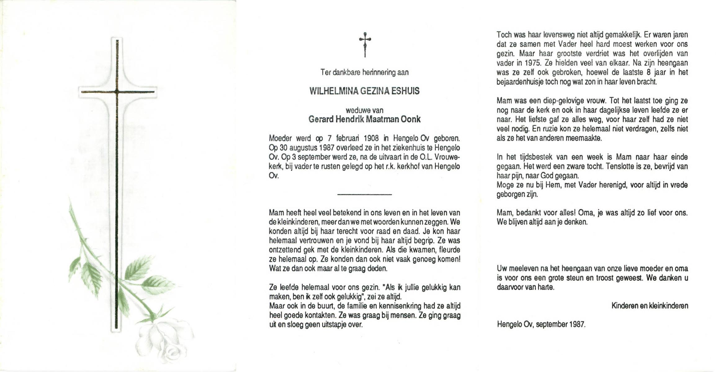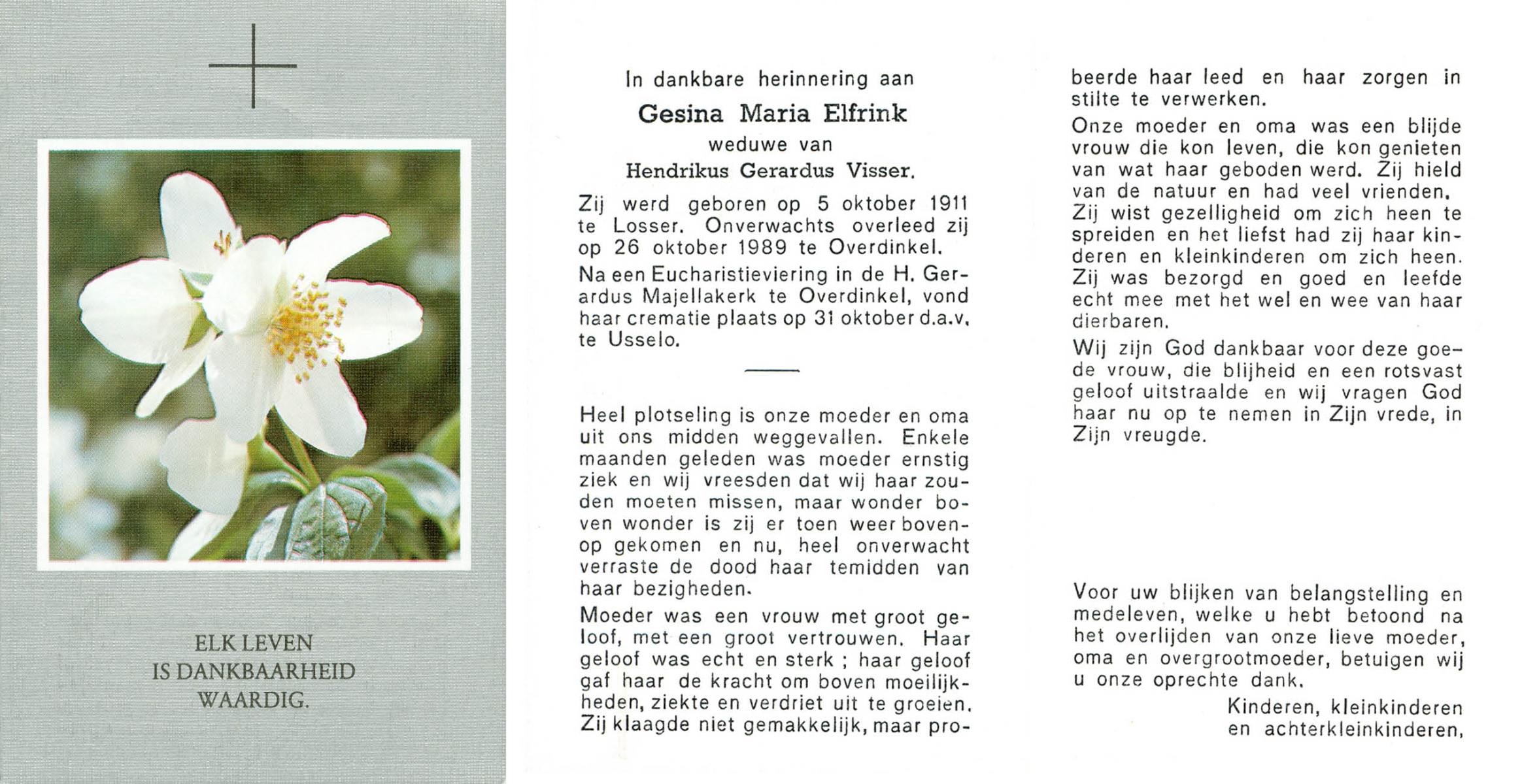ELFRINK, Gesina Maria, geboren op 5-10-1911 te Losser, overleden op 26-10-1989 te Overdinkel op 78-jarige leeftijd, gecremeerd op 31-10-1989 te Usselo.