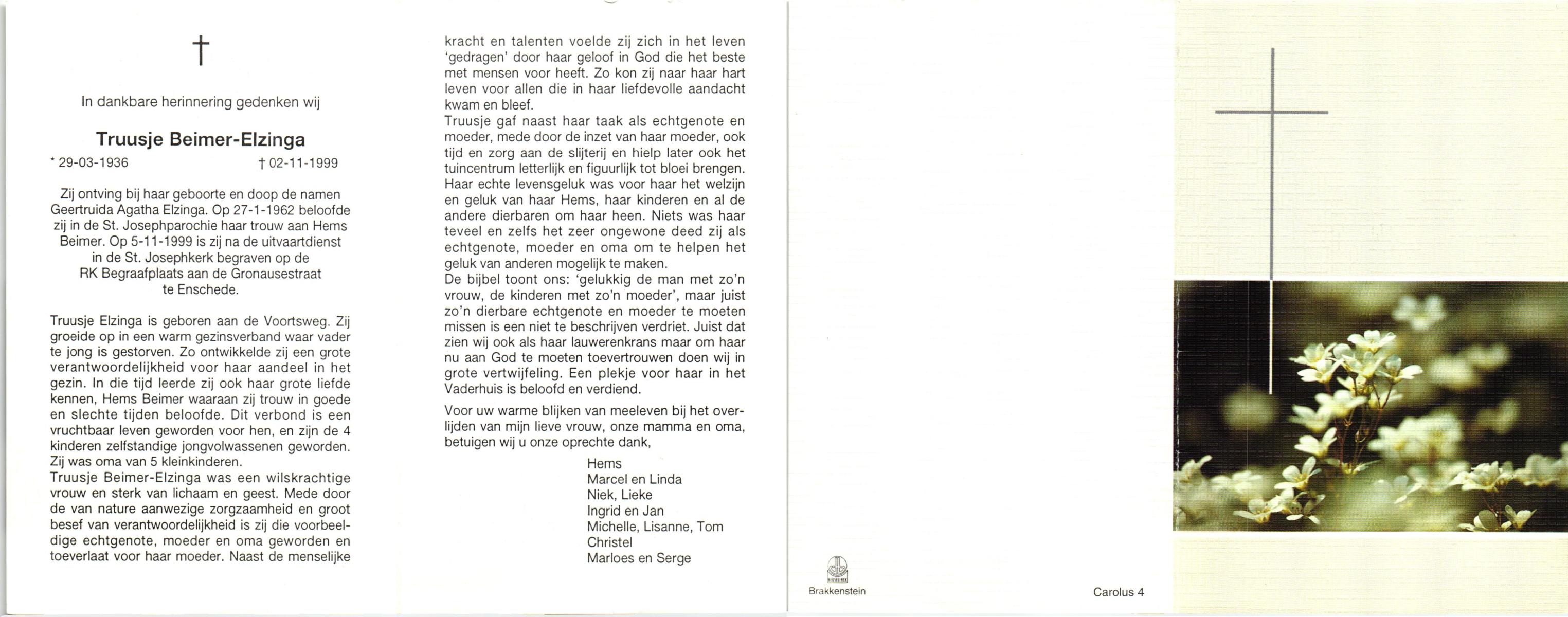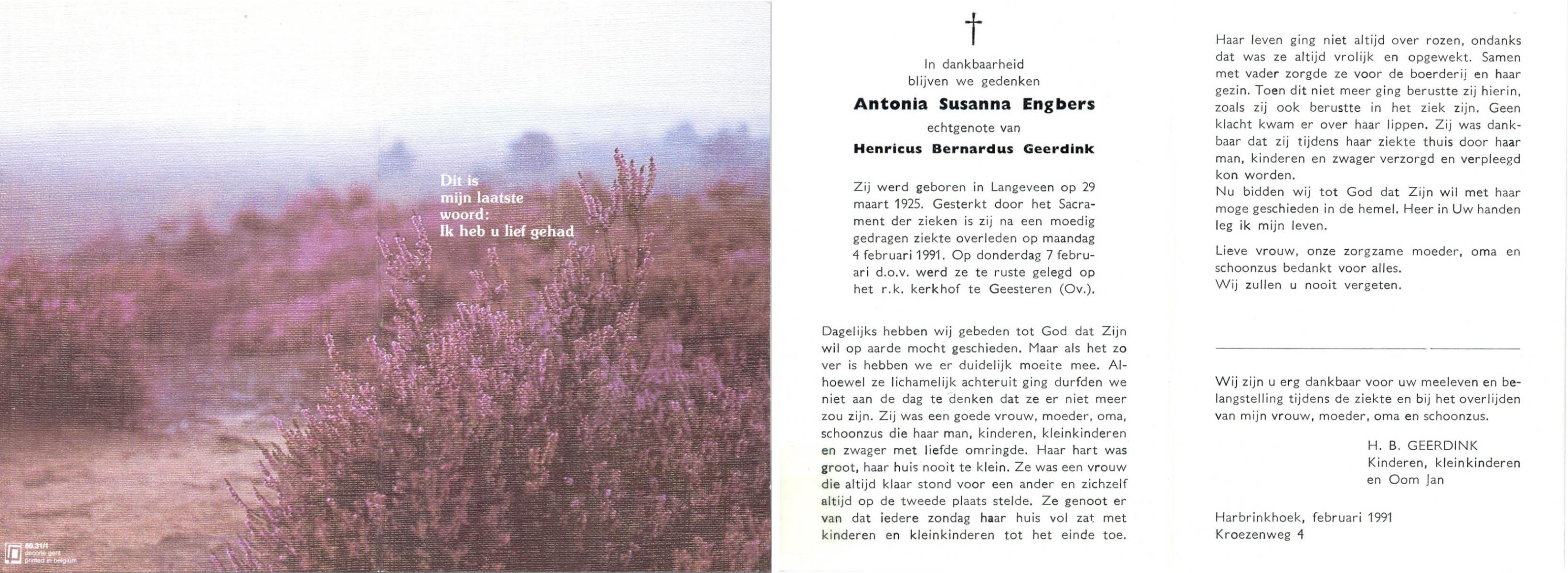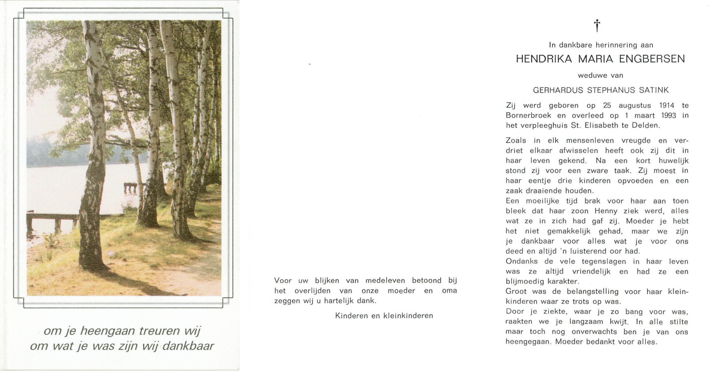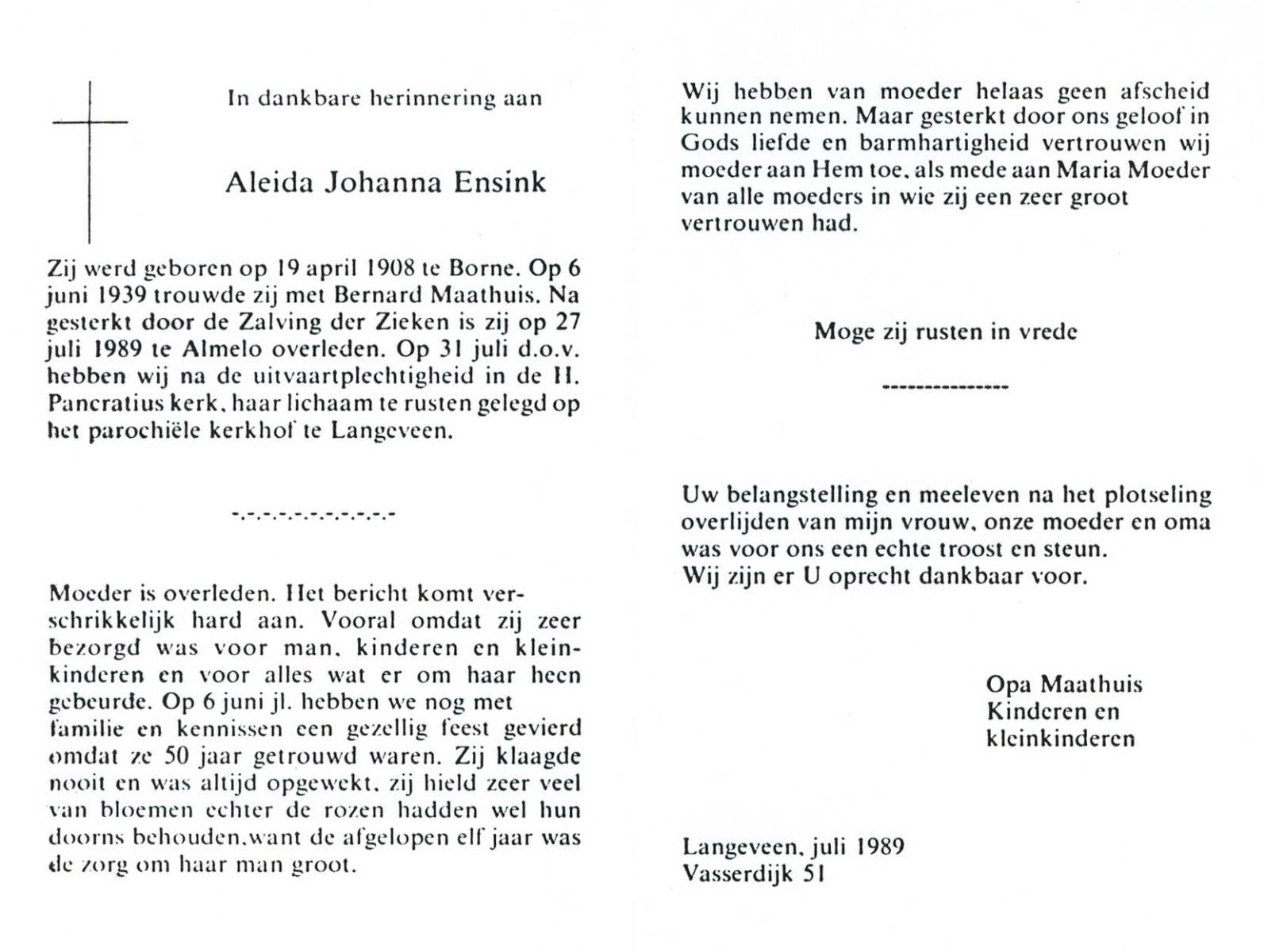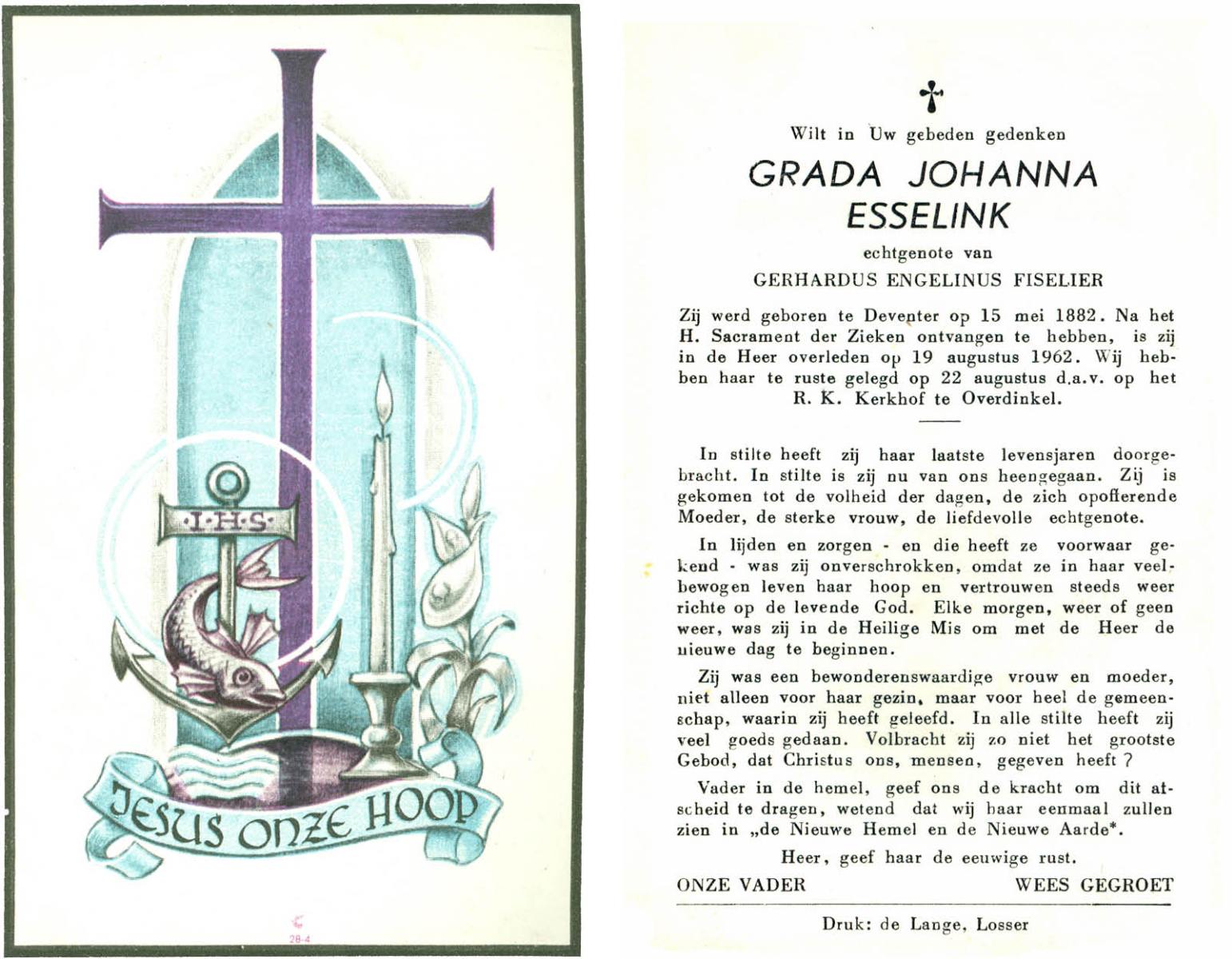 ELFRINK, Gesina Maria, geboren op 5-10-1911 te Losser, overleden op 26-10-1989 te Overdinkel op 78-jarige leeftijd, gecremeerd op 31-10-1989 te Usselo.