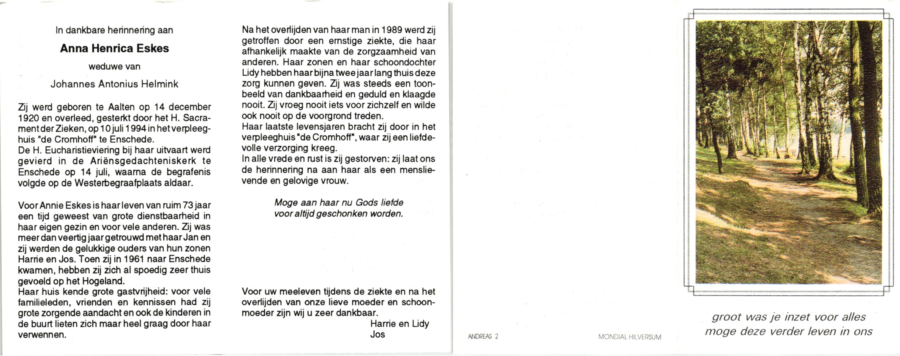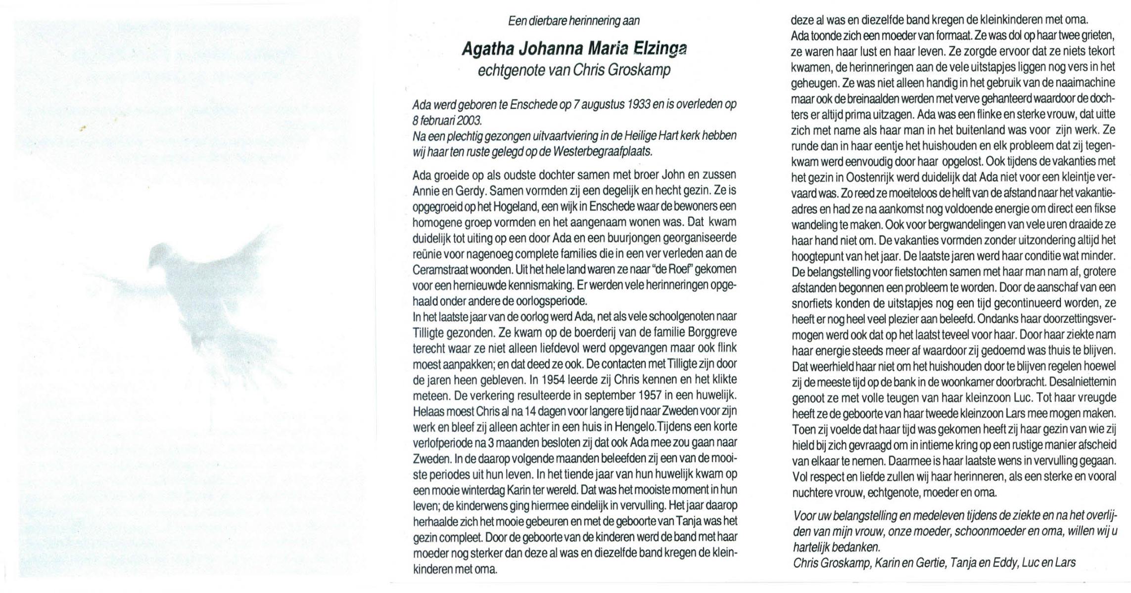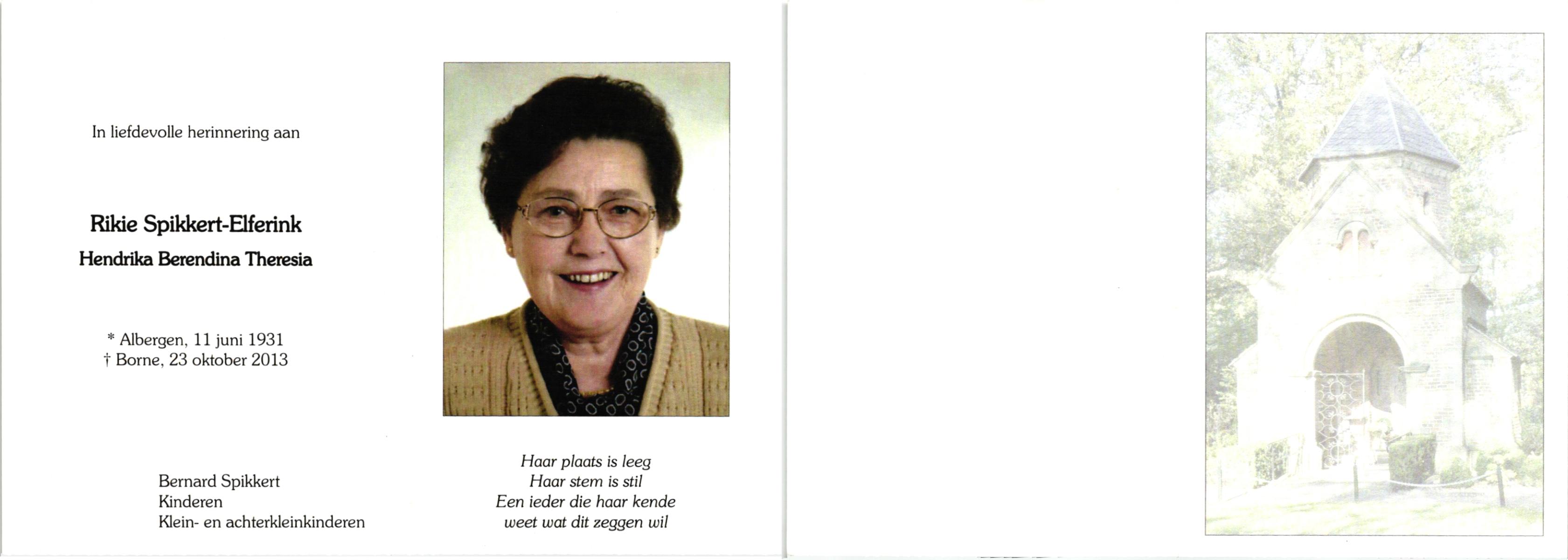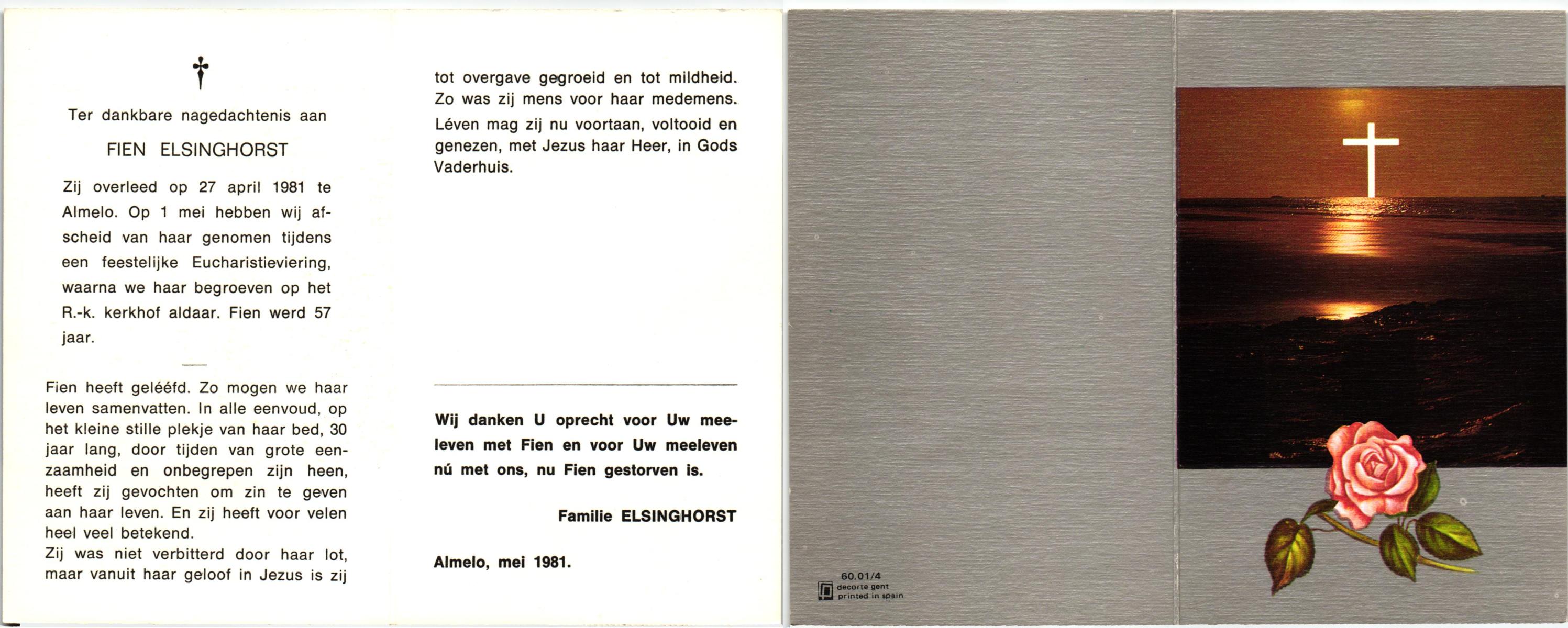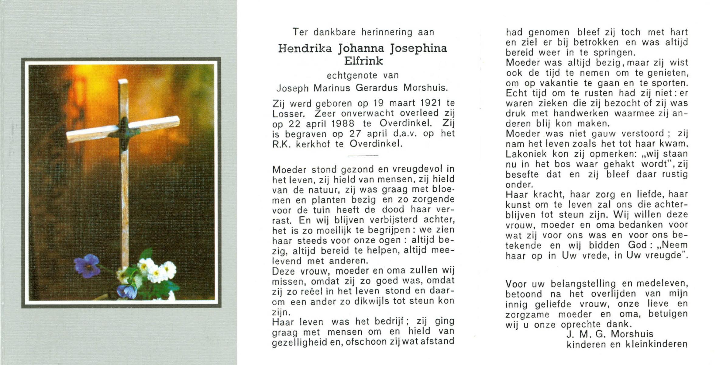 ELFRINK, Hendrika Johanna Josephina, geboren op 19-3-1921 te Losser, overleden op 22-4-1988 te Overdinkel op 67-jarige leeftijd, begraven op 27-4-1988 te Overdinkel.