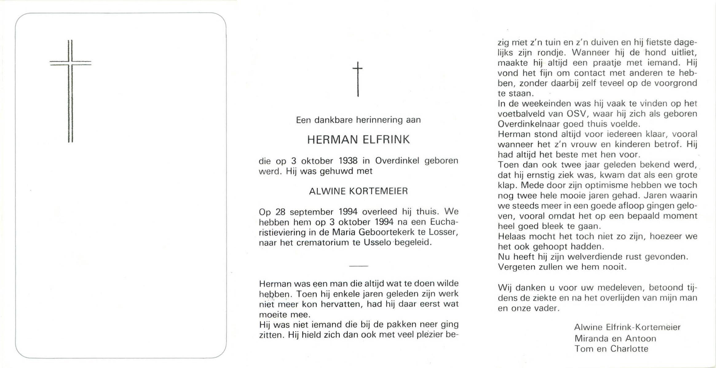 ELFRINK, Herman, geboren op 3-10-1938 te Overdinkel, overleden op 28-9-1994 op 55-jarige leeftijd, gecremeerd op 3-10-1994 te Usselo.