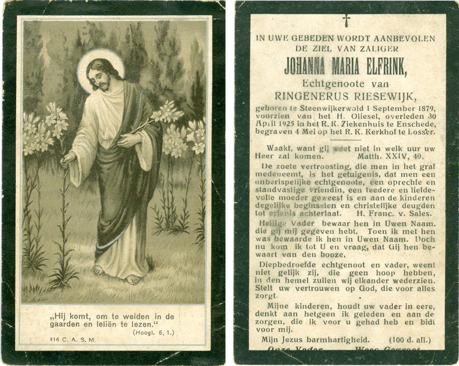 ELFRINK, Johanna Maria, geboren op 01-09-1879 te Steenwijkerwold, overleden op 30-4-1925 te Enschede op 46-jarige leeftijd, begraven op 4-5-1925 te Losser.