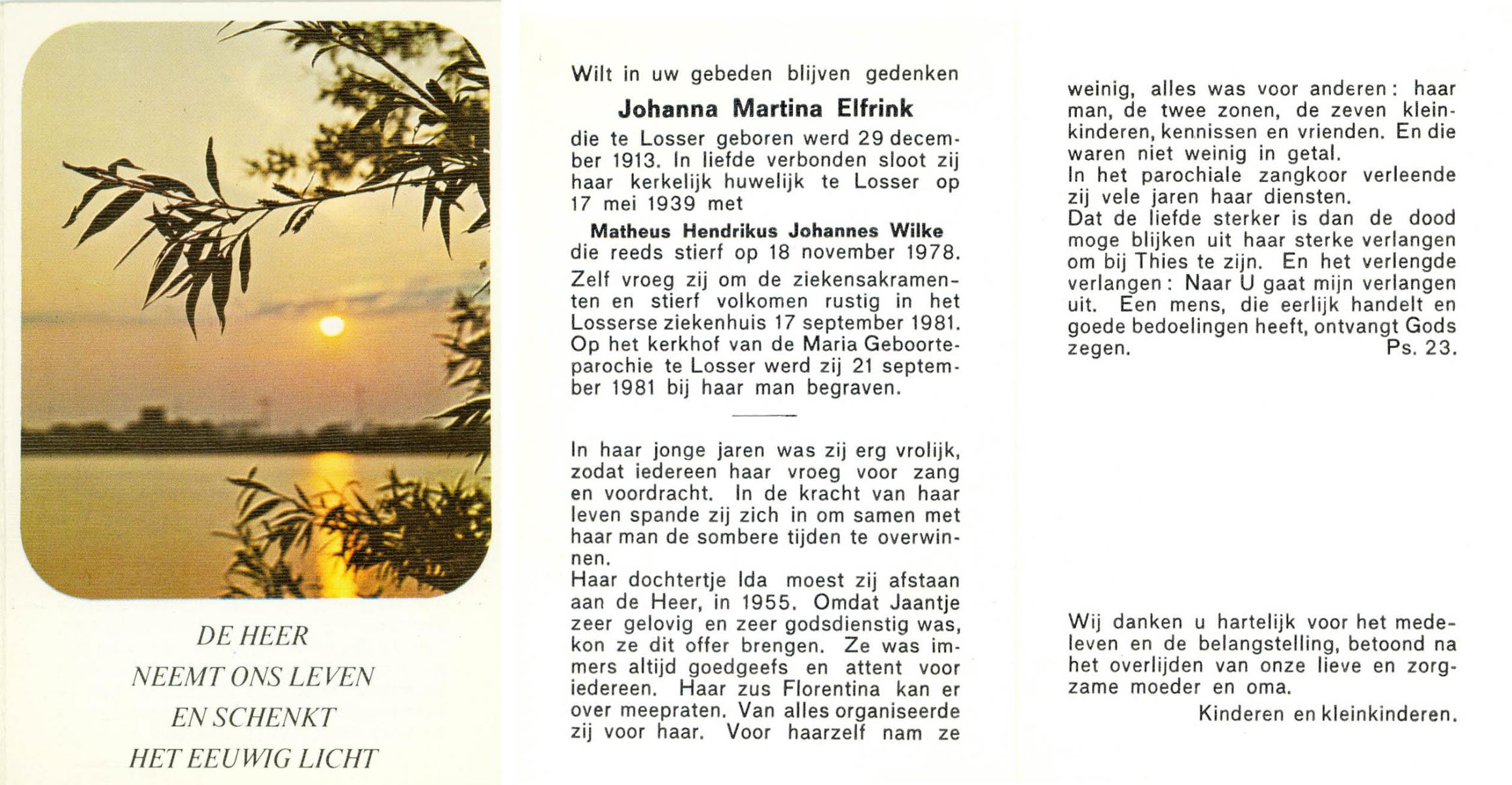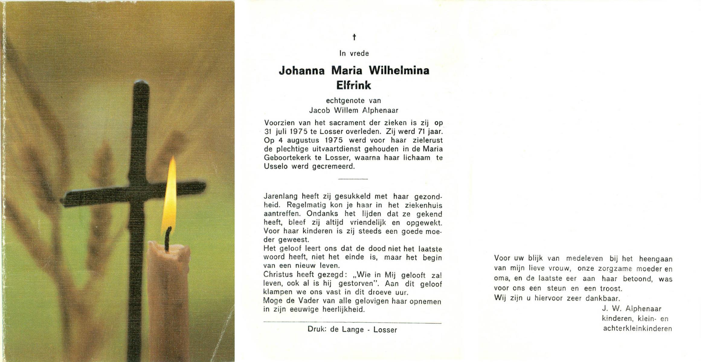 ELFRINK, Johanna Martina, geboren op 29-12-1913 te Losser, overleden op 17-9-1981 te Losser op 67-jarige leeftijd, begraven op 21-9-1981 te Losser.