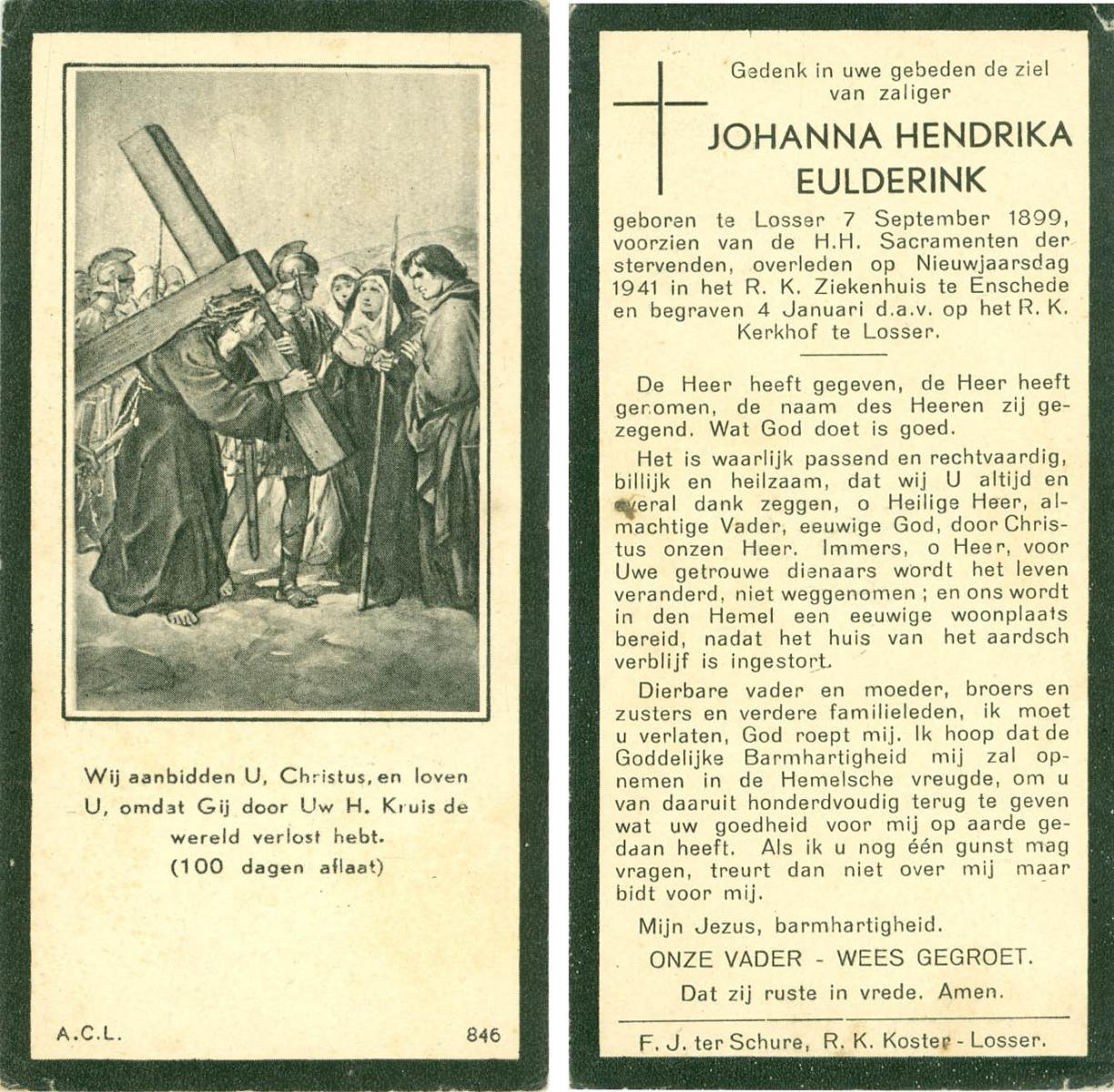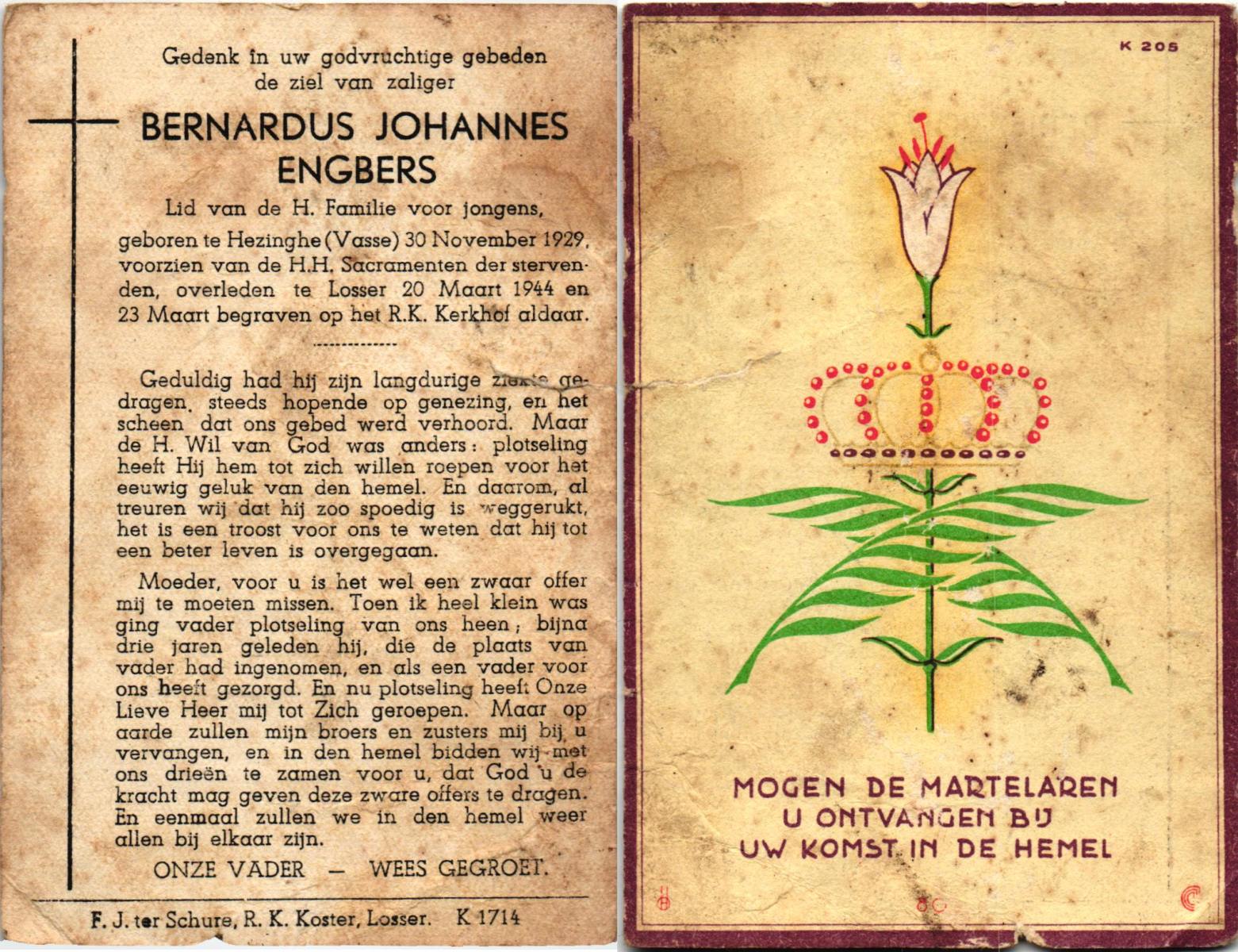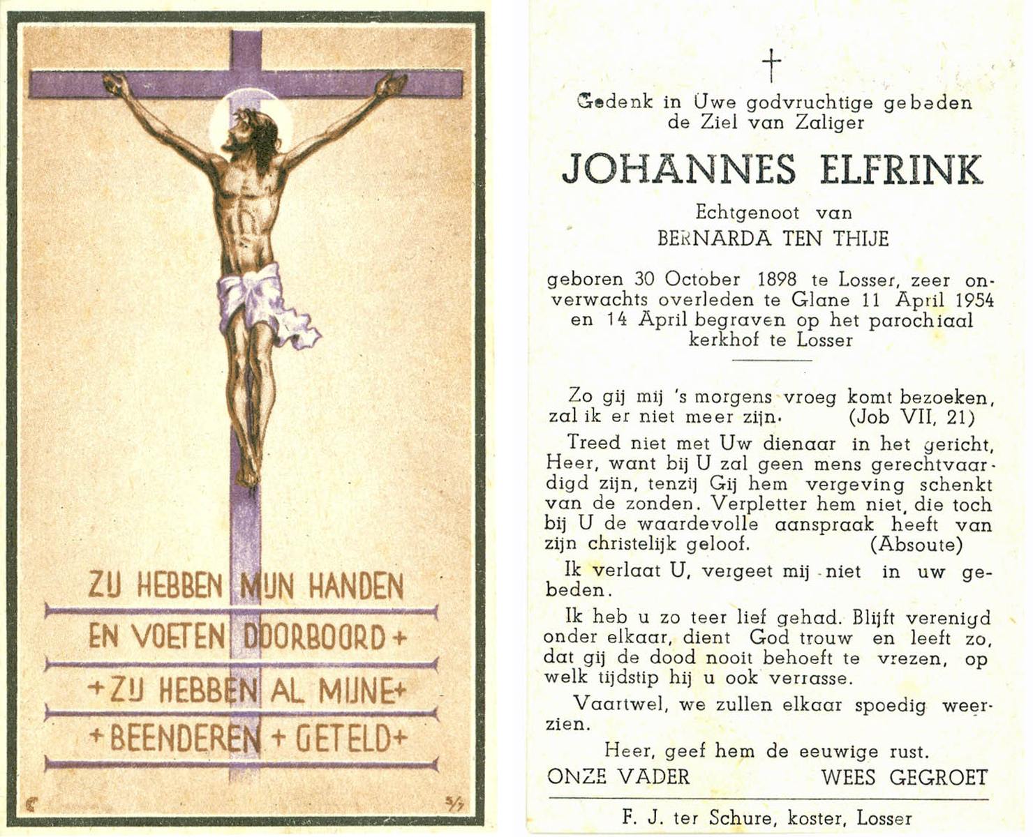 ELFRINK, Johannes, geboren op 30-10-1898 te Losser, overleden op 11-4-1954 te Glane op 55-jarige leeftijd, begraven op 14-4-1954 te Losser.