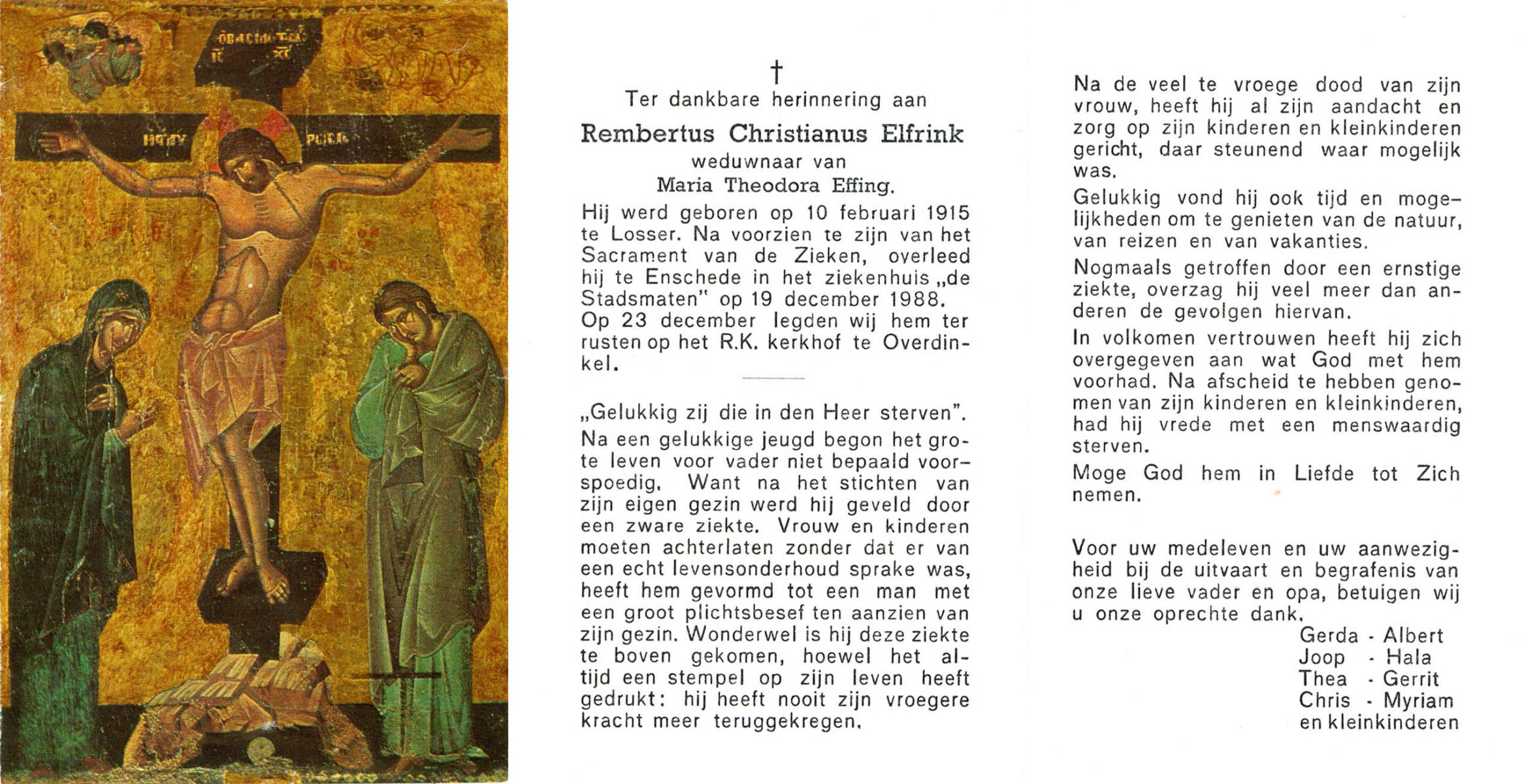 ELFRINK, Rembertus Christianus, geboren op 10-2-1915 te Losser, overleden op 19-12-1988 te Enschede op 73-jarige leeftijd, begraven op 23-12-1988 te Overdinkel.