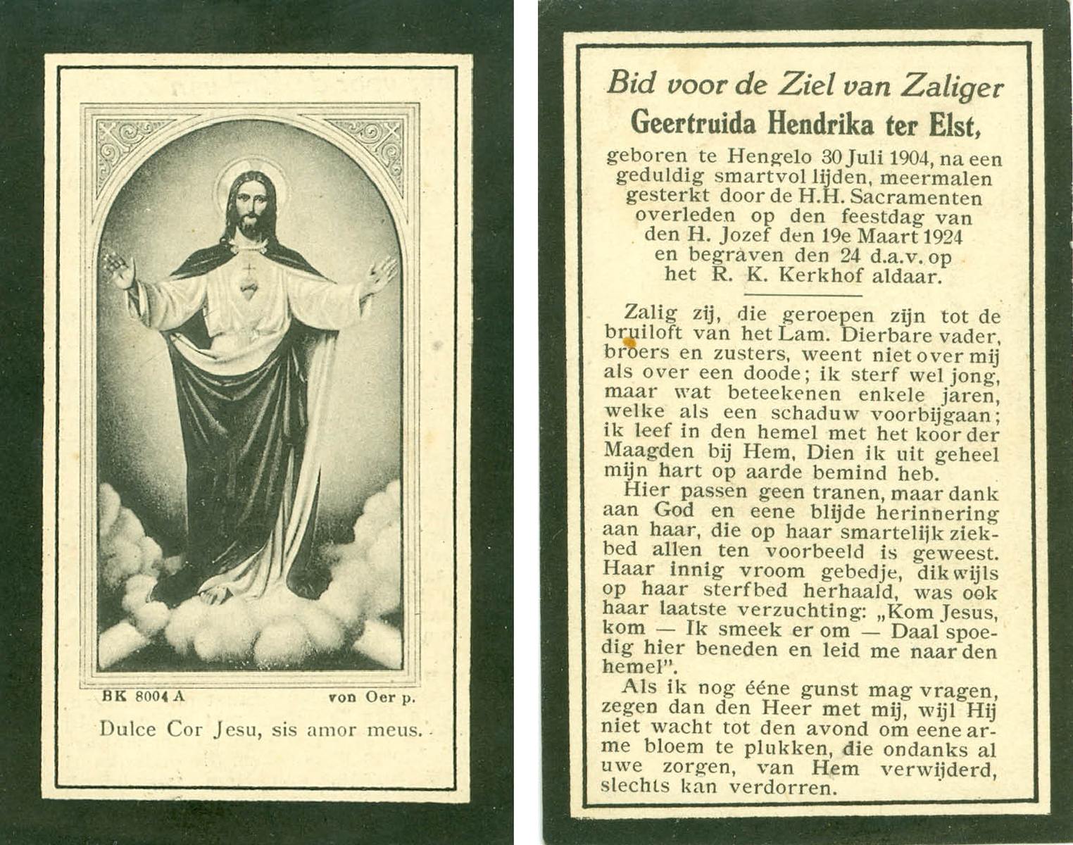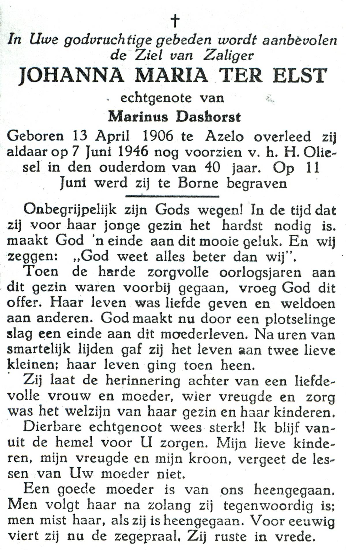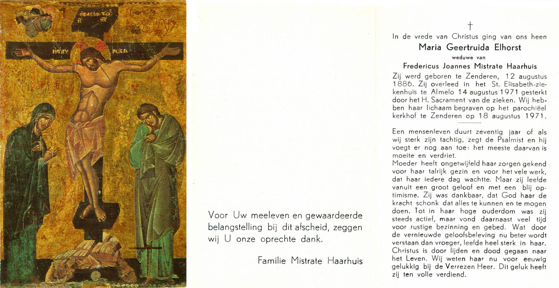 ELHORST, Maria Geertruida, geboren op 12-08-1886 te Zenderen, overleden op 14-8-1971 te Almelo op 85-jarige leeftijd, begraven op 18-8-1971 te Zenderen.