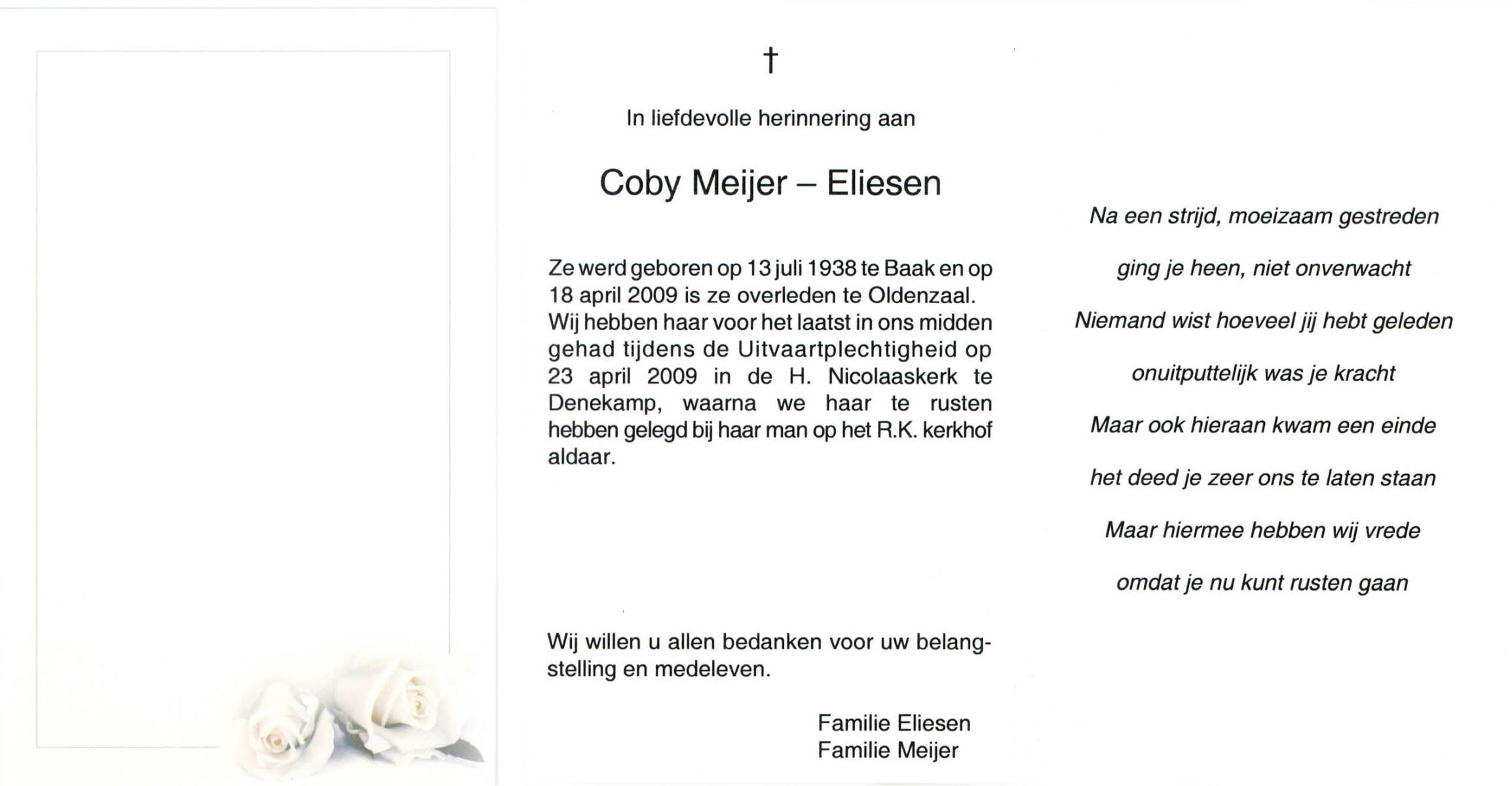 ELIESEN, Coby, geboren op 13-7-1938 te Braak, overleden op 18-4-2009 te Oldenzaal op 70-jarige leeftijd, begraven op 23-4-2009 te Denekamp.