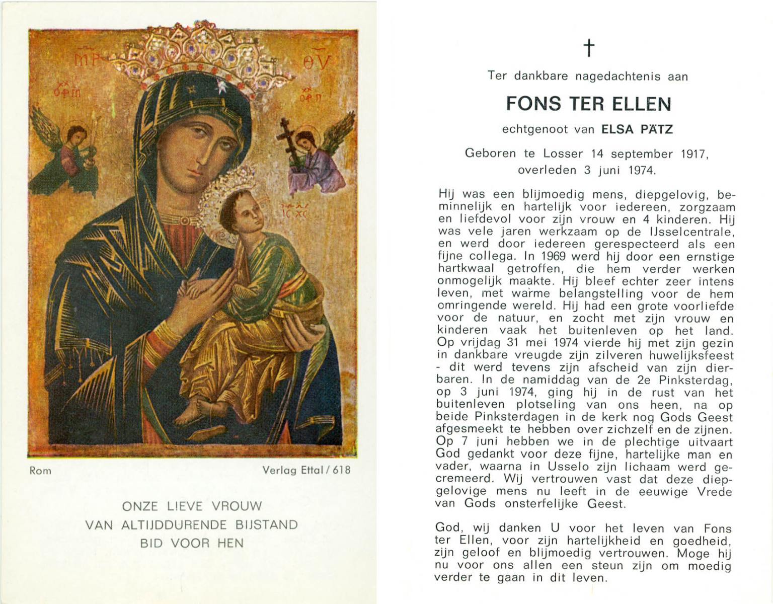 ELLEN, ter, Fons, geboren op 14-9-1917 te Losser, overleden op 3-6-1974 op 56-jarige leeftijd, gecremeerd op 7-6-1974 te Usselo.