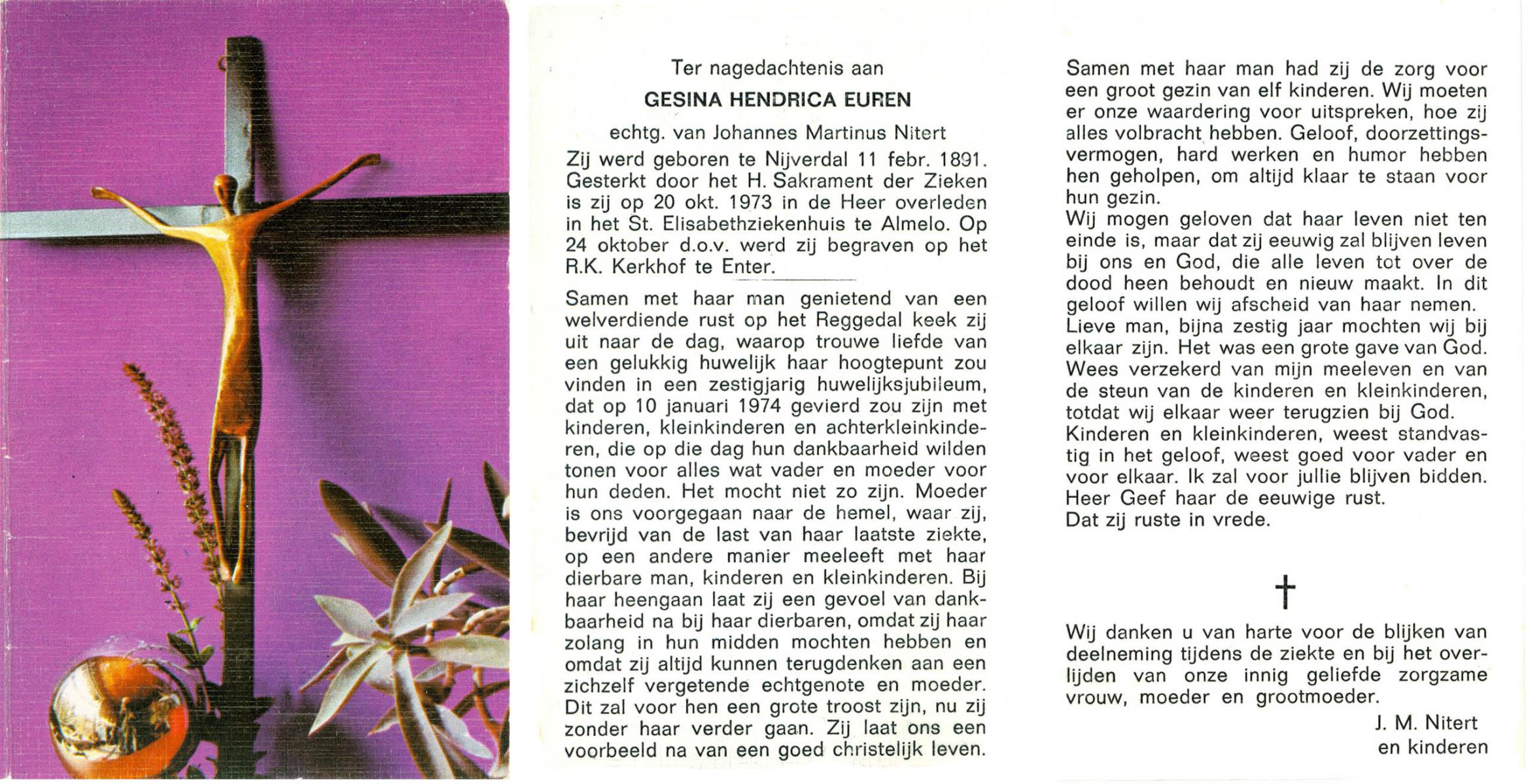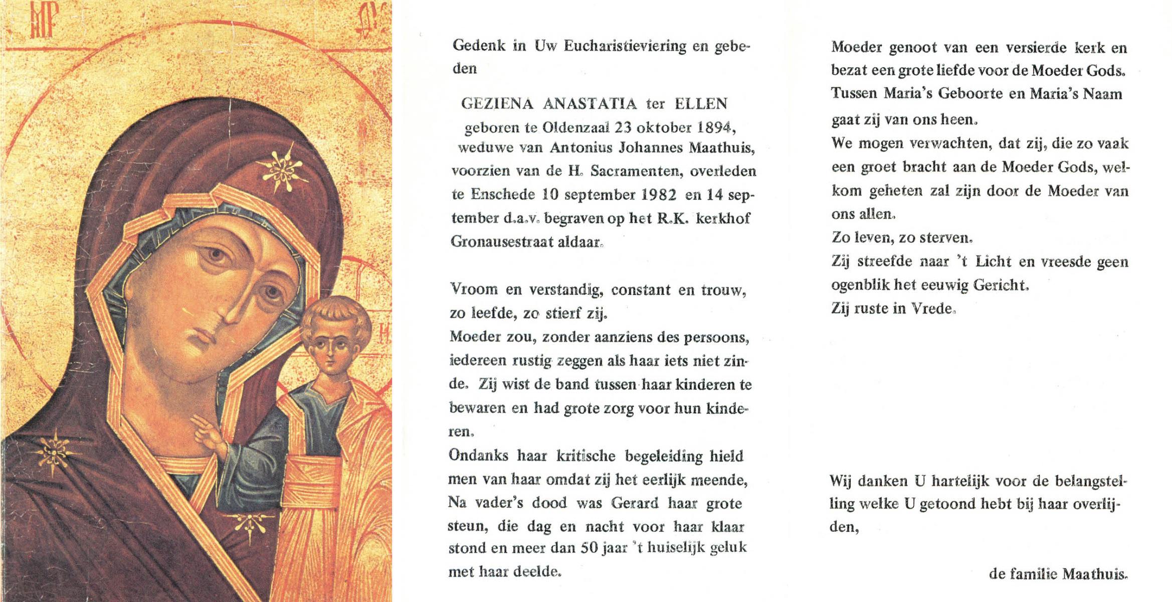 ELLEN, ter, Geziena Anastatia, geboren op 23-10-1894 te Oldenzaal, overleden op 10-9-1982 te Enschede op 87-jarige leeftijd, begraven op 14-9-1982 te Enschede.