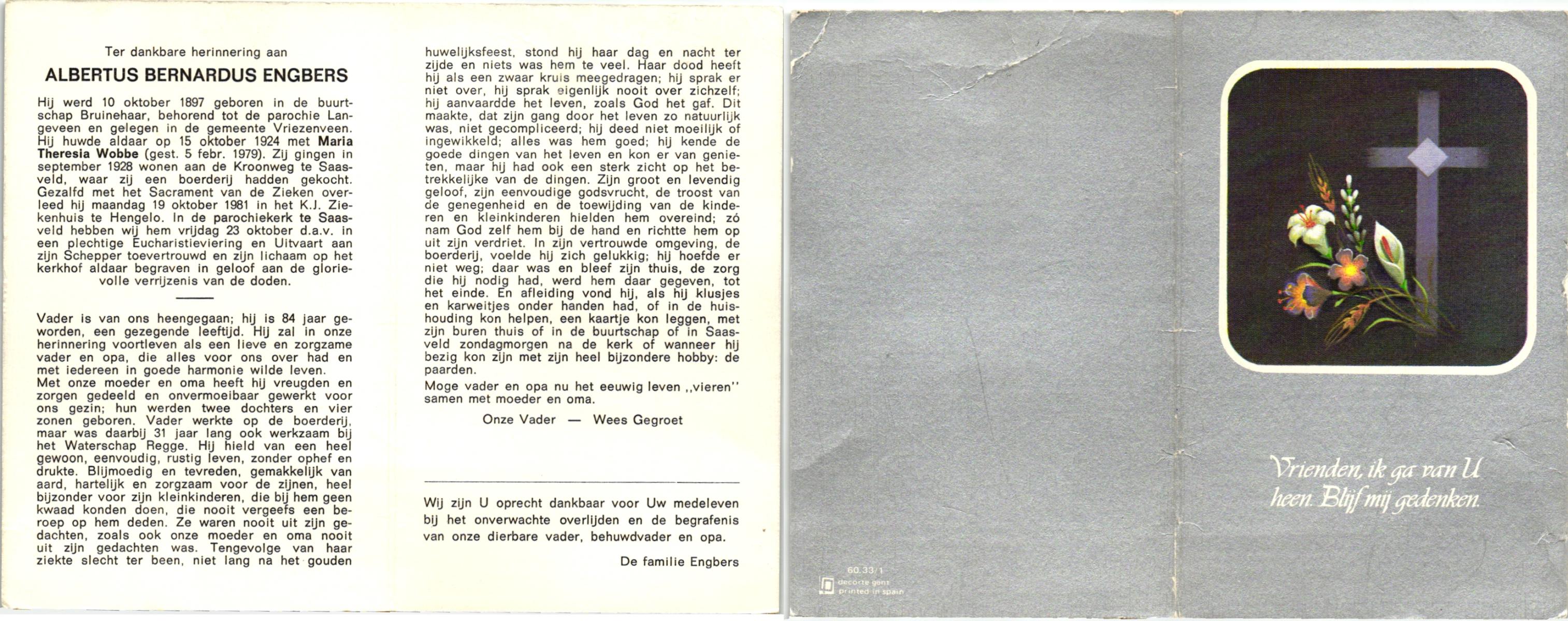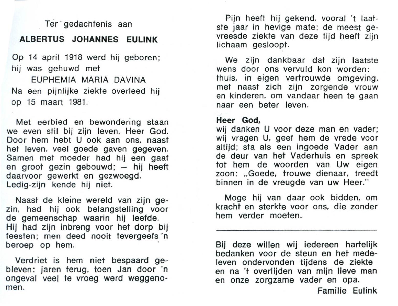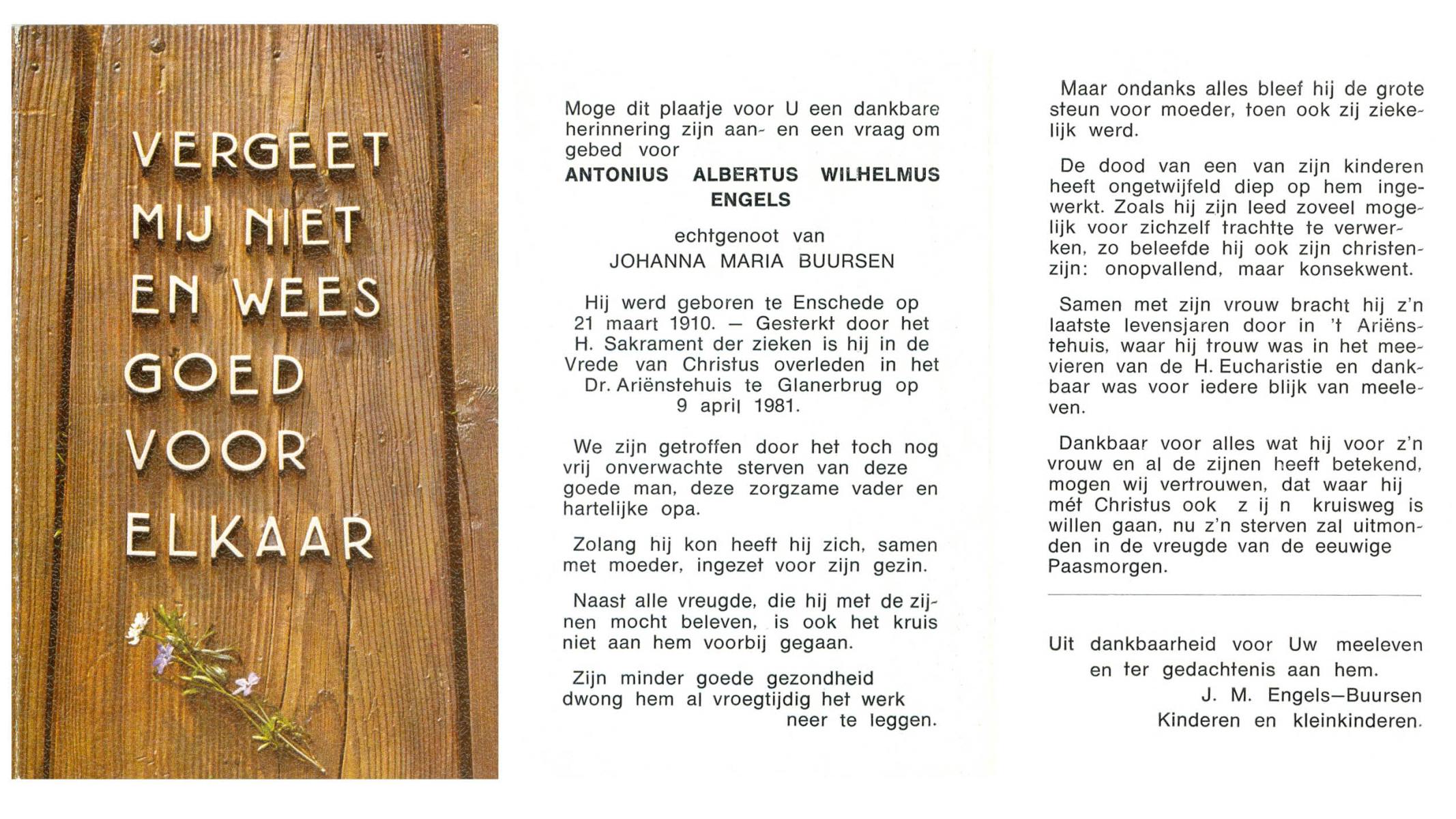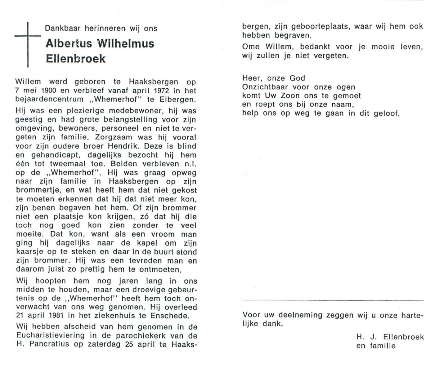 ELLENBROEK, Albertus Wilhelmus, geboren op 7-5-1900 te Haaksbergen, overleden op 21-4-1981 te Enschede op 80-jarige leeftijd, begraven op 25-4-1981 te Haaksbergen.