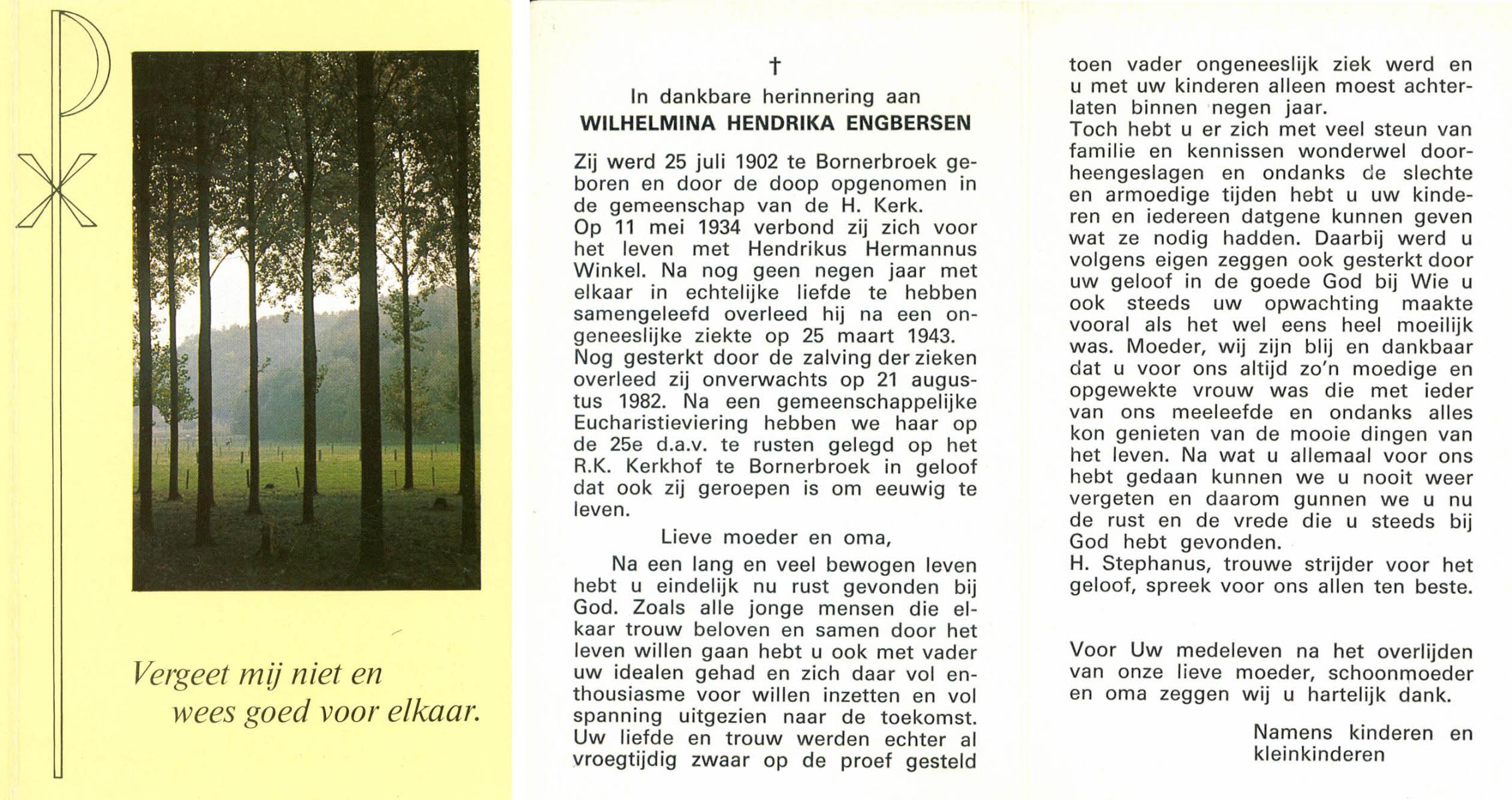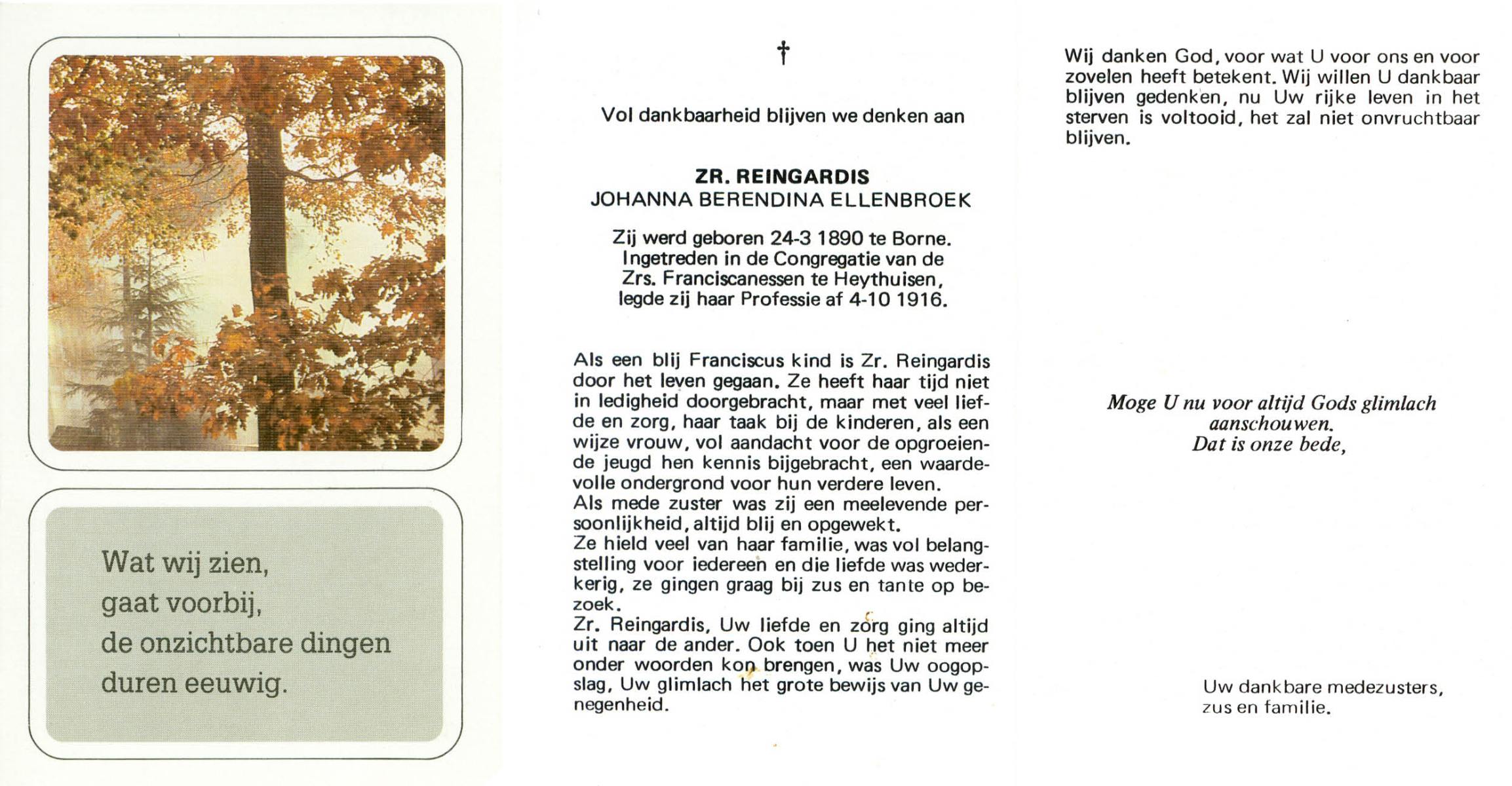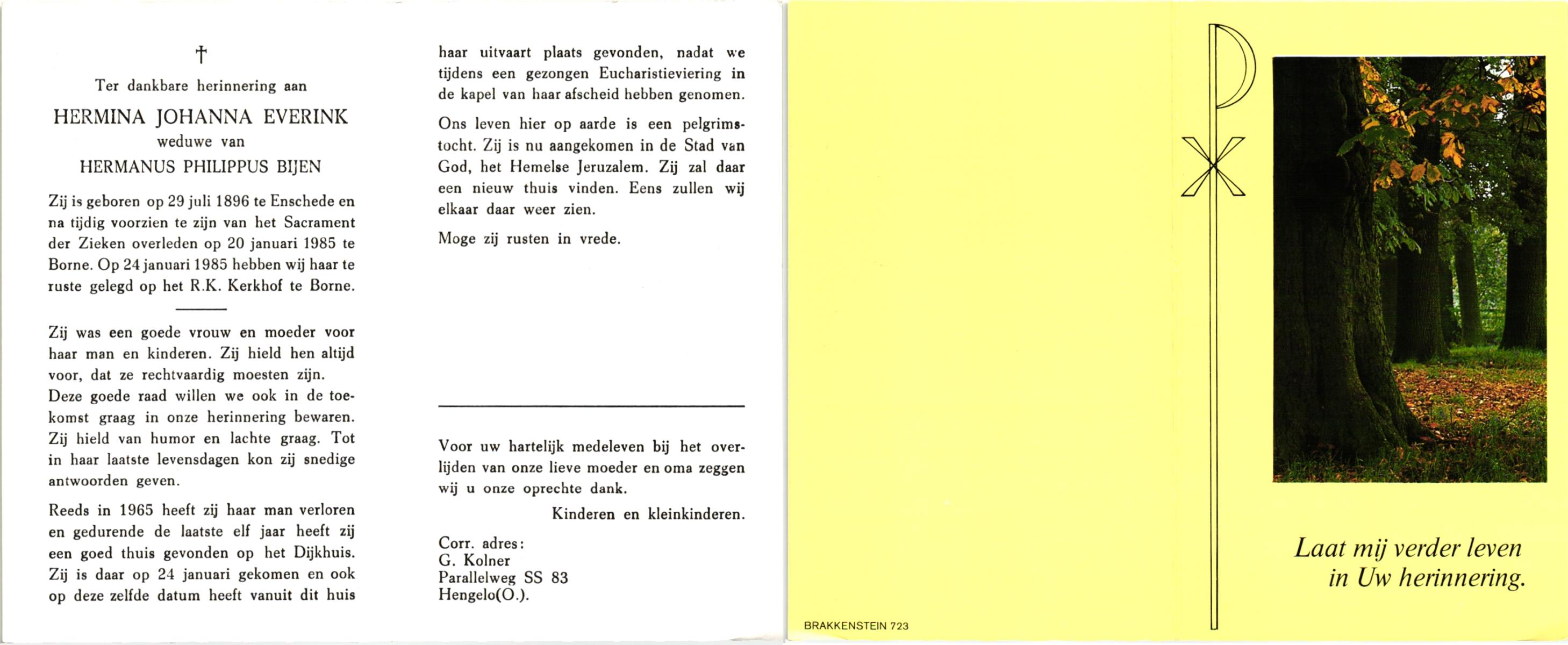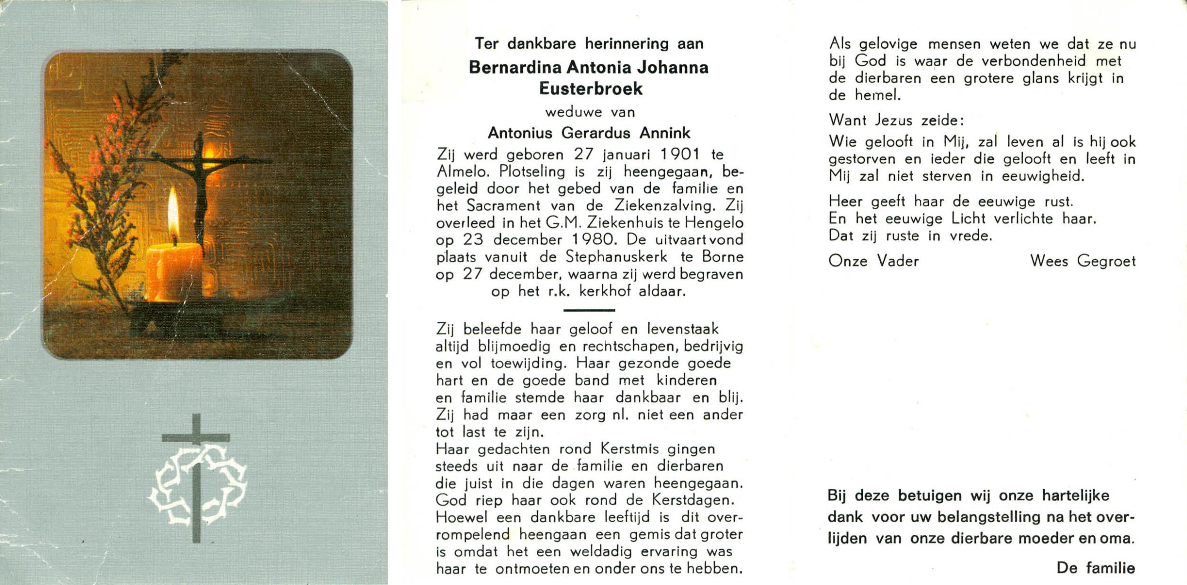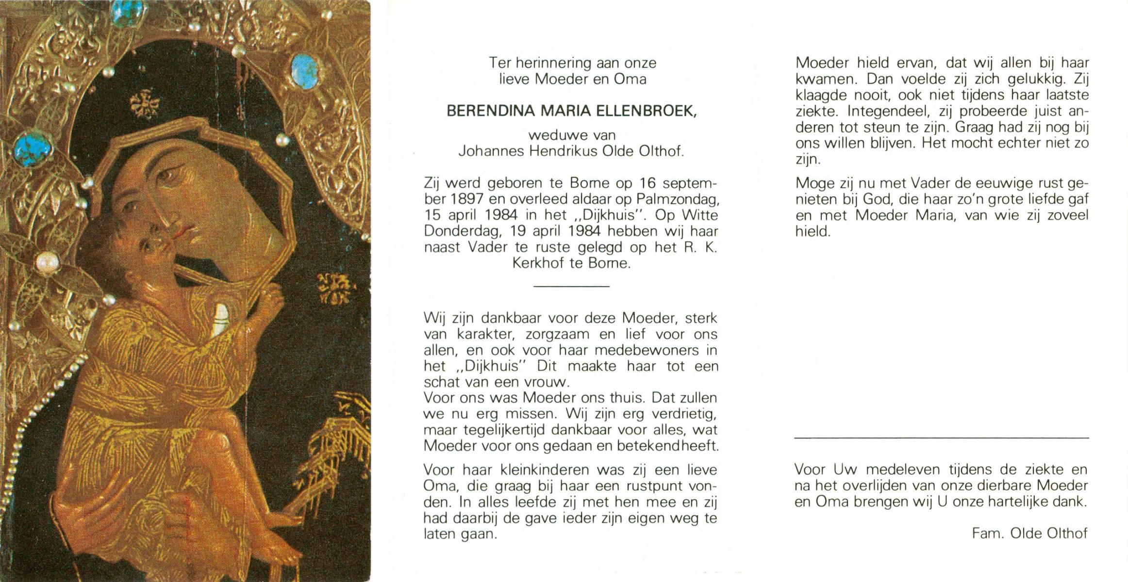 ELLENBROEK, Berendina Maria, geboren op 16-09-1897 te Borne, overleden op 15-4-1984 te Borne op 86-jarige leeftijd, begraven op 19-4-1984 te Borne.