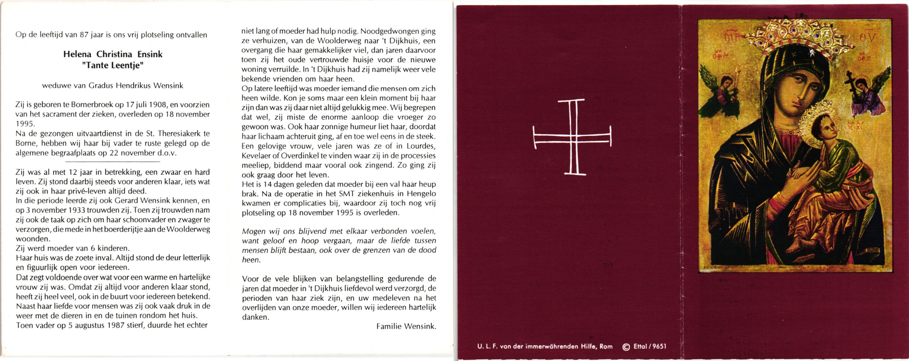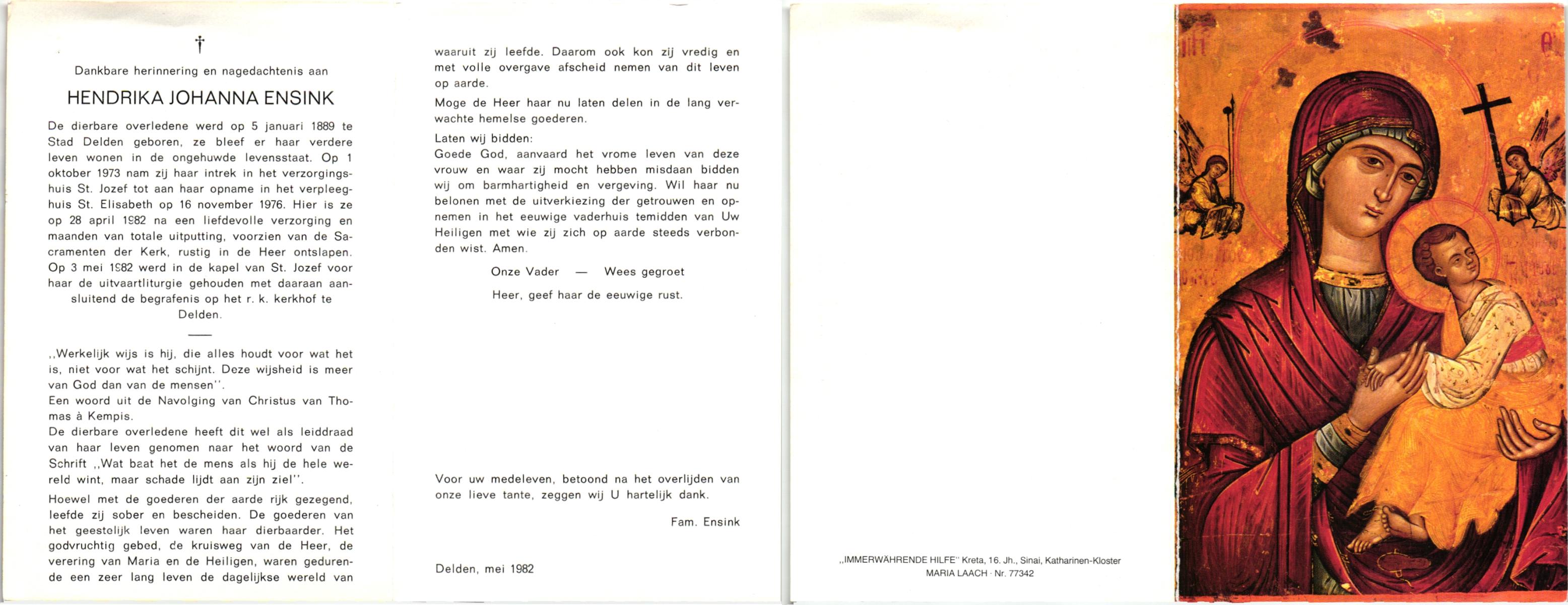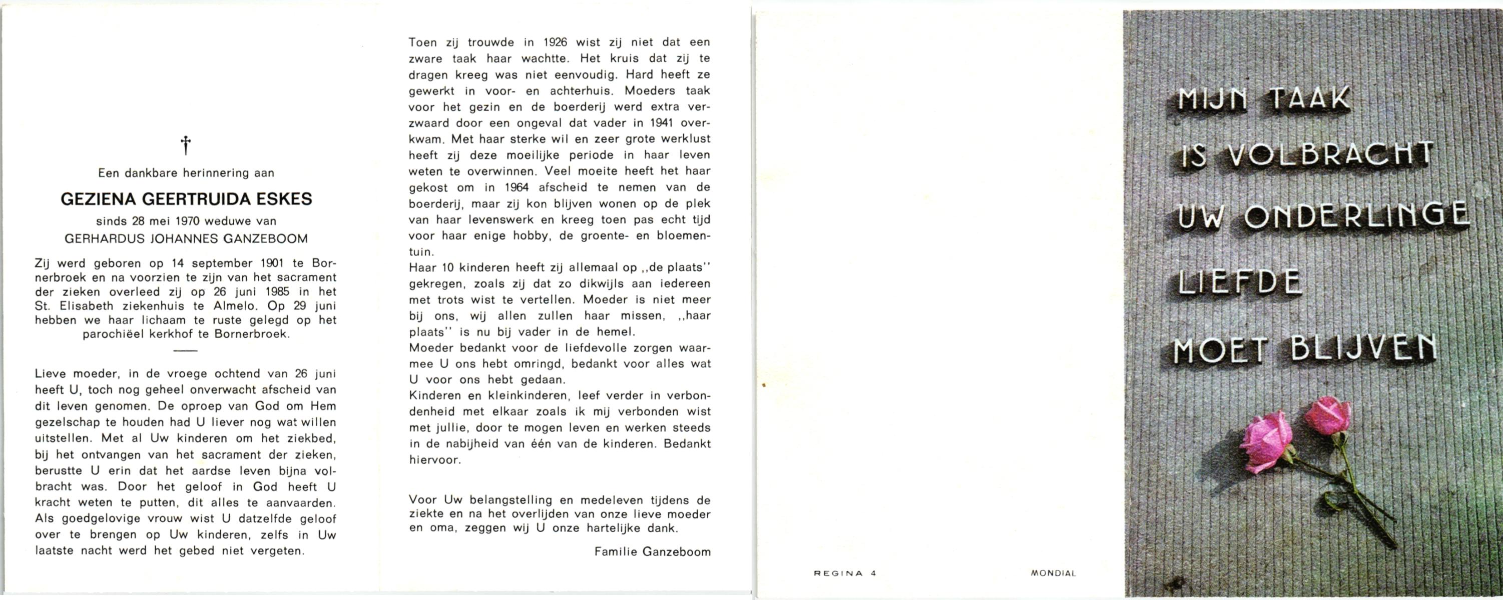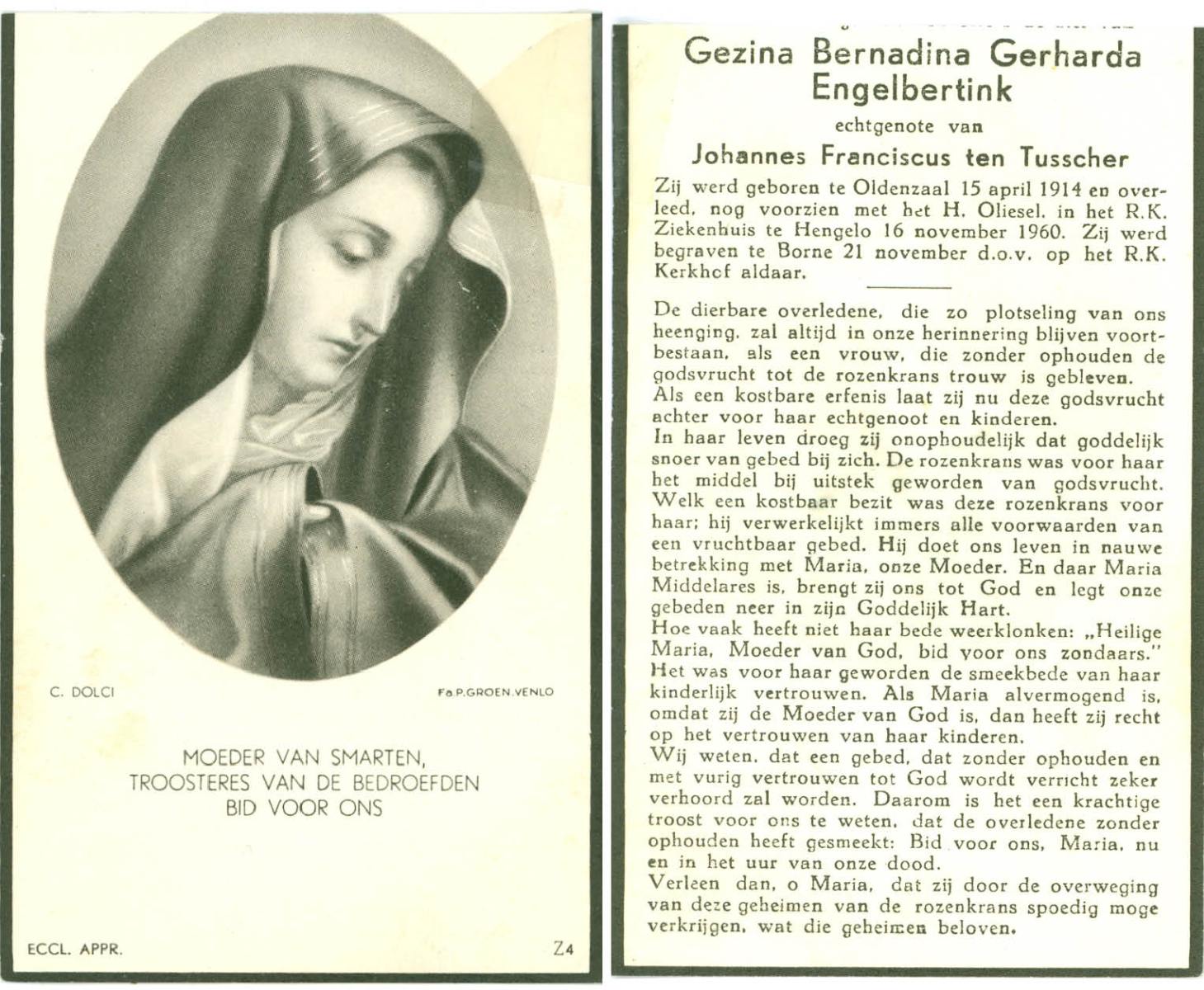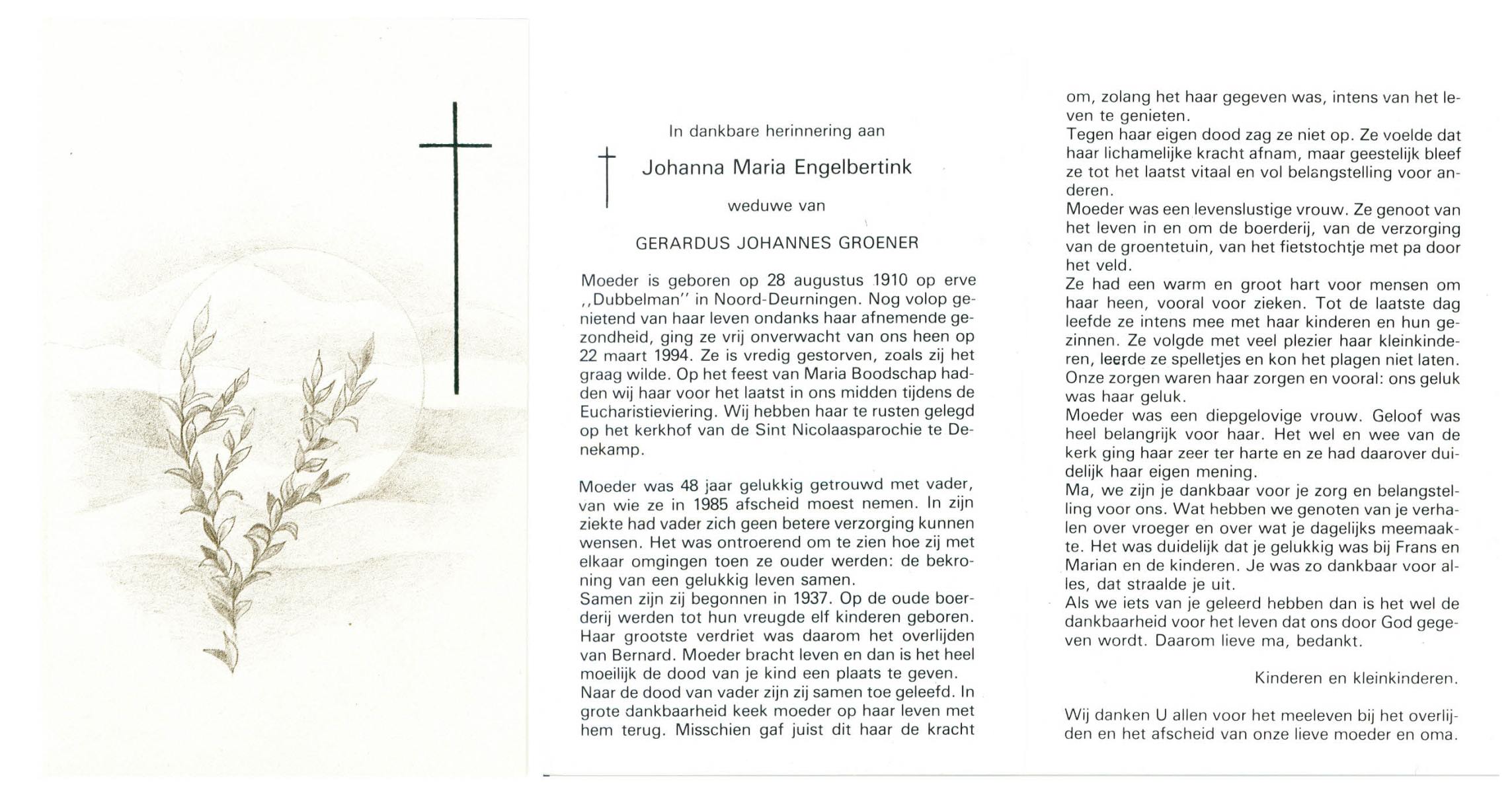 ELLENBROEK, Berendina Maria, geboren op 16-09-1897 te Borne, overleden op 15-4-1984 te Borne op 86-jarige leeftijd, begraven op 19-4-1984 te Borne.