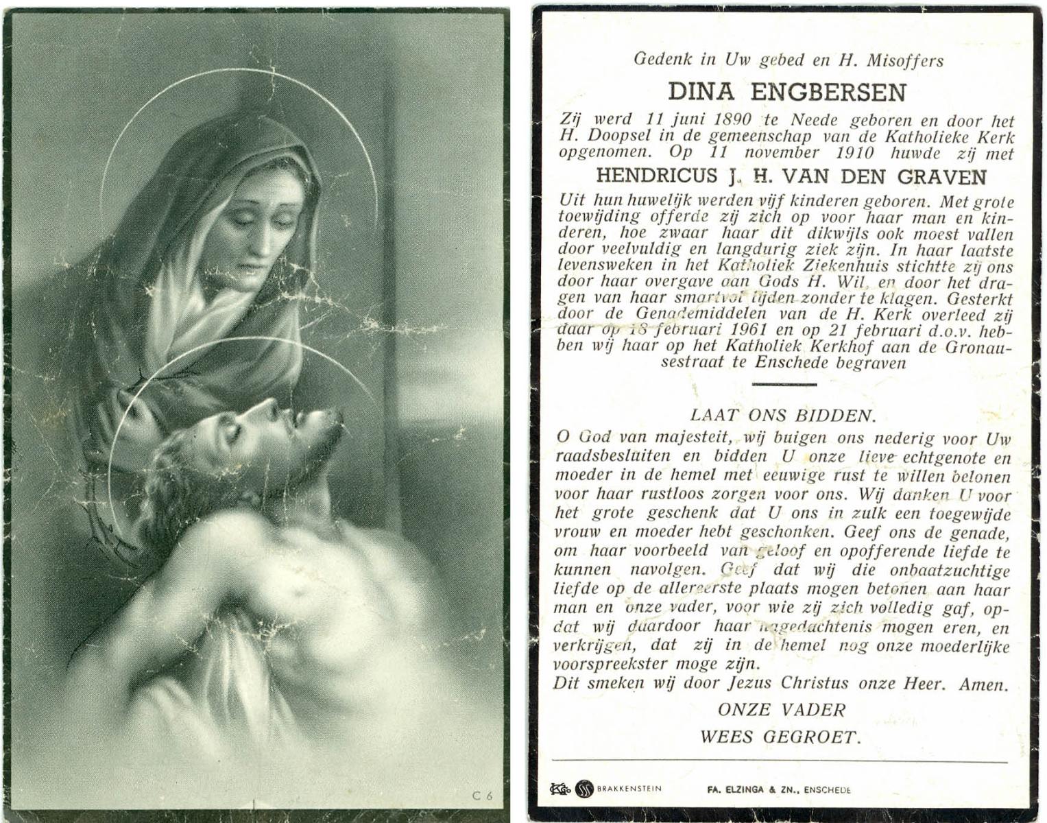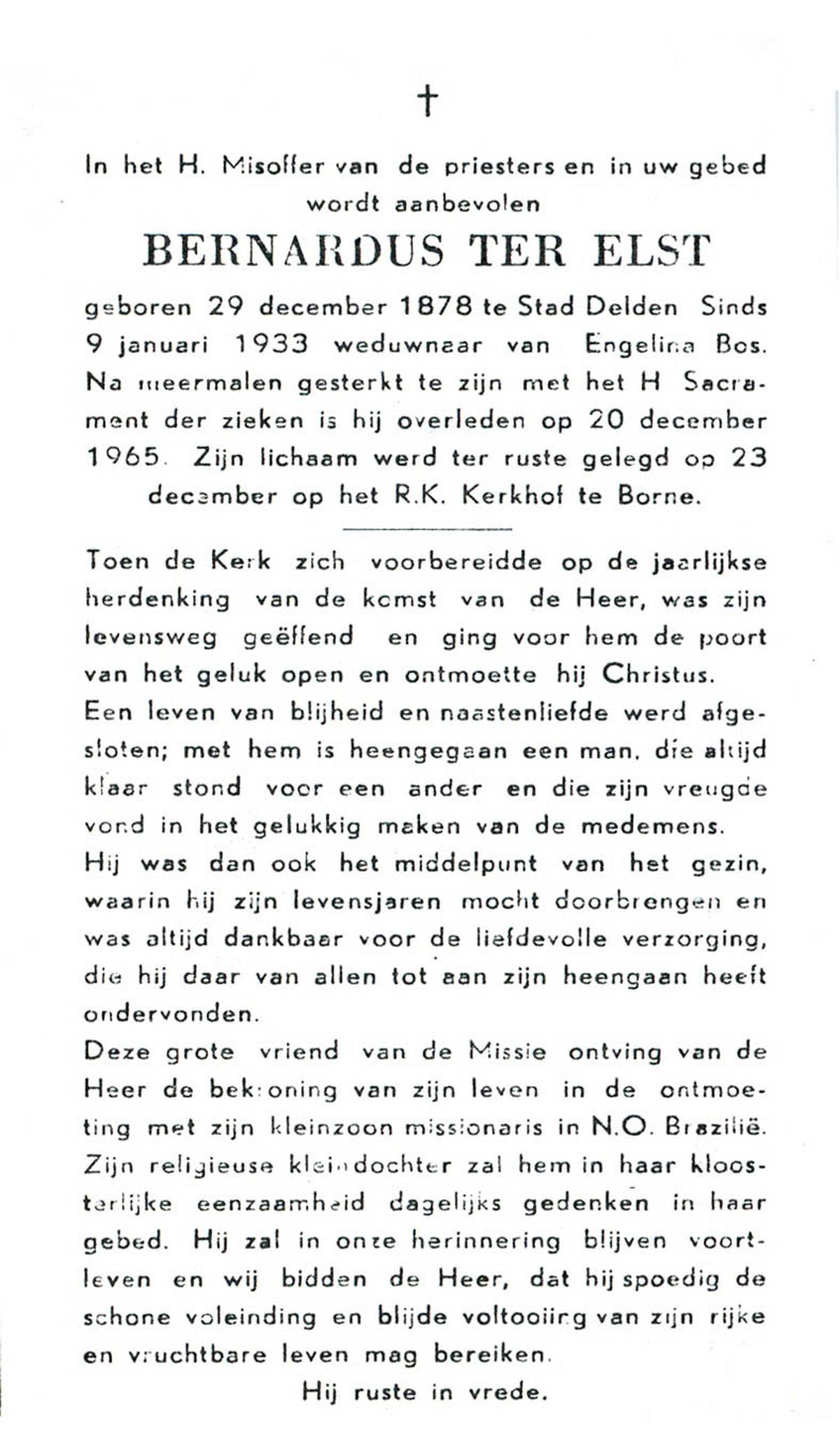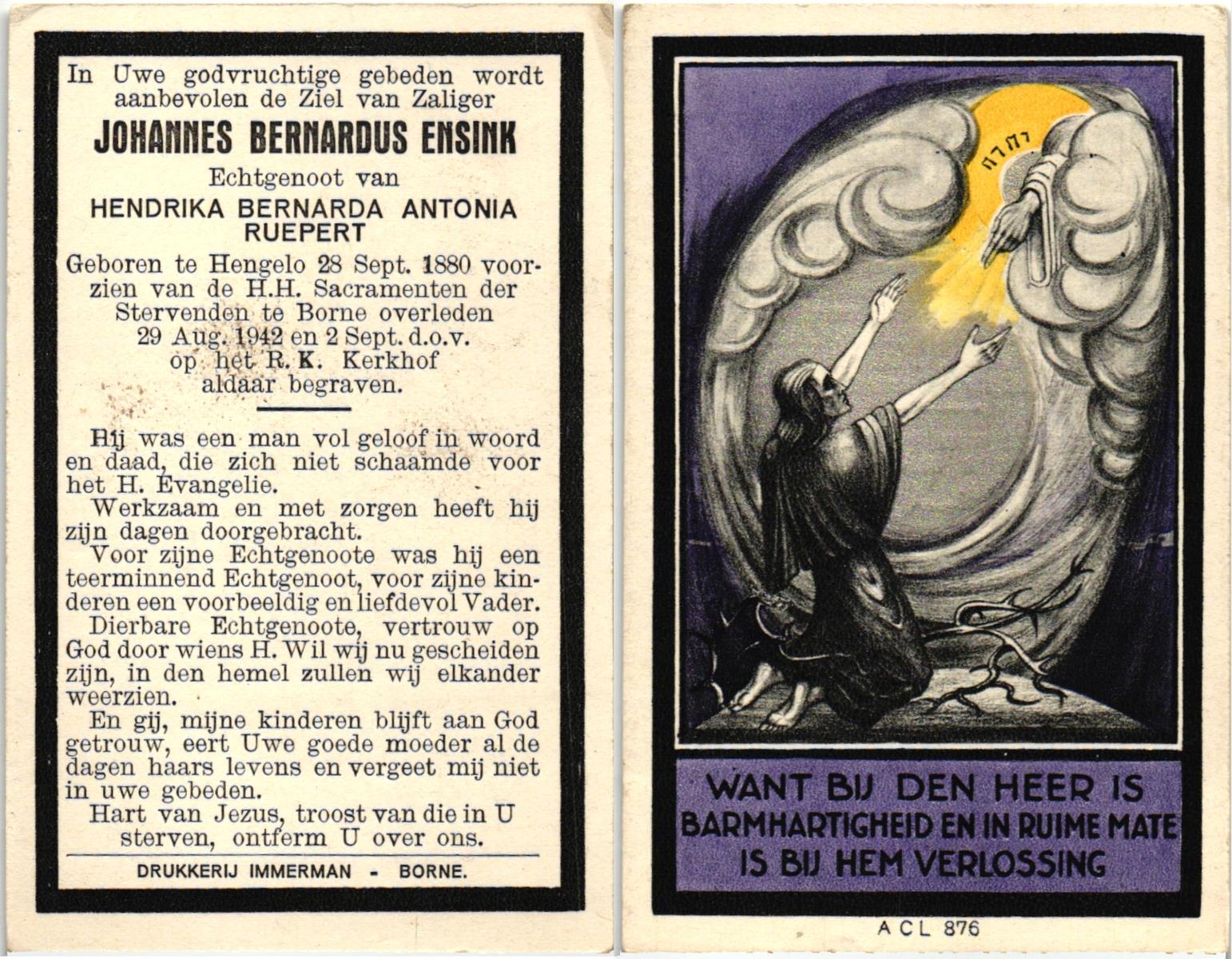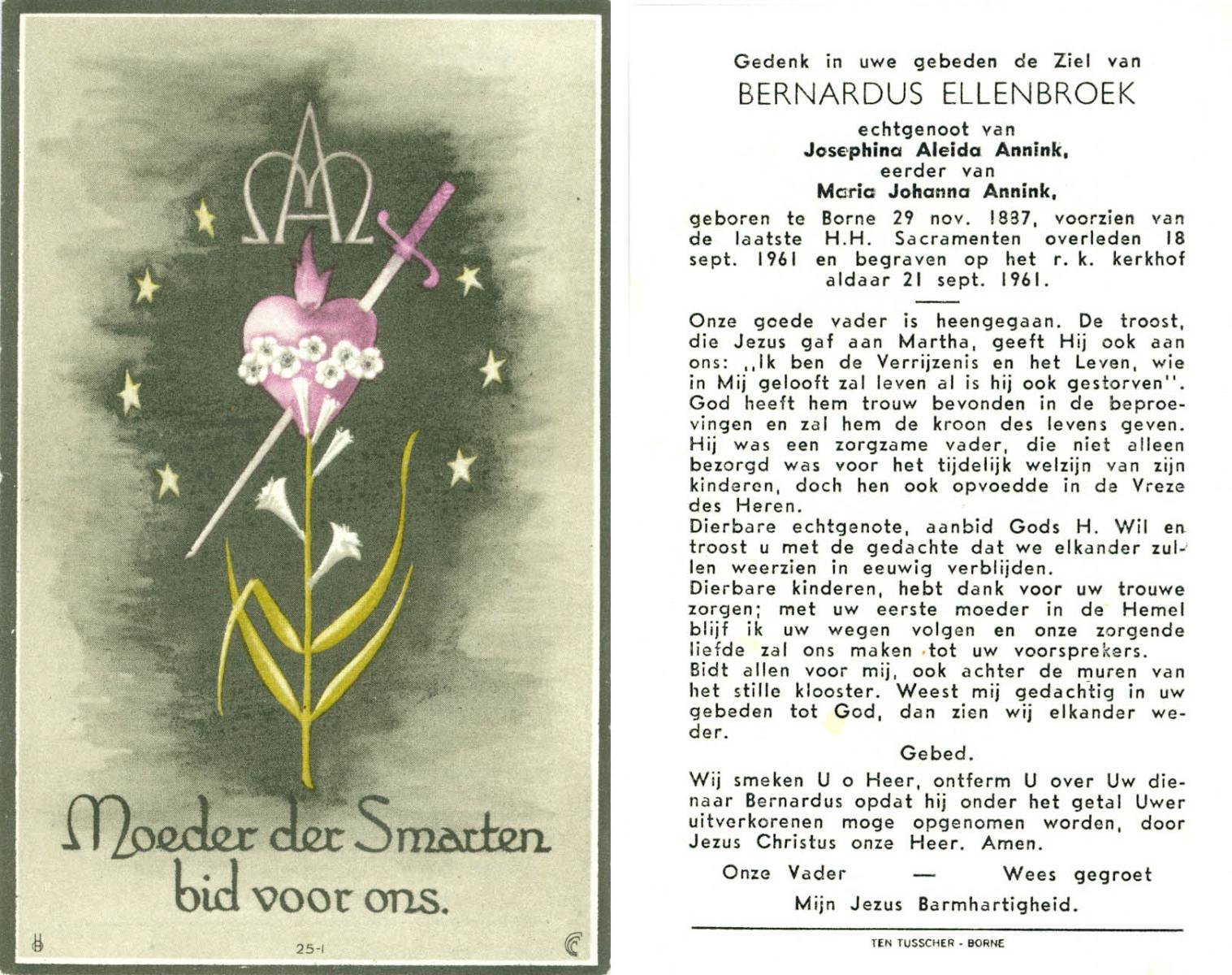 ELLENBROEK, Bernardus, geboren op 29-11-1887 te Borne, overleden op 18-9-1961 op 73-jarige leeftijd, begraven op 21-9-1961 te Borne.