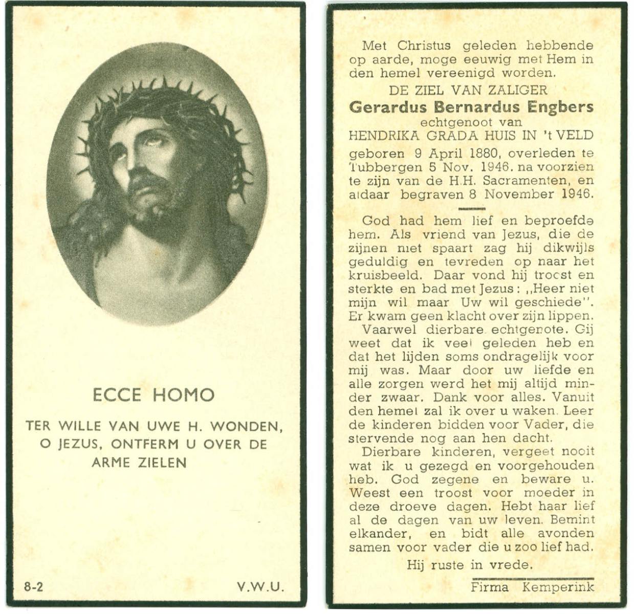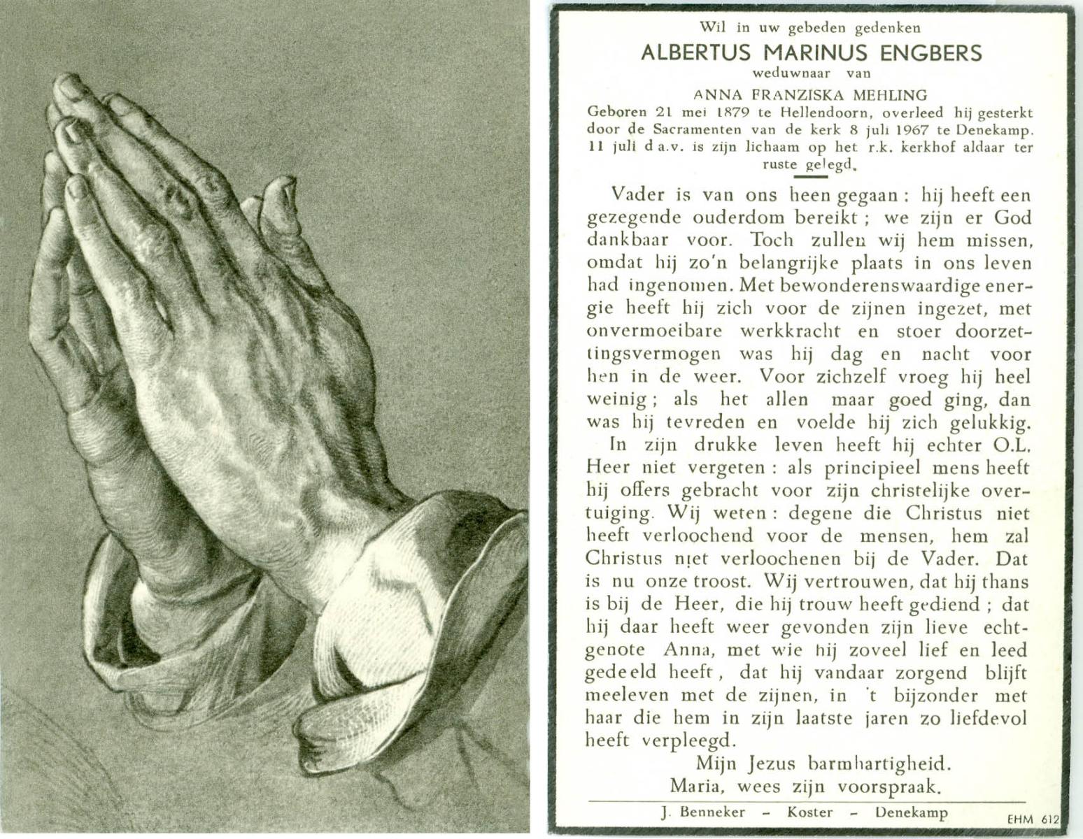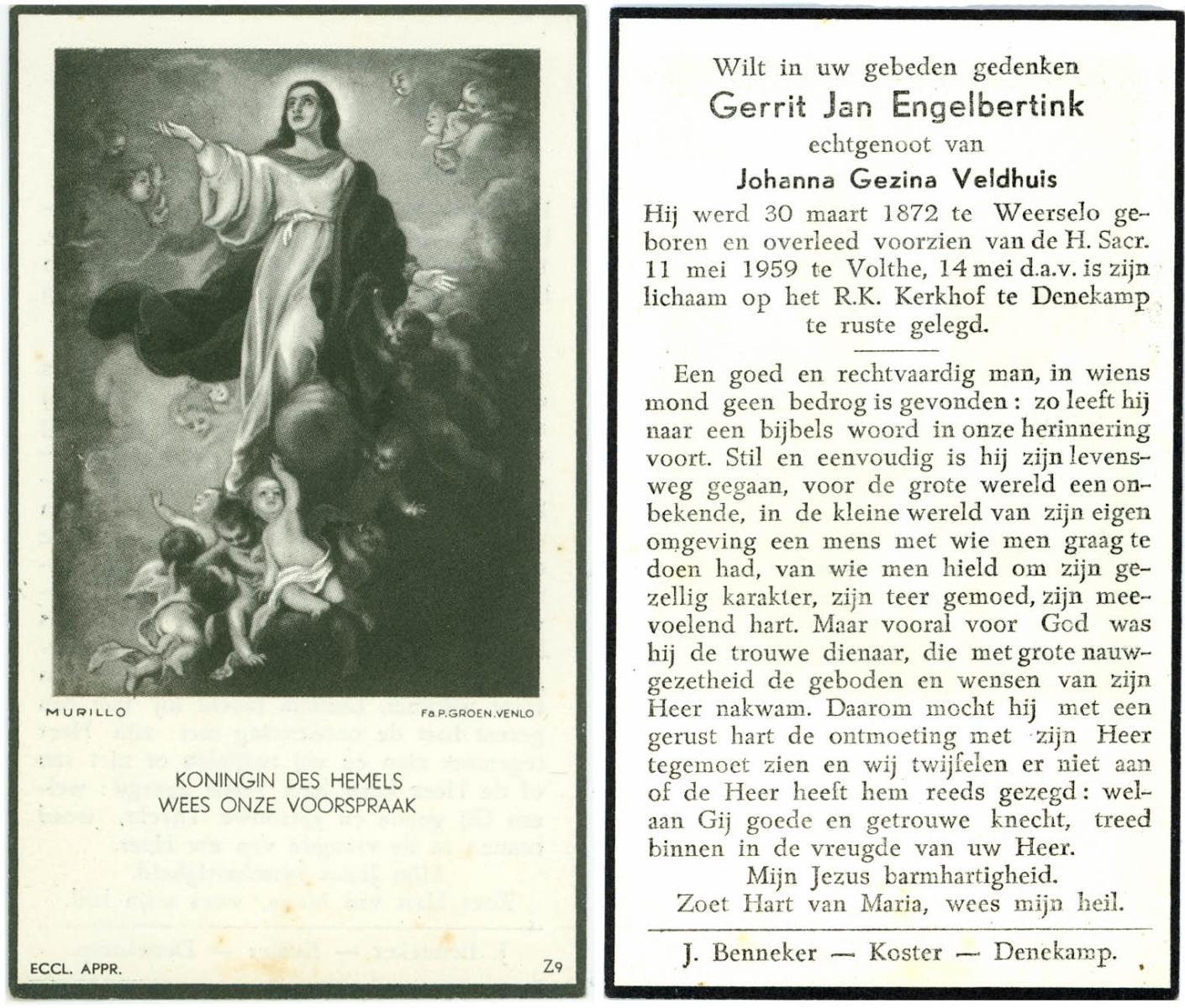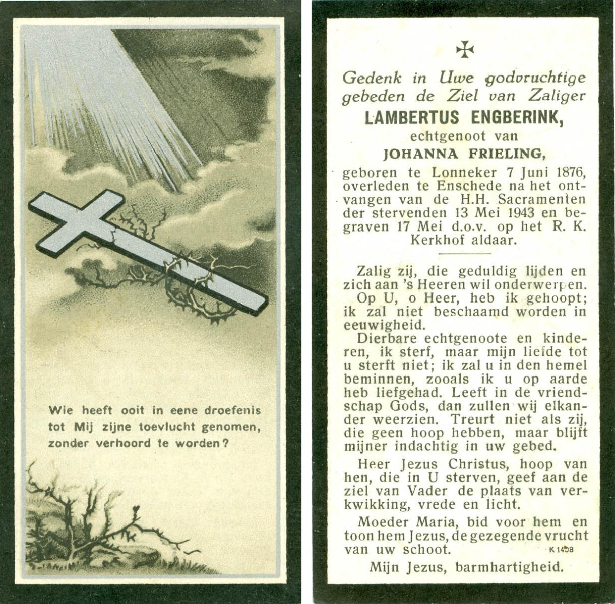 ELLENBROEK, Bernardus, geboren op 29-11-1887 te Borne, overleden op 18-9-1961 op 73-jarige leeftijd, begraven op 21-9-1961 te Borne.