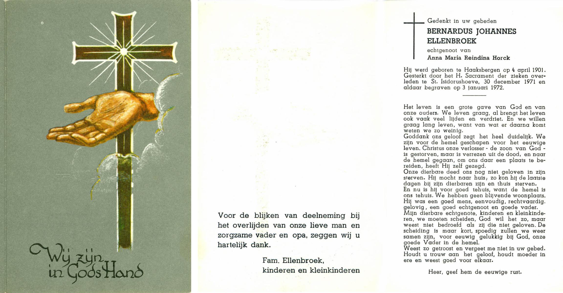 ELLENBROEK, Bernardus Johannes, geboren op 4-4-1901 te Haaksbergen, overleden op 30-12-1971 te St. Isidorushoeve op 70-jarige leeftijd, begraven op 3-1-1972 te St. Isidorushoeve.