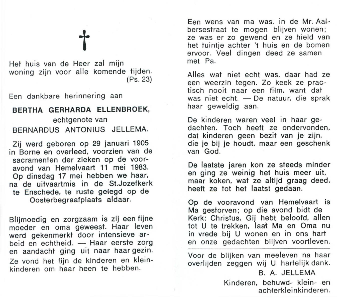 ELLENBROEK, Bertha Gerharda, geboren op 29-1-1905 te Borne, overleden op 11-5-1983 op 78-jarige leeftijd, begraven op 17-5-1983 te Enschede.