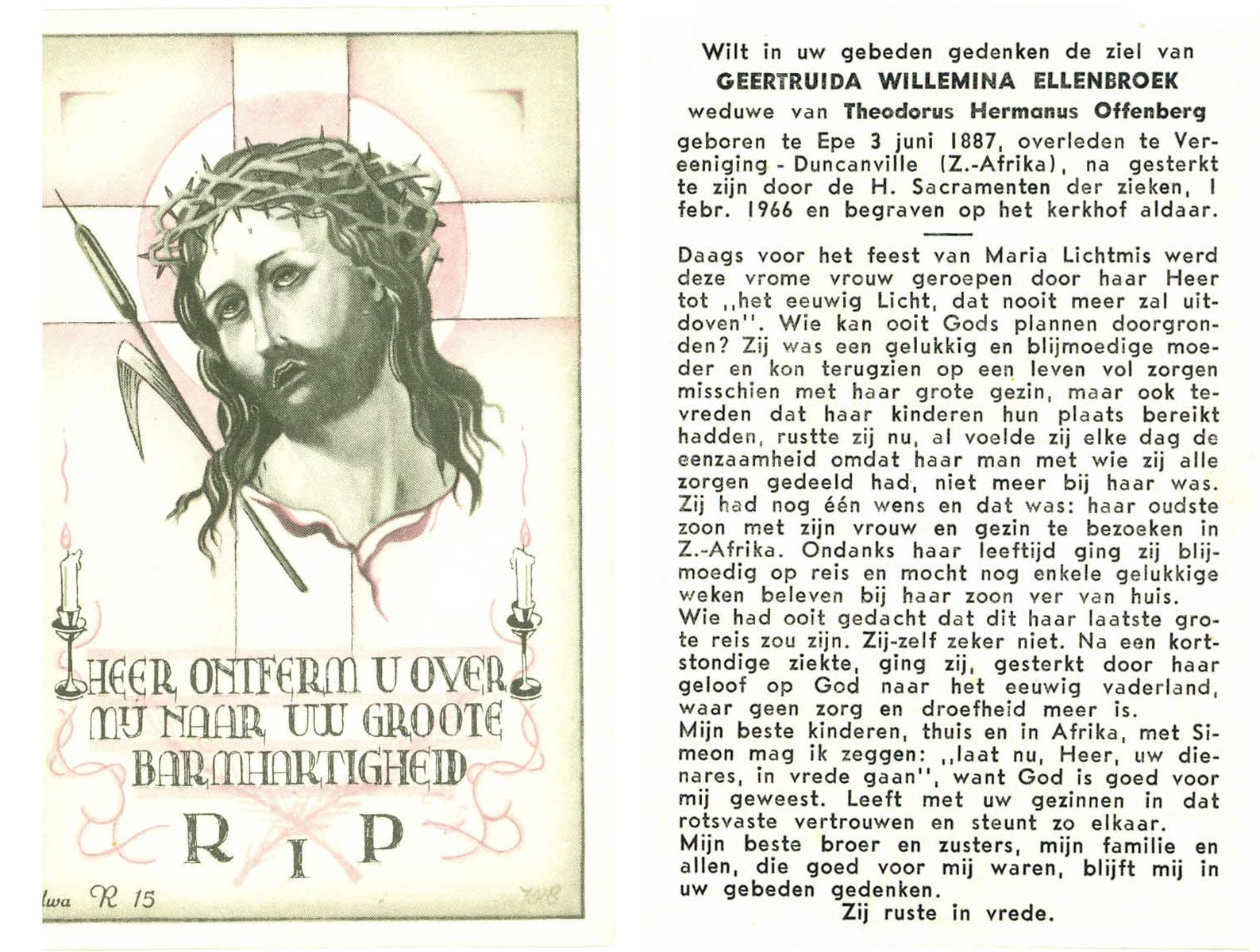 ELLENBROEK, Geertruida Willemina, geboren op 03-06-1887 te Epe (Dld), overleden op 1-2-1966 te Vereeniging-Duncanville, Zuid Afrika op 77-jarige leeftijd, begraven te Zuid Afrika.